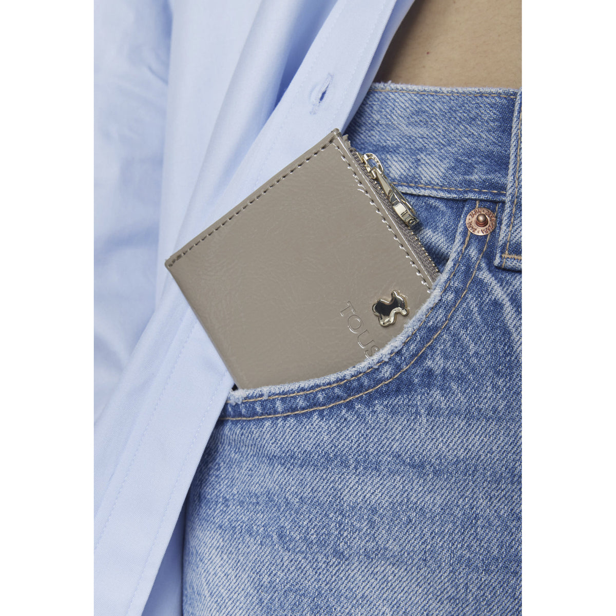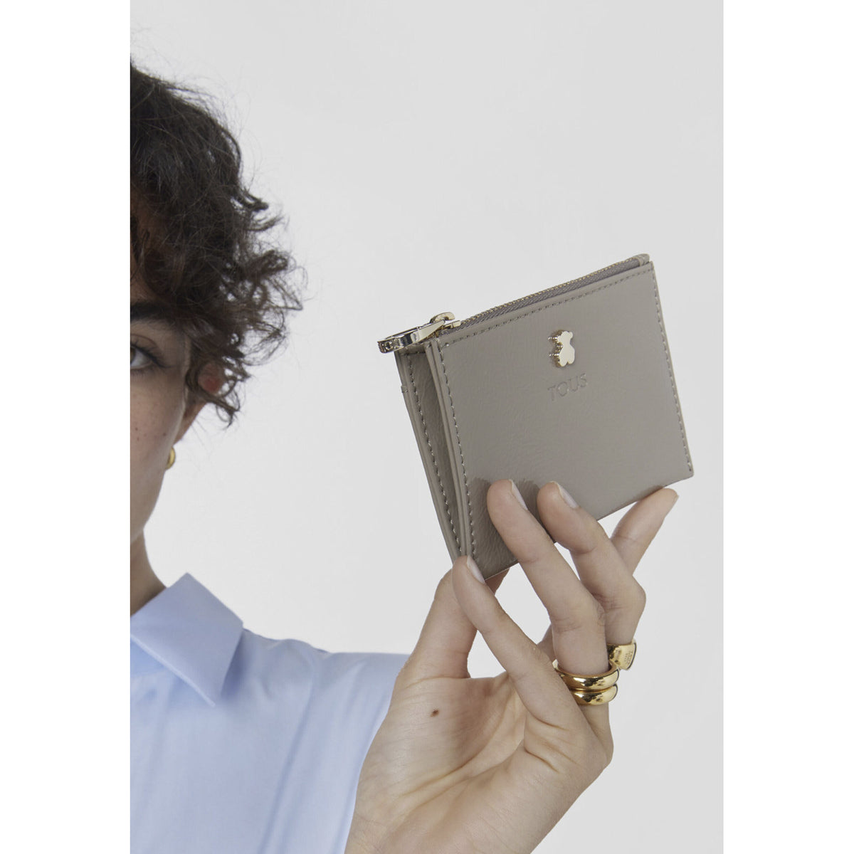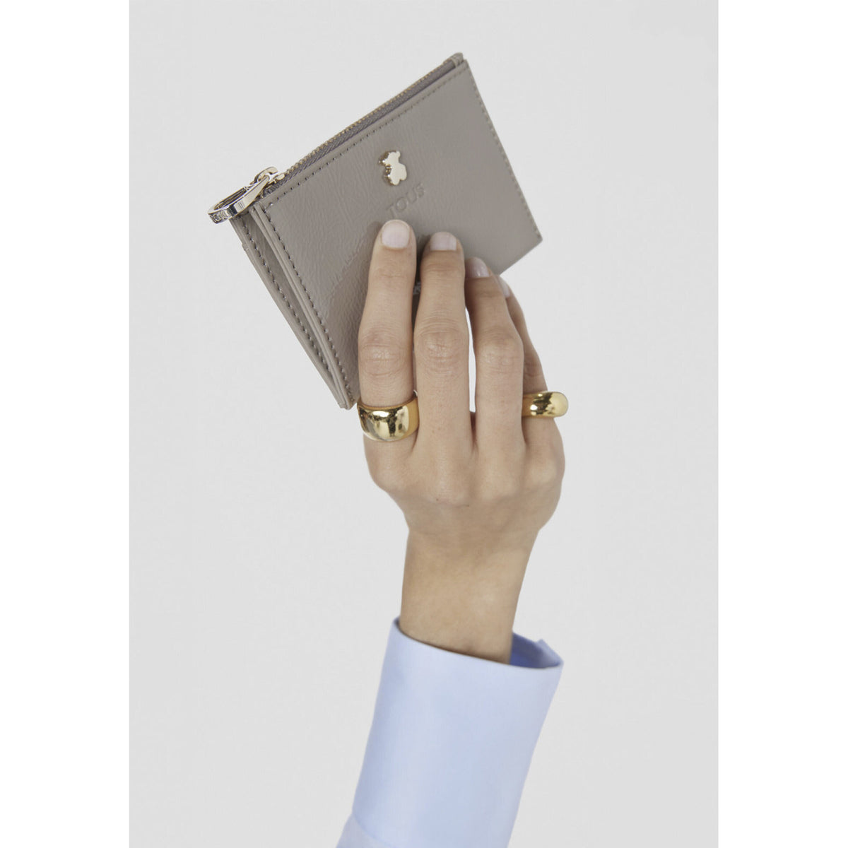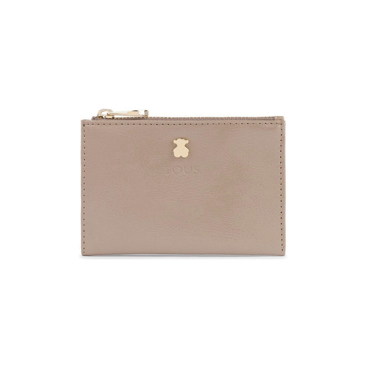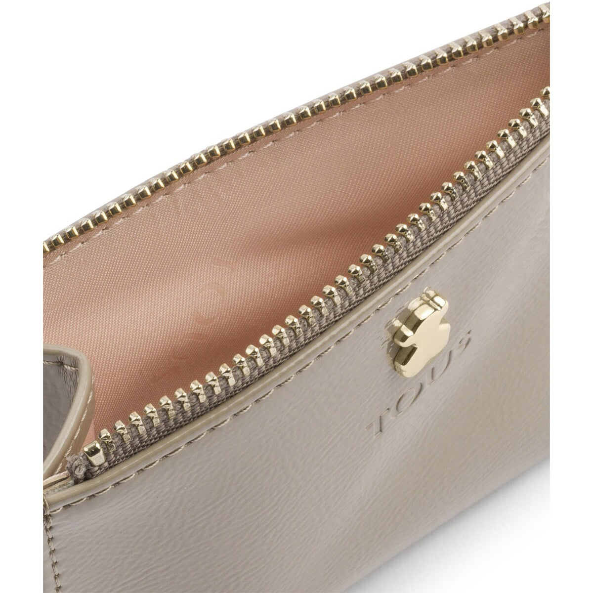 Porta-moedas médio TOUS coleção Dorp em vinil efeito de pele com acabamento envernizado na cor toupeira. Com fecho de correr. Apliques personalizados em tom dourado pálido. Três compartimentos e dois bolsos planos. Medidas: 8 cm x 10,5 cm x 2,5 cm.