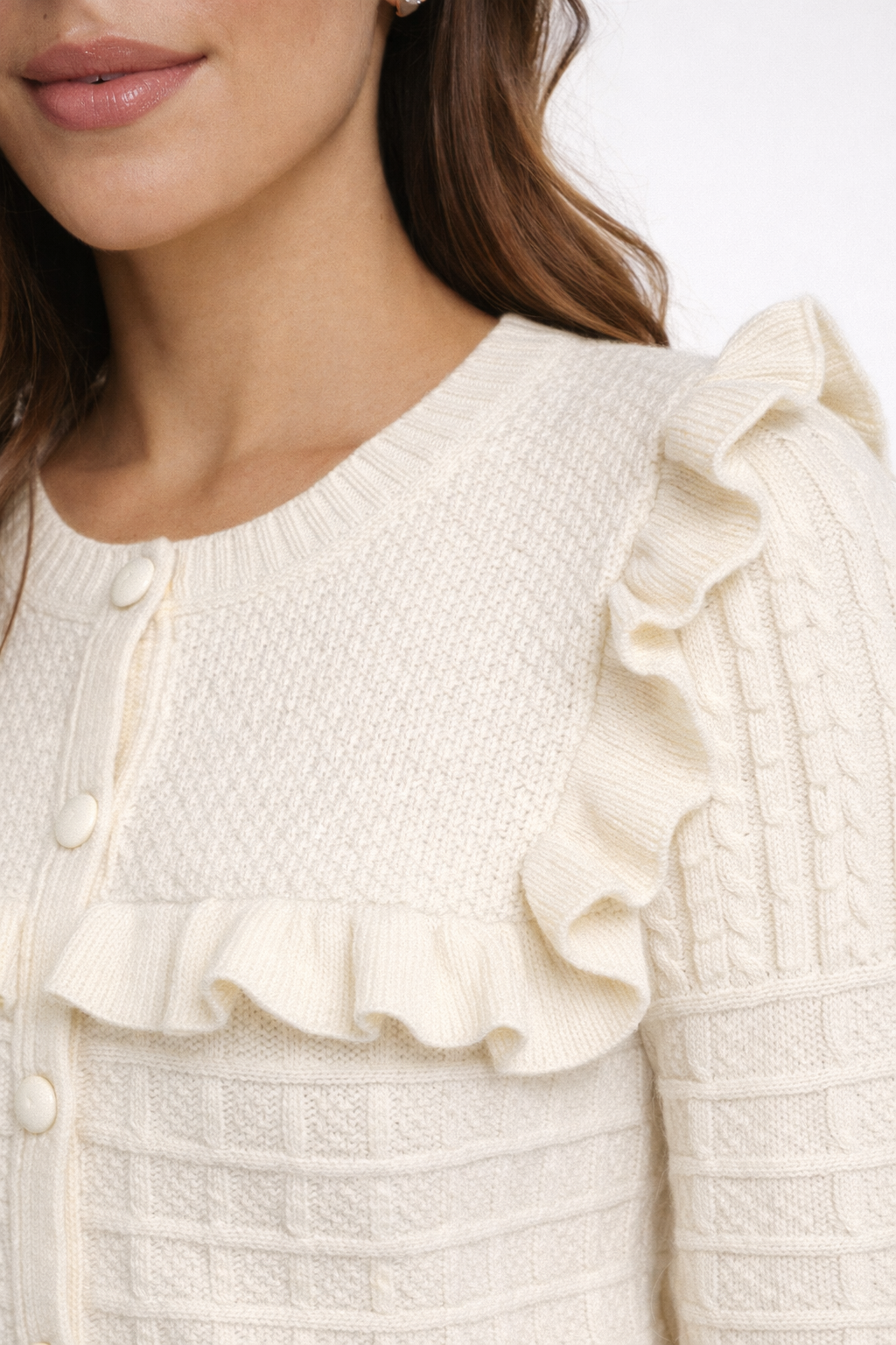 Casaco de malha com detalhes românticos que elevam o guarda-roupa essencial. O folho na manga adiciona um toque de refinamento e feminilidade, transformando uma peça básica numa declaração de estilo. Confeccionado em malha de qualidade, oferece conforto e durabilidade para uso frequente. Uma escolha inteligente para quem valoriza peças versáteis com carácter distintivo.