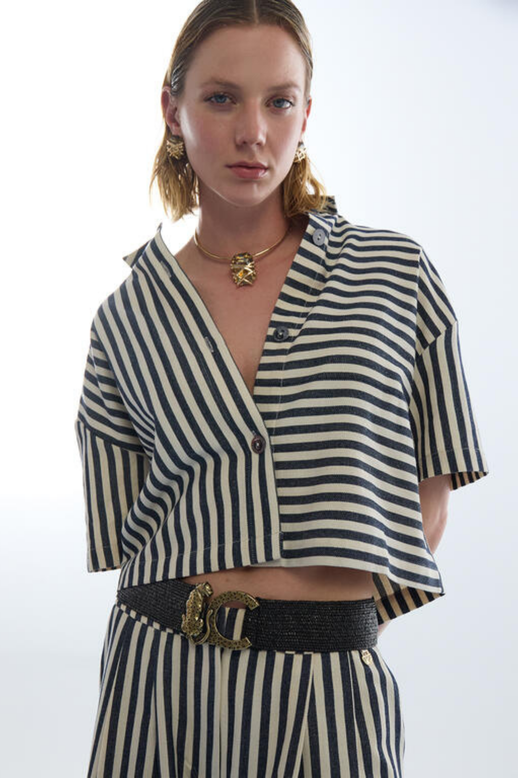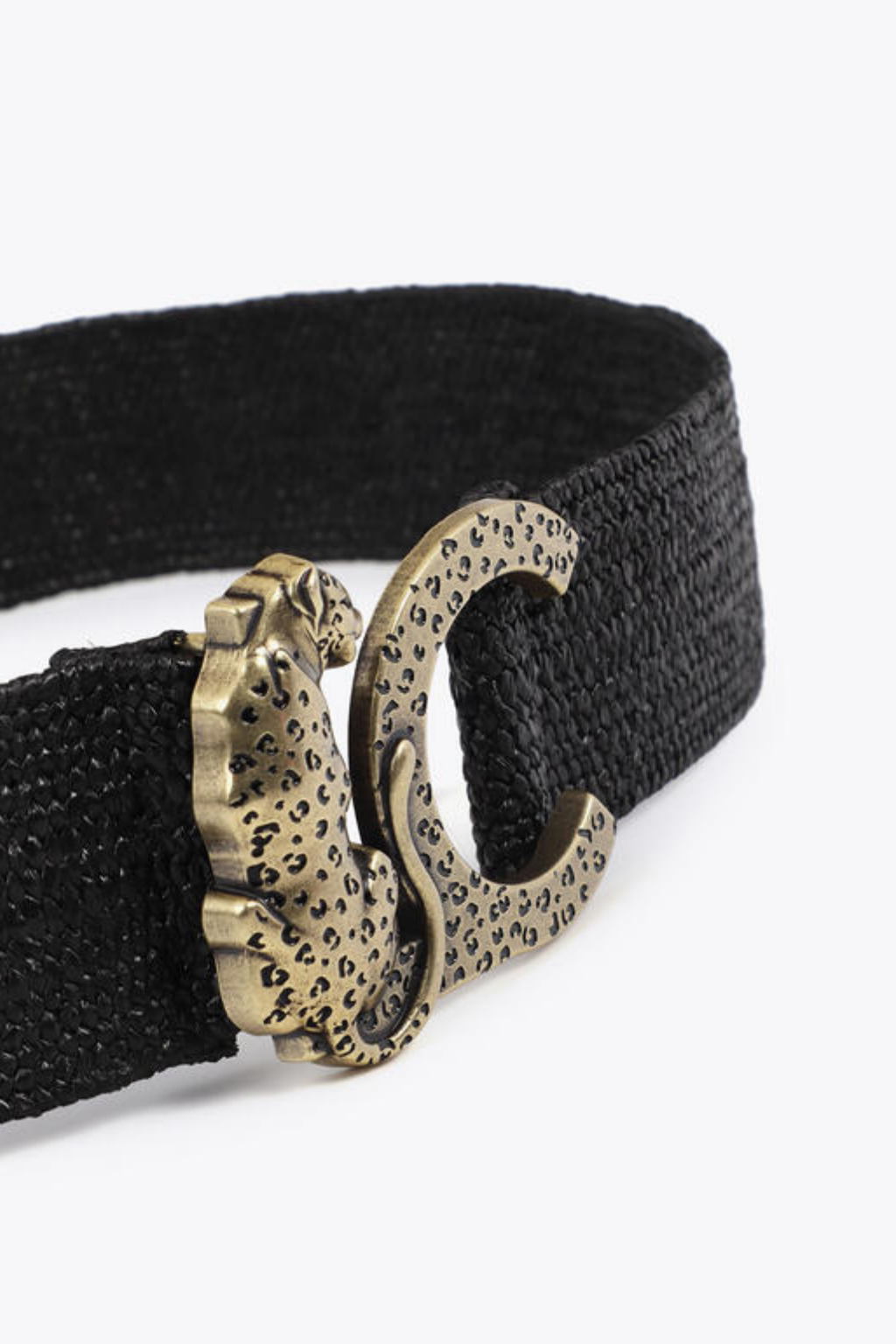Cinto de ráfia elástico com fivela de logotipo animal distintivo. Feito de material flexível que se adapta confortavelmente à cintura. Perfeito para complementar qualquer look casual ou formal com um toque único.
