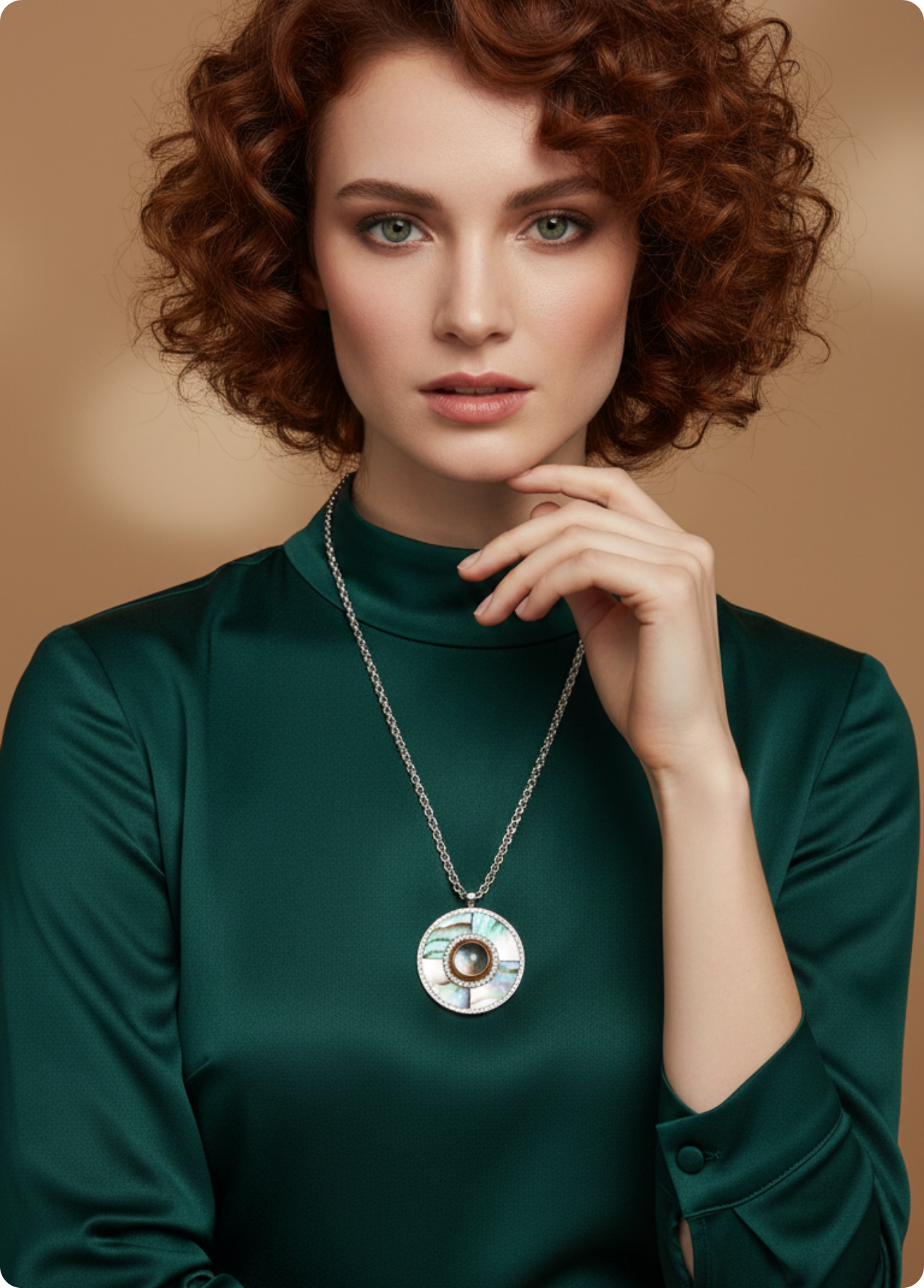 Um colar marcante e cheio de elegância, este modelo em aço inoxidável apresenta um pendente redondo em estilo mandala, trabalhado com detalhes em madre-pérola que refletem luz e cor de forma única.
