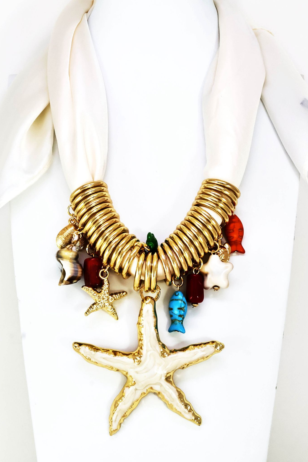 Colar elegante com lenço integrado e pendentes delicados inspirados nos motivos do mar. Perfeito para adicionar um toque sofisticado e temático ao seu guarda-roupa. Os detalhes marinhos conferem um estilo único e versátil, ideal para ocasiões especiais ou uso diário. Uma peça que combina acessório e decoração, trazendo a essência do oceano ao seu look.