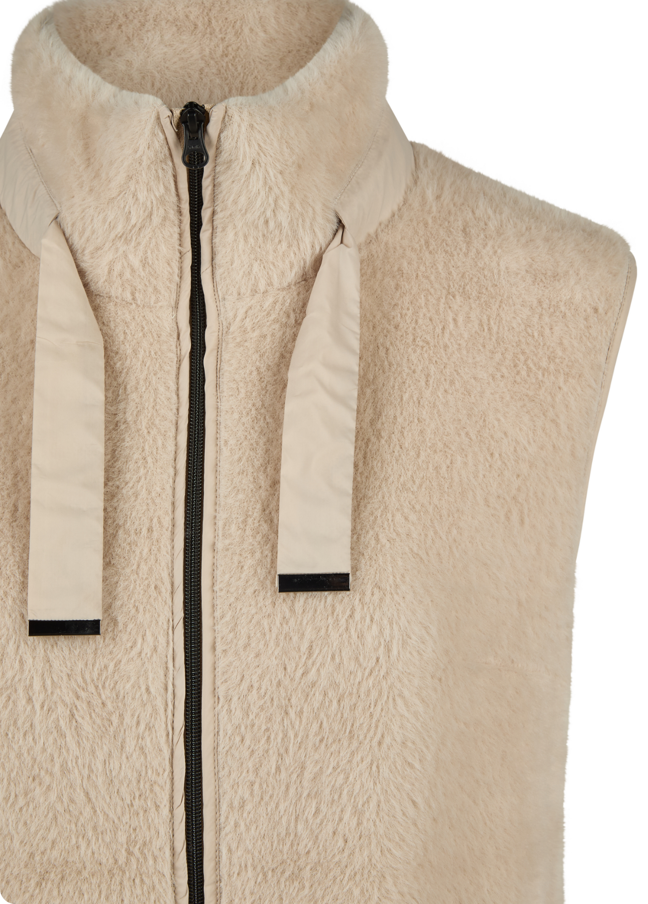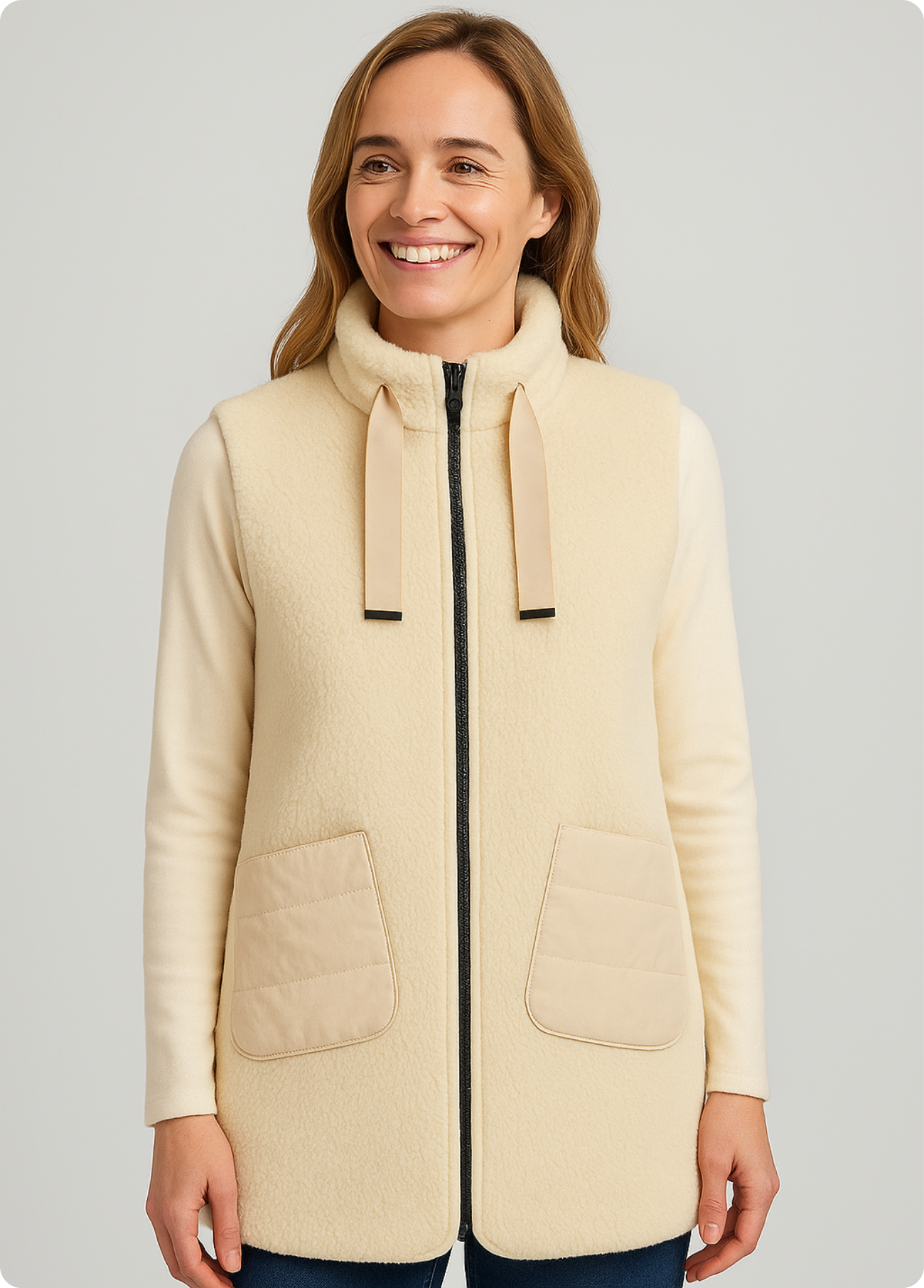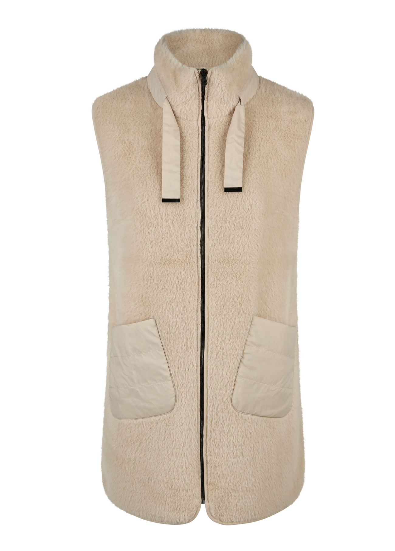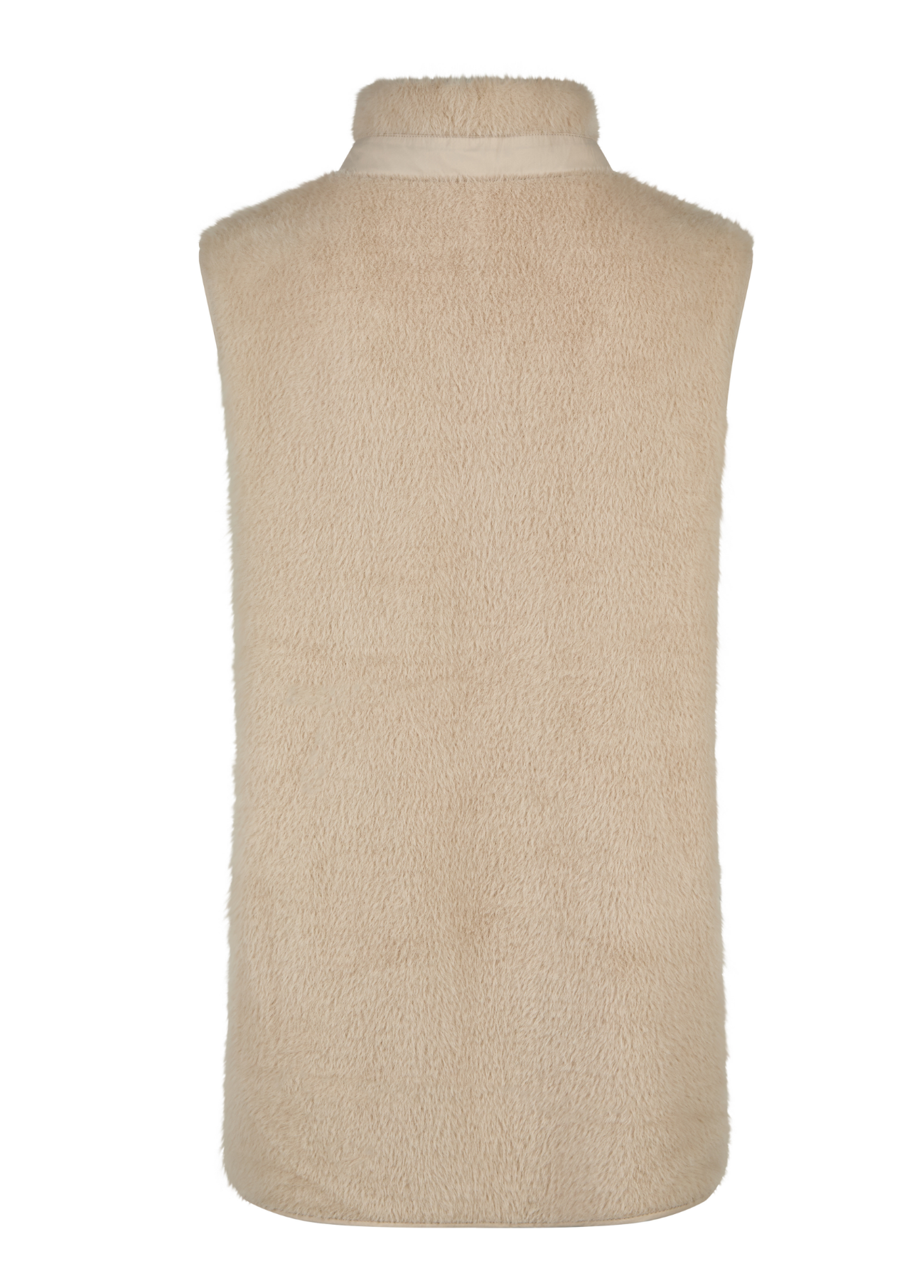 Colete em pelo sintético bege, com fecho frontal e gola alta, perfeito para dar um toque de conforto e sofisticação aos dias frios. Os bolsos frontais em tecido técnico conferem um detalhe moderno e funcional, enquanto o corte reto garante elegância e versatilidade. Ideal para sobrepor a camisas ou malhas finas, este colete é uma peça essencial para um look casual-chique, com o toque premium característico da Aliby.