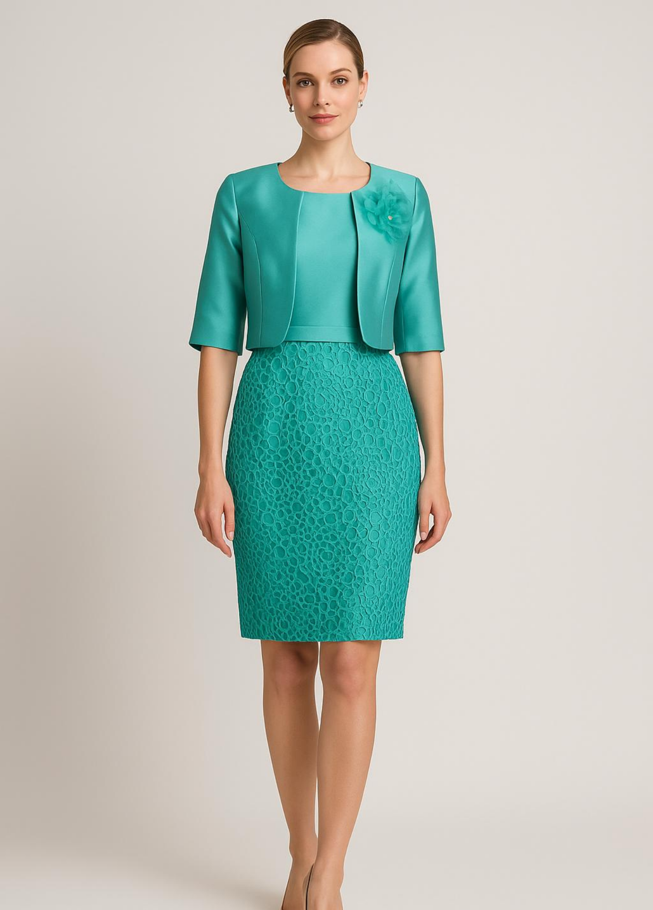 Este conjunto sofisticado em verde esmeralda combina um vestido lápis com saia em renda texturada e um casaco curto em cetim com manga a meio braço. O detalhe da flor aplicada na lapela acrescenta um toque delicado e feminino. Ideal para cerimónias e eventos especiais, garante elegância e presença marcante.