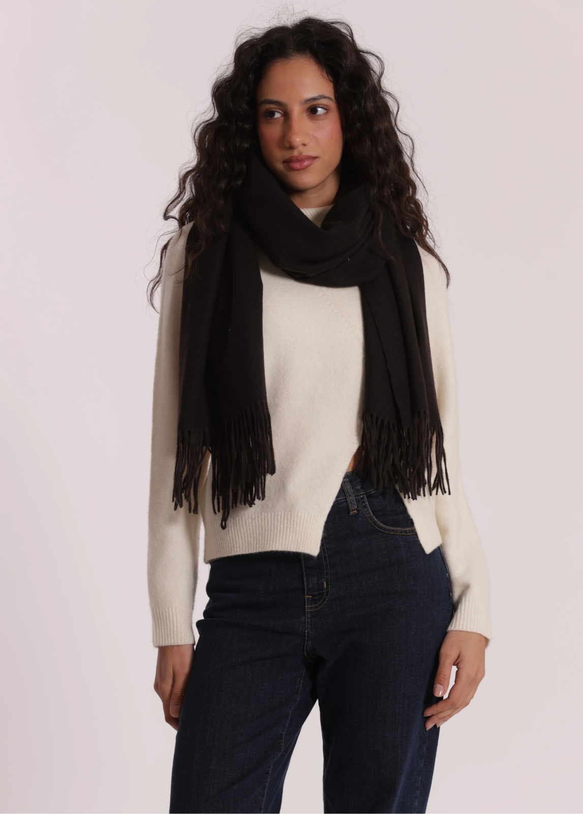 Cachecol liso de toque suave e aconchegante, disponível em cores clássicas e versáteis. Confeccionado em tecido macio, oferece conforto térmico ideal para os dias frios. O acabamento com franjas acrescenta um detalhe elegante e discreto, tornando este cachecol um essencial de inverno fácil de combinar com casacos, malhas ou looks mais formais e casuais.