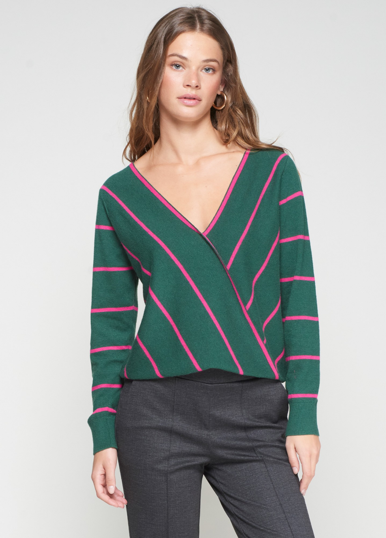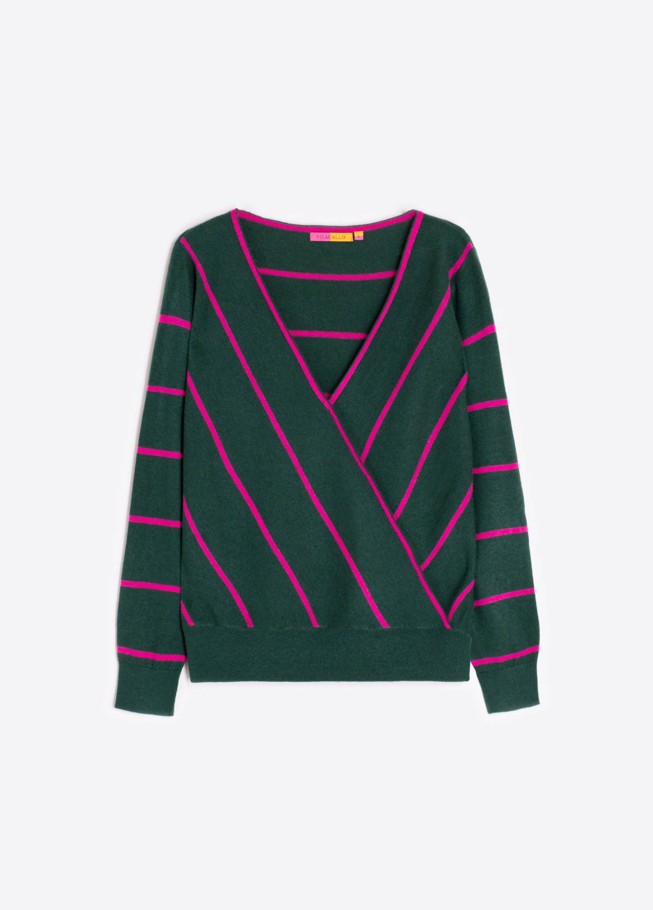 Suéter verde em malha macia com listras diagonais e horizontais em fúcsia. Decote em V cruzado na frente e mangas compridas com acabamento em punhos canelados. Corte reto com bainha ajustada. Estrutura leve e toque macio. Visual ousado e geométrico.