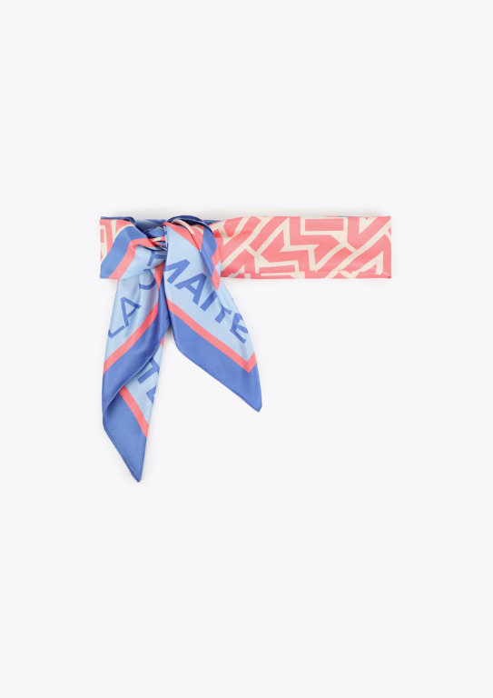 Lenço em tecido de cetim, elegante e suave ao toque. Apresenta um design exclusivo de monograma com tons vibrantes de azul e rosa. Ideal para elevar qualquer look, pode ser usado no pescoço, como acessório de bolsa ou no pulso.