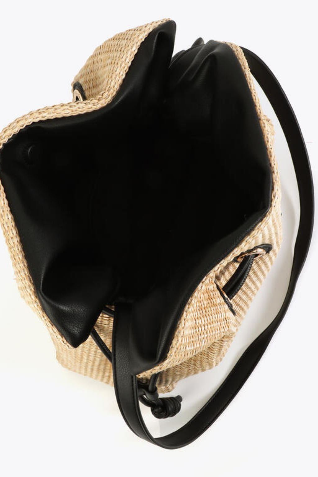 Mala bucket em ráfia com fecho em cordão e detalhes em contraste, combinando estilo natural com um toque moderno. Leve e versátil, é perfeita para completar looks de verão com elegância e praticidade.