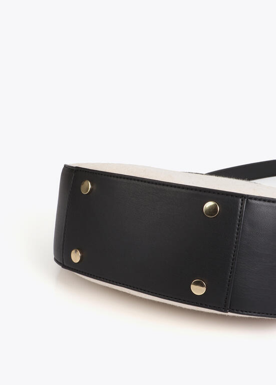 Este elegante hobo bag apresenta um design bicolor em couro sintético e tela. Inclui uma alça trançada e detalhes dourados que oferecem sofisticação. Ideal para o dia a dia, com fecho de zíper e espaço interno amplo.