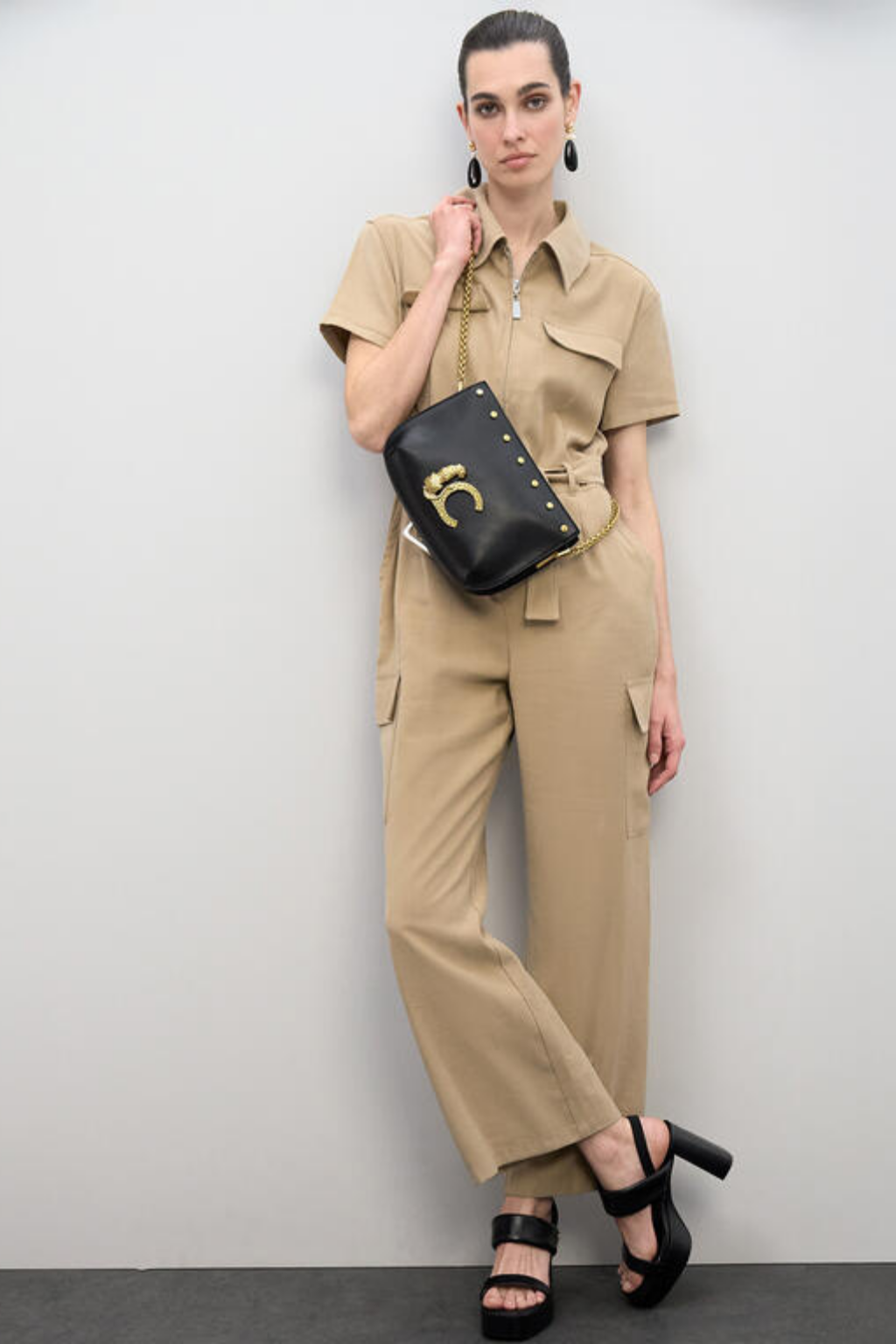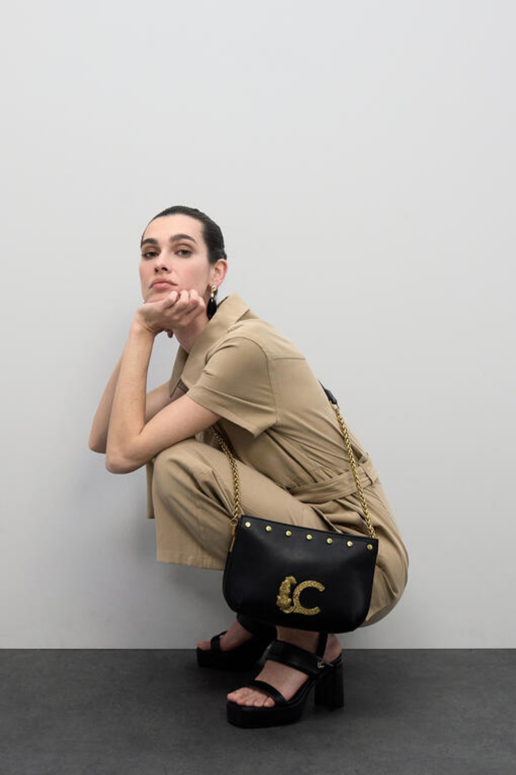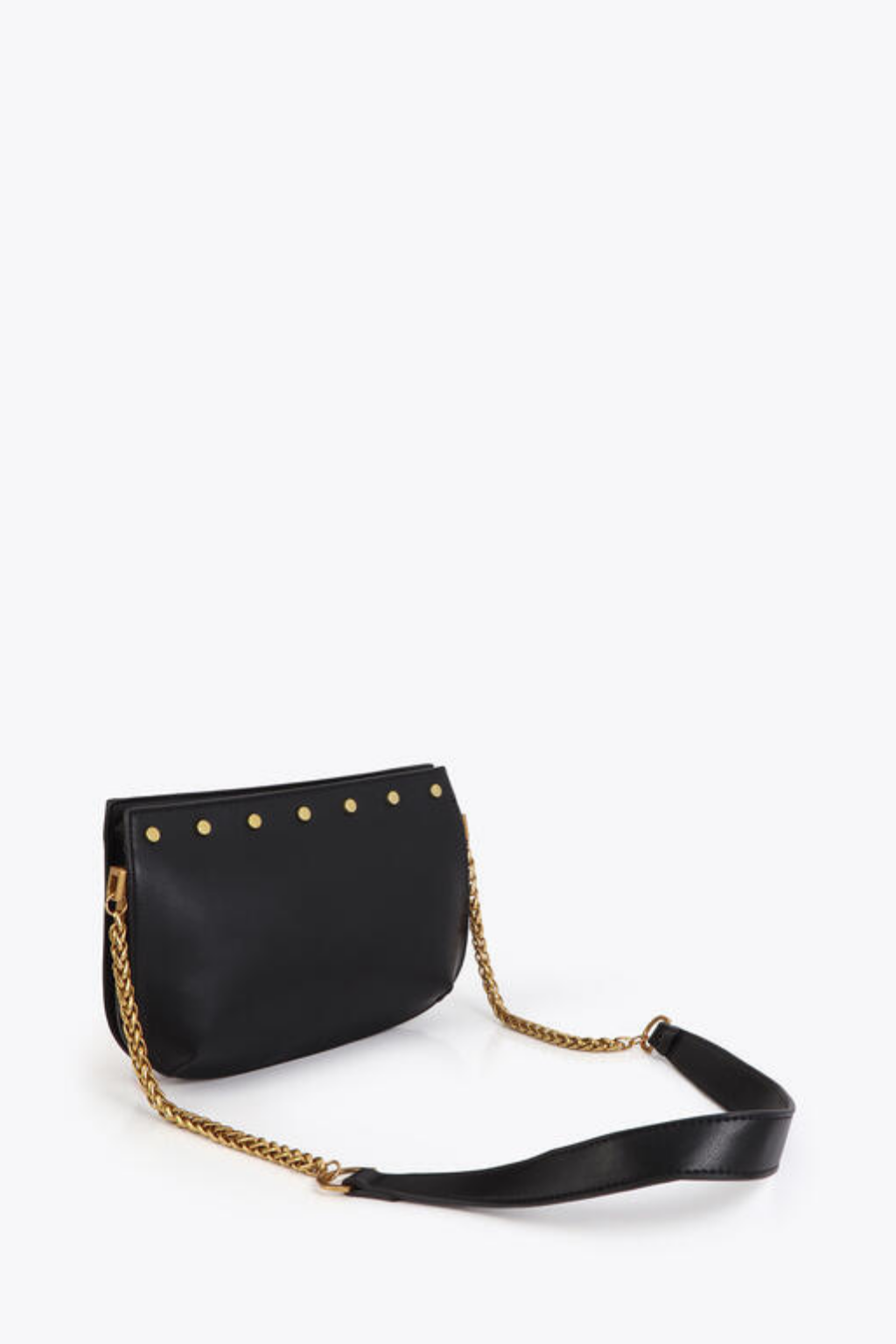 Bolsa tiracolo elegante em couro sintético preto com logo dourado e detalhes de tachas. Alça de corrente ajustável em dourado para um toque de sofisticação. Interior forrado com divisórias para máxima organização. Um acessório indispensável para dar um toque chique e moderno ao seu look diário. Fecho superior com zíper.