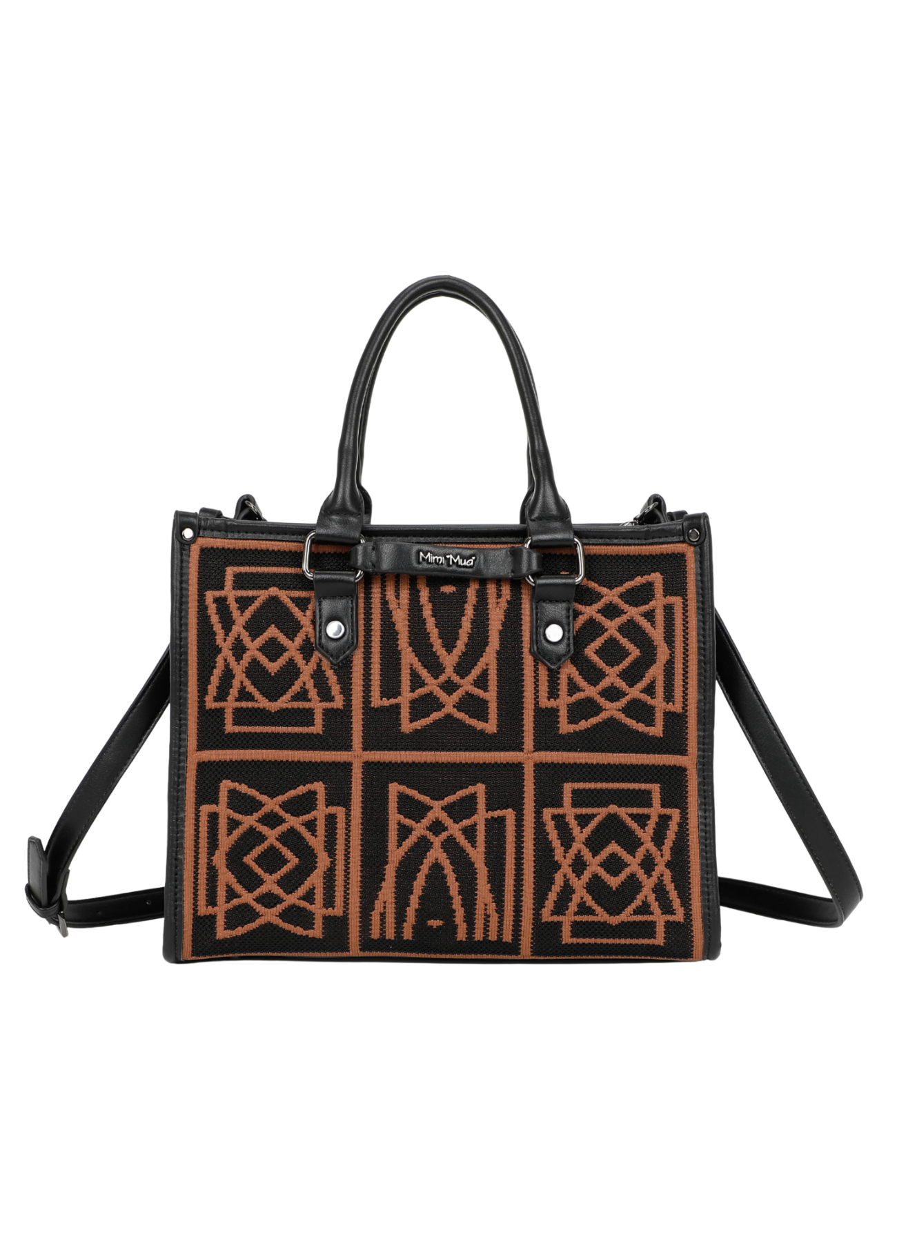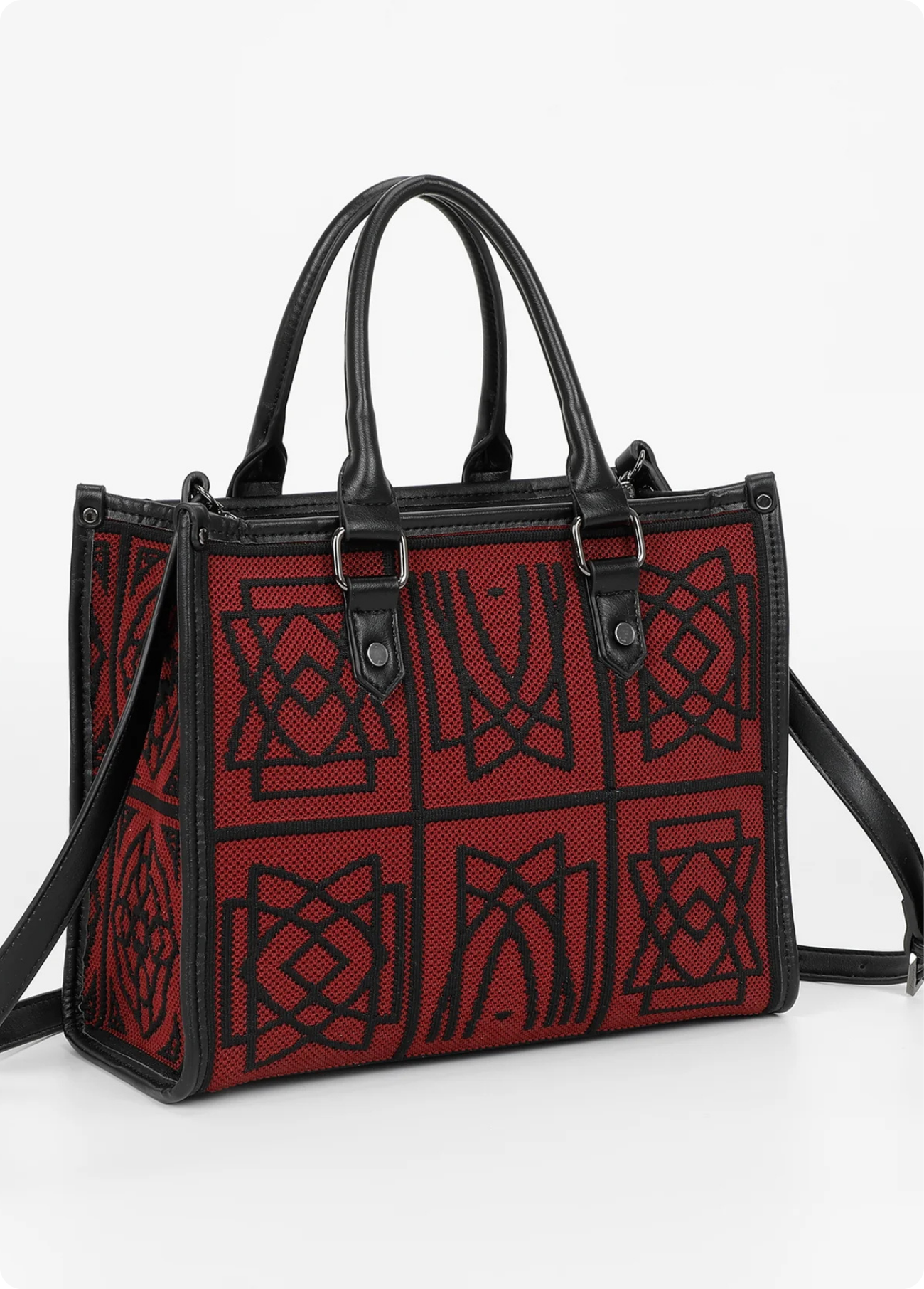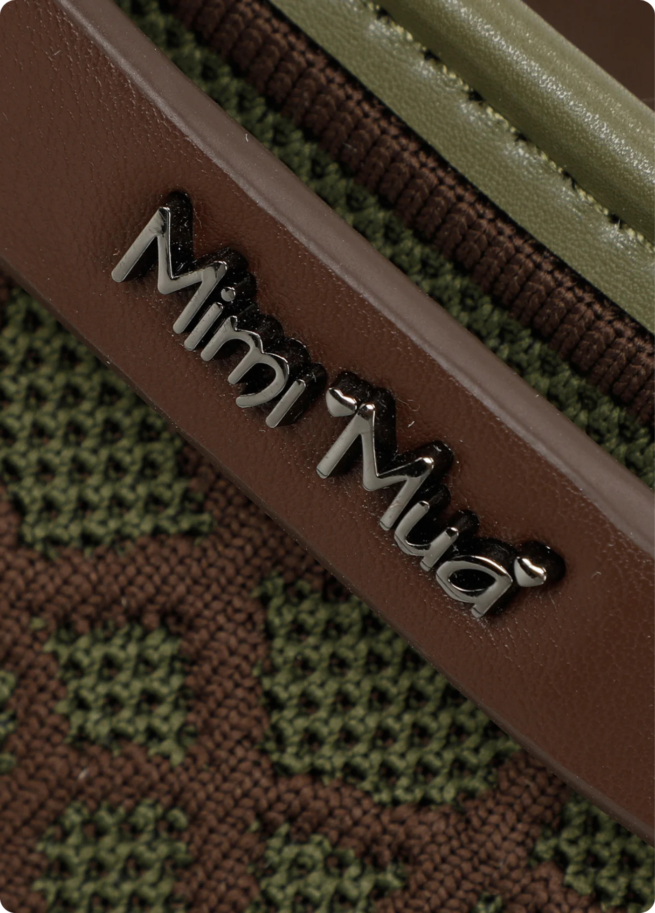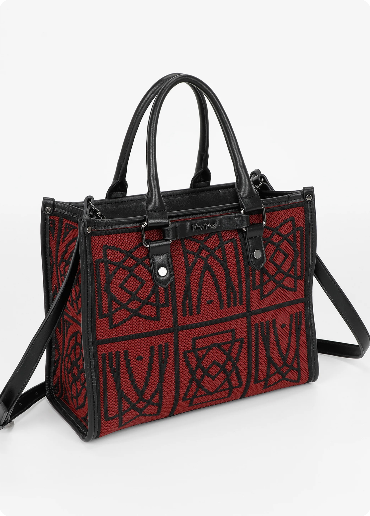 Mala estruturada Mimi Mua com design geométrico em relevo e acabamento sofisticado. Disponível em três versões elegantes — vermelho com preto, verde com castanho e preto com camel — esta mala alia modernidade e praticidade.