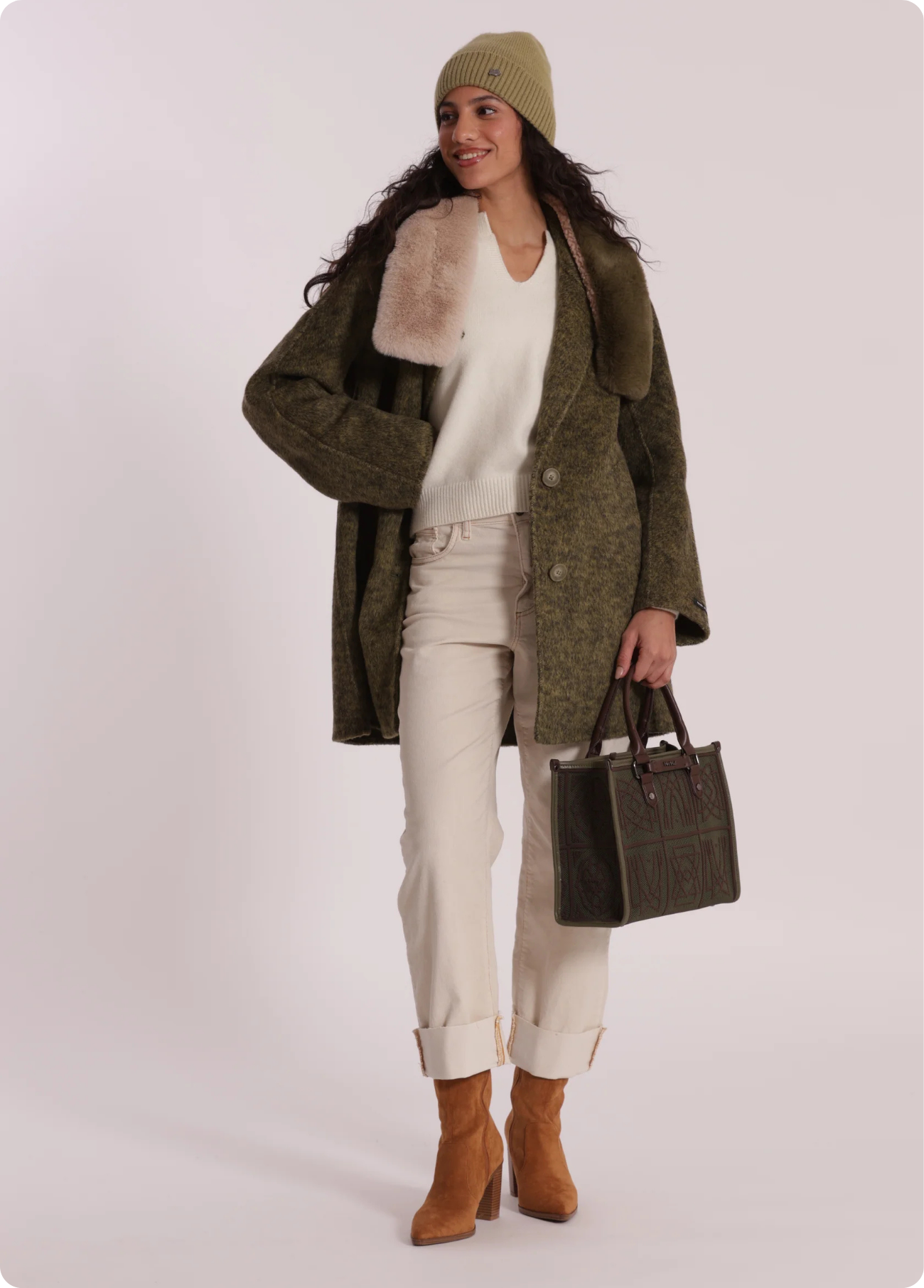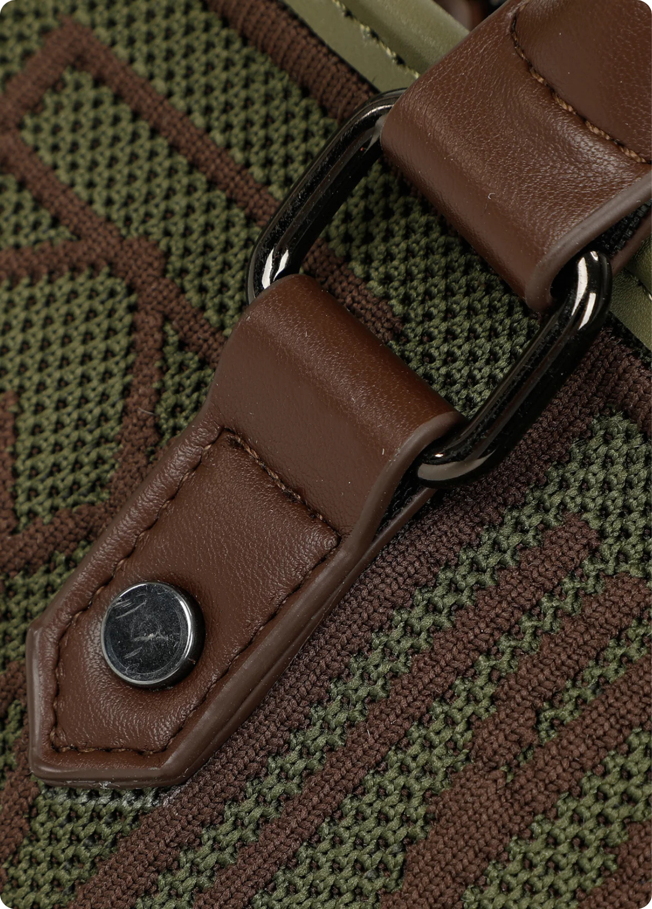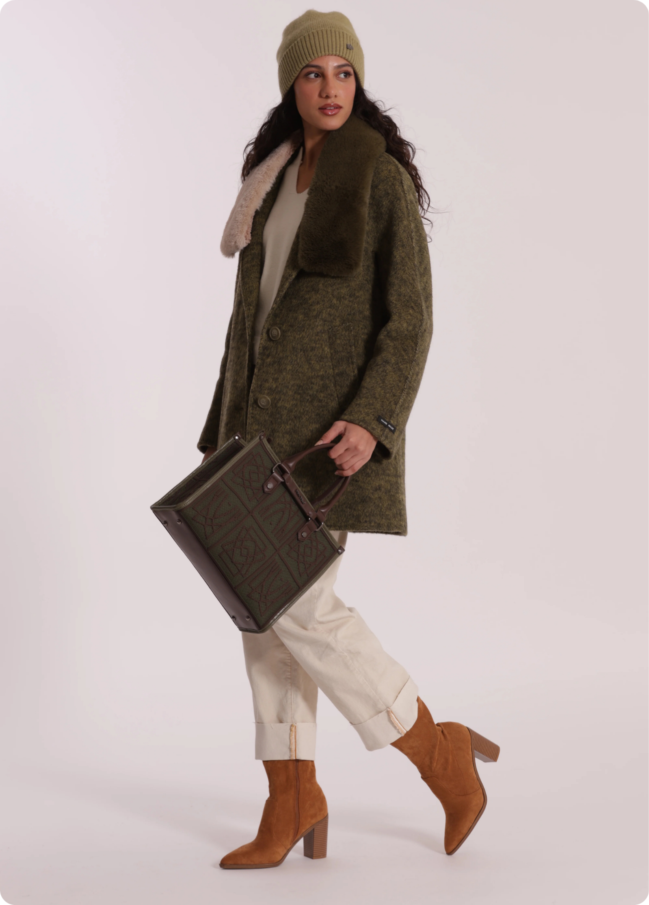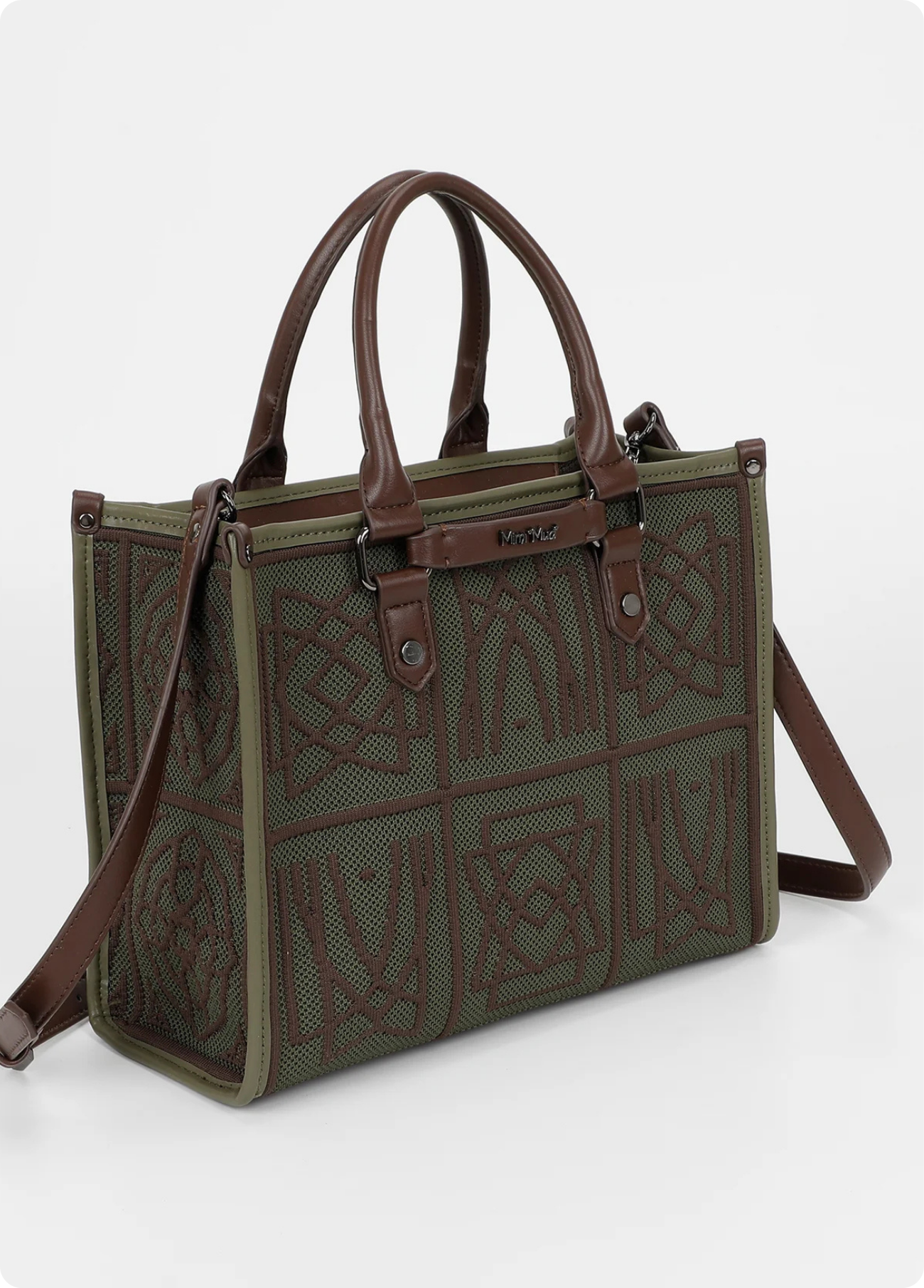 Mala estruturada Mimi Mua com design geométrico em relevo e acabamento sofisticado. Disponível em três versões elegantes — vermelho com preto, verde com castanho e preto com camel — esta mala alia modernidade e praticidade.