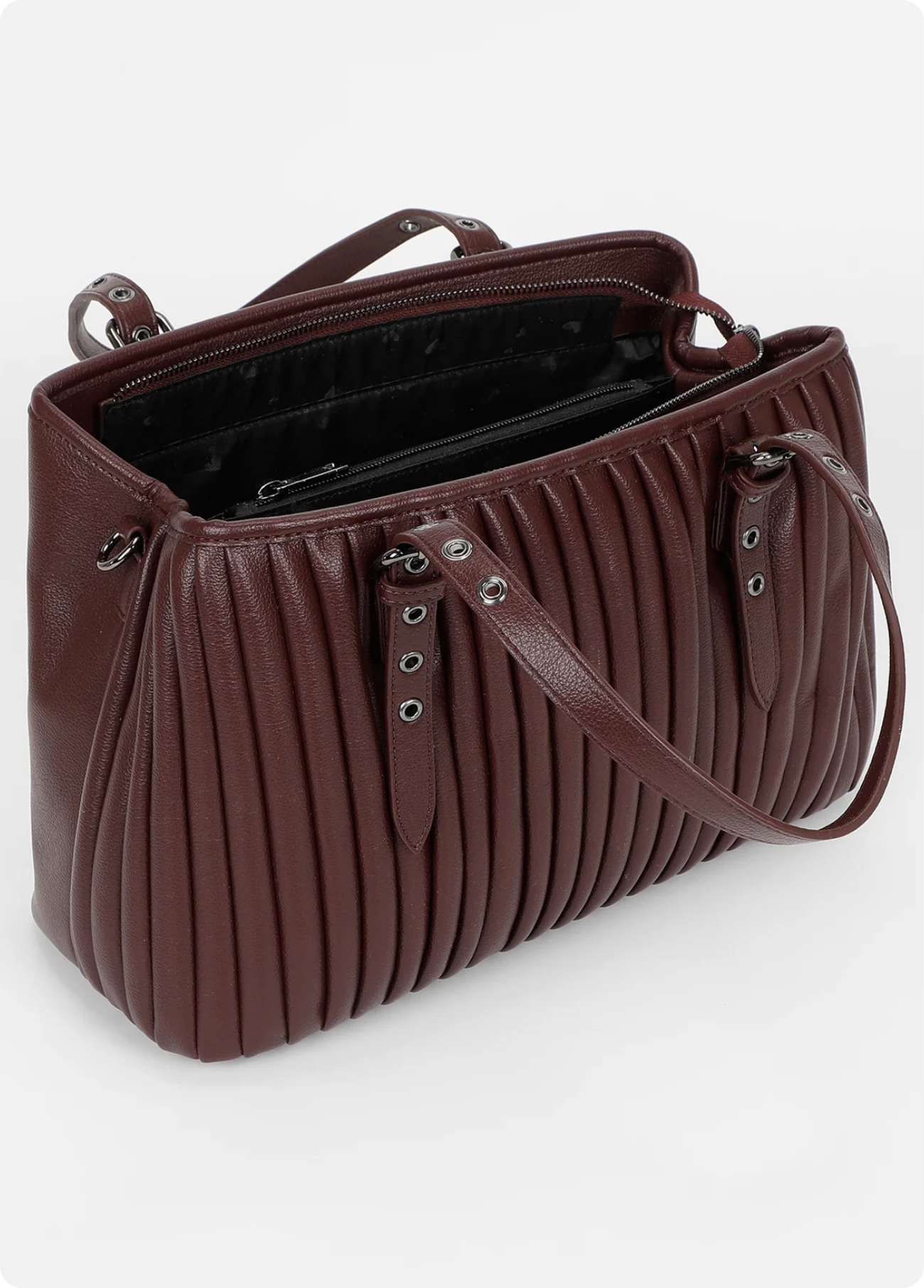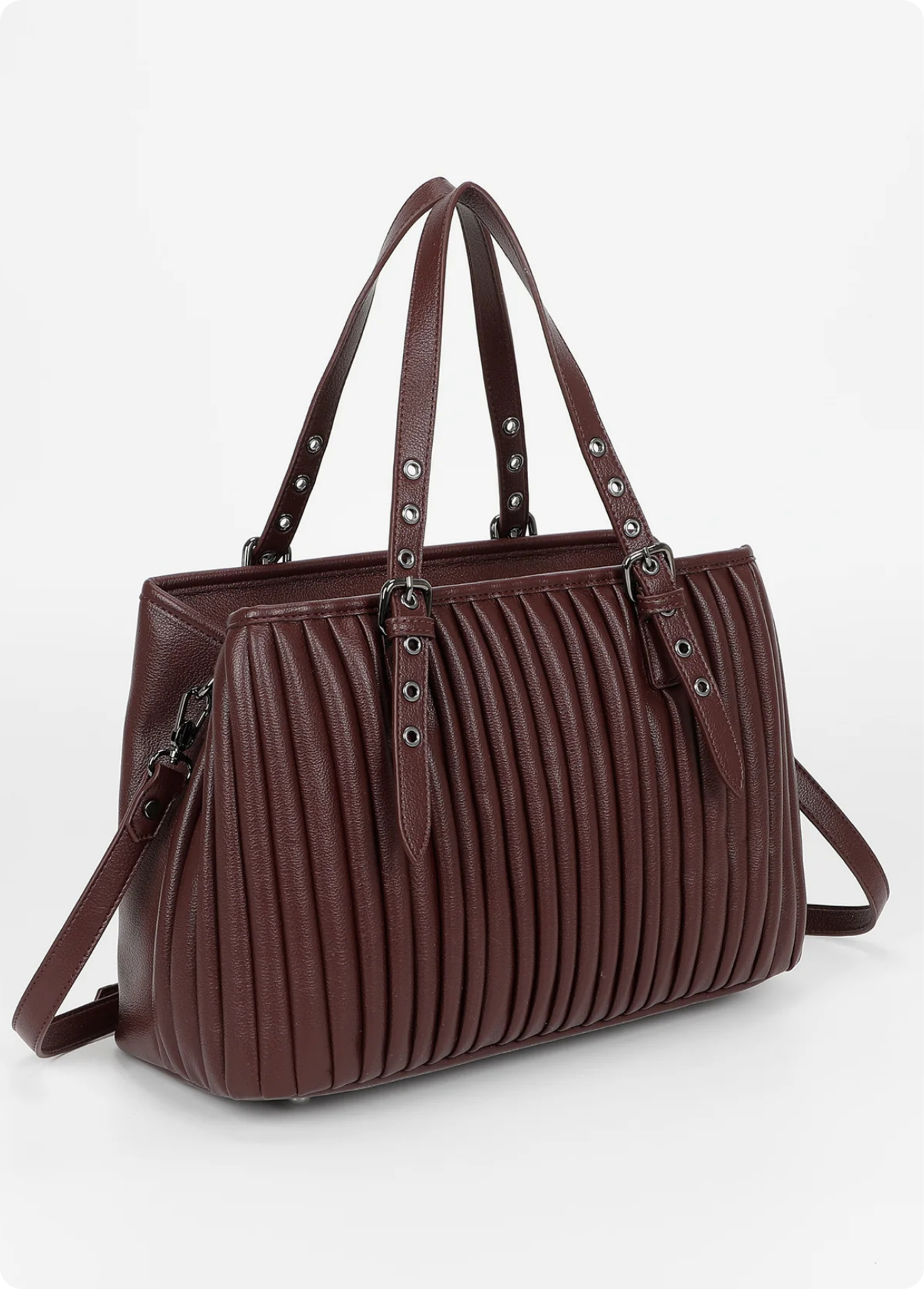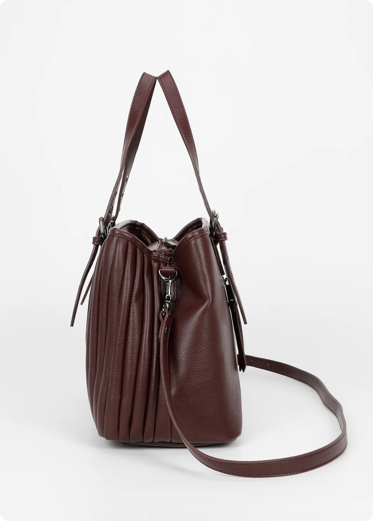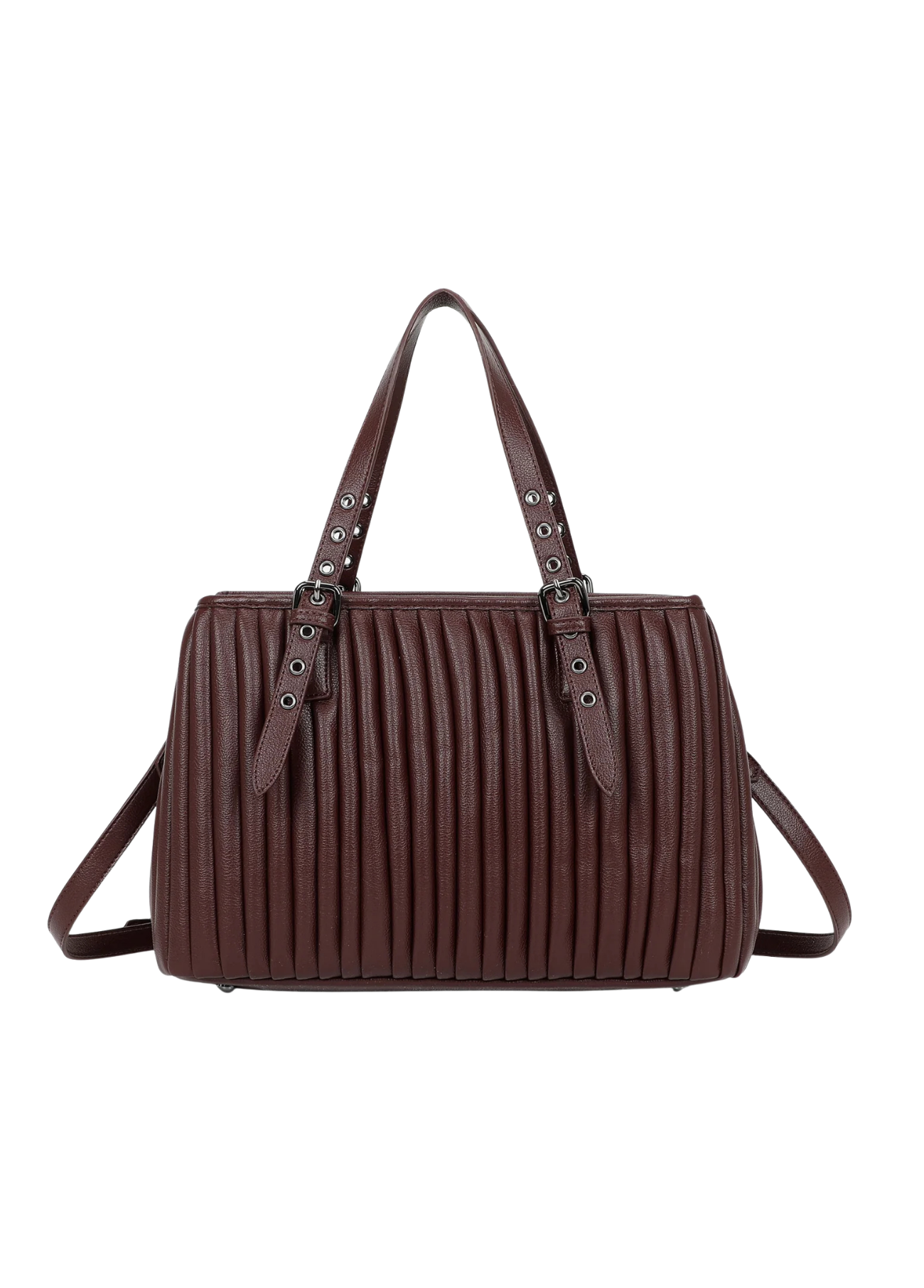 Mala de mão Mimi Mua com efeito plissado, disponível em bordô e preto. O design elegante alia modernidade e praticidade, destacando-se pelo acabamento texturizado e pelas alças ajustáveis com fivelas metálicas.