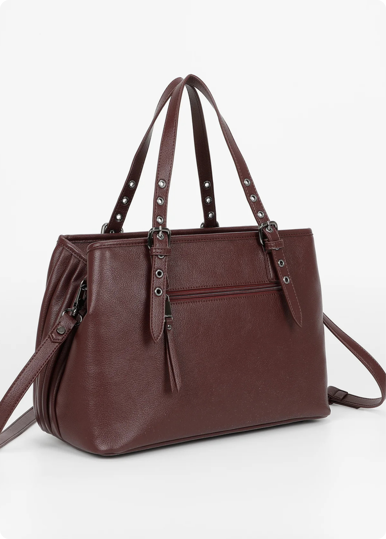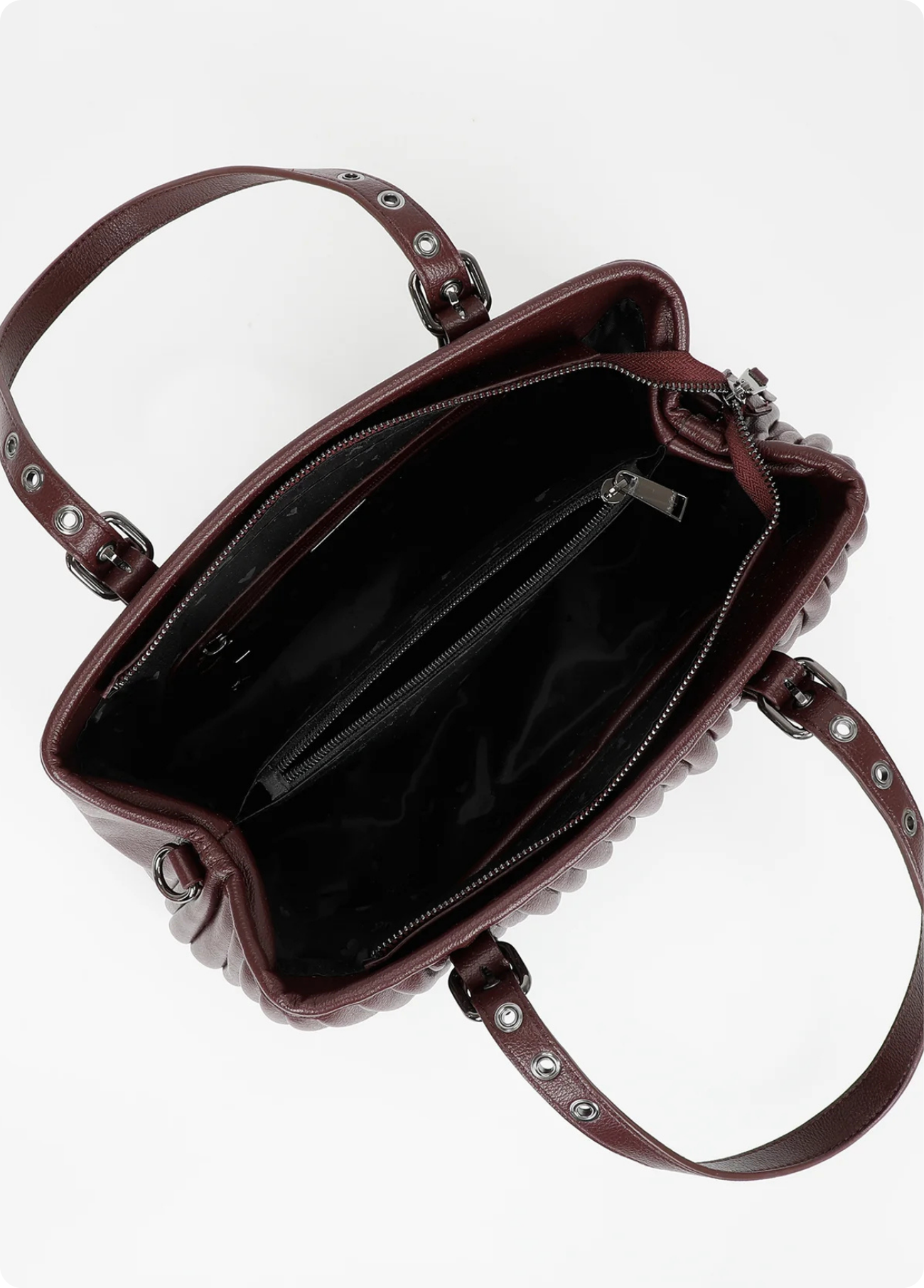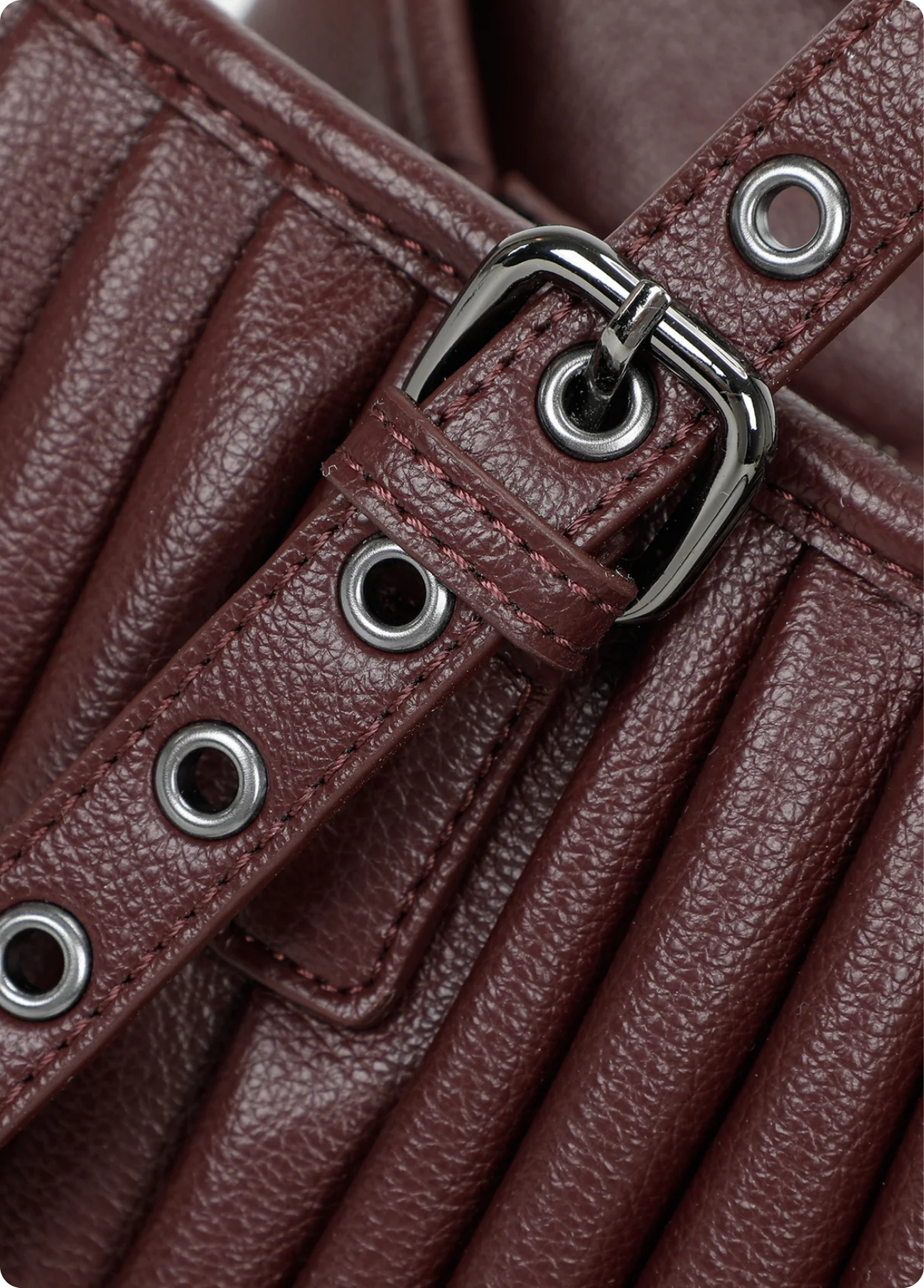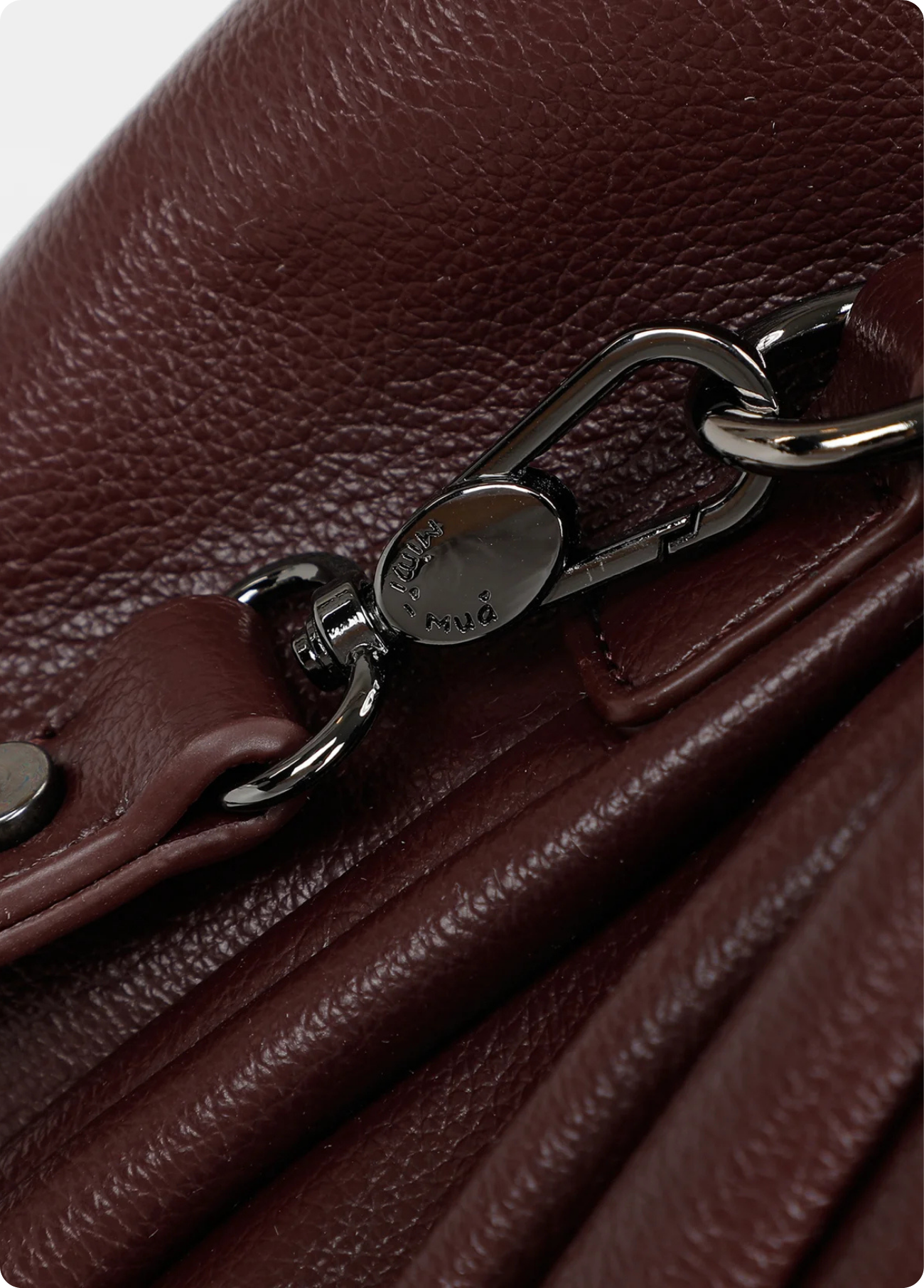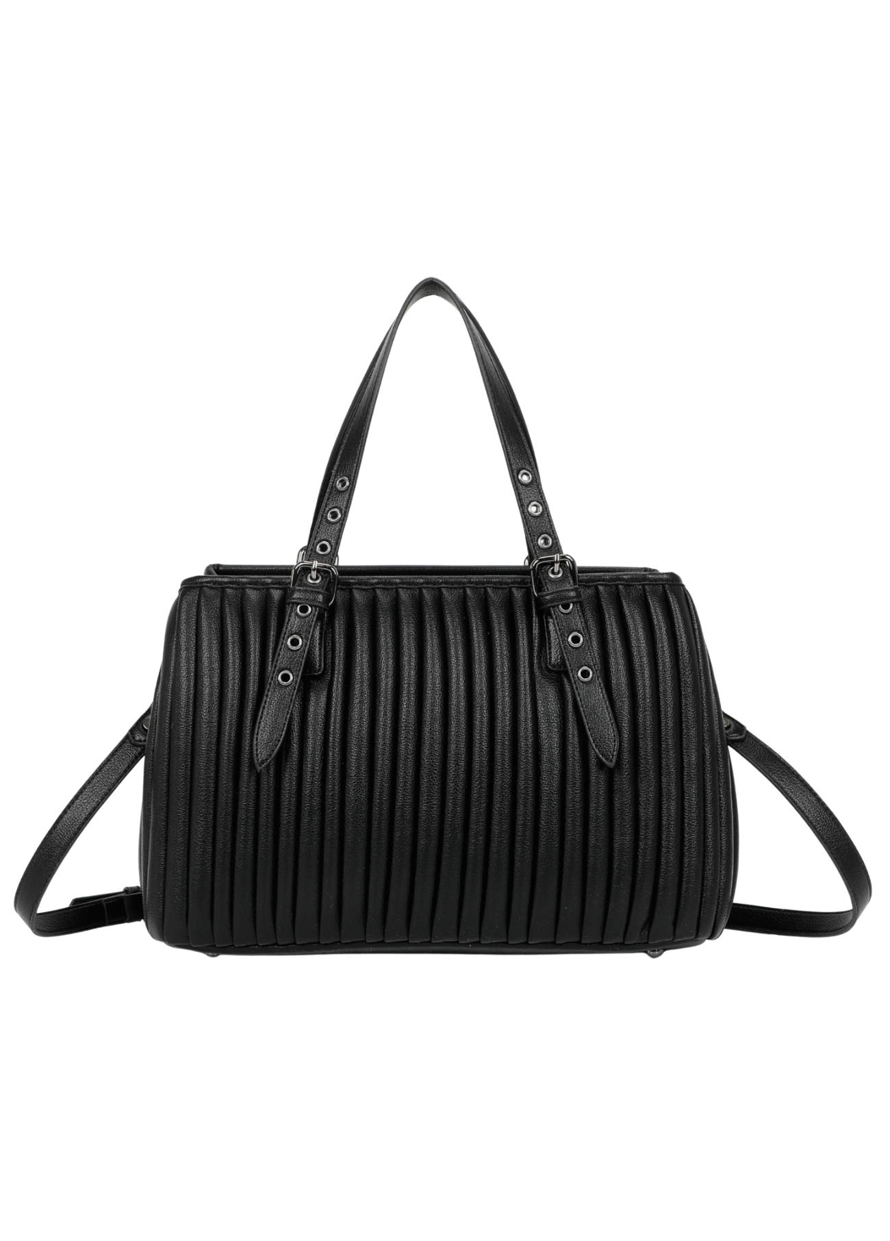 Mala de mão Mimi Mua com efeito plissado, disponível em bordô e preto. O design elegante alia modernidade e praticidade, destacando-se pelo acabamento texturizado e pelas alças ajustáveis com fivelas metálicas.