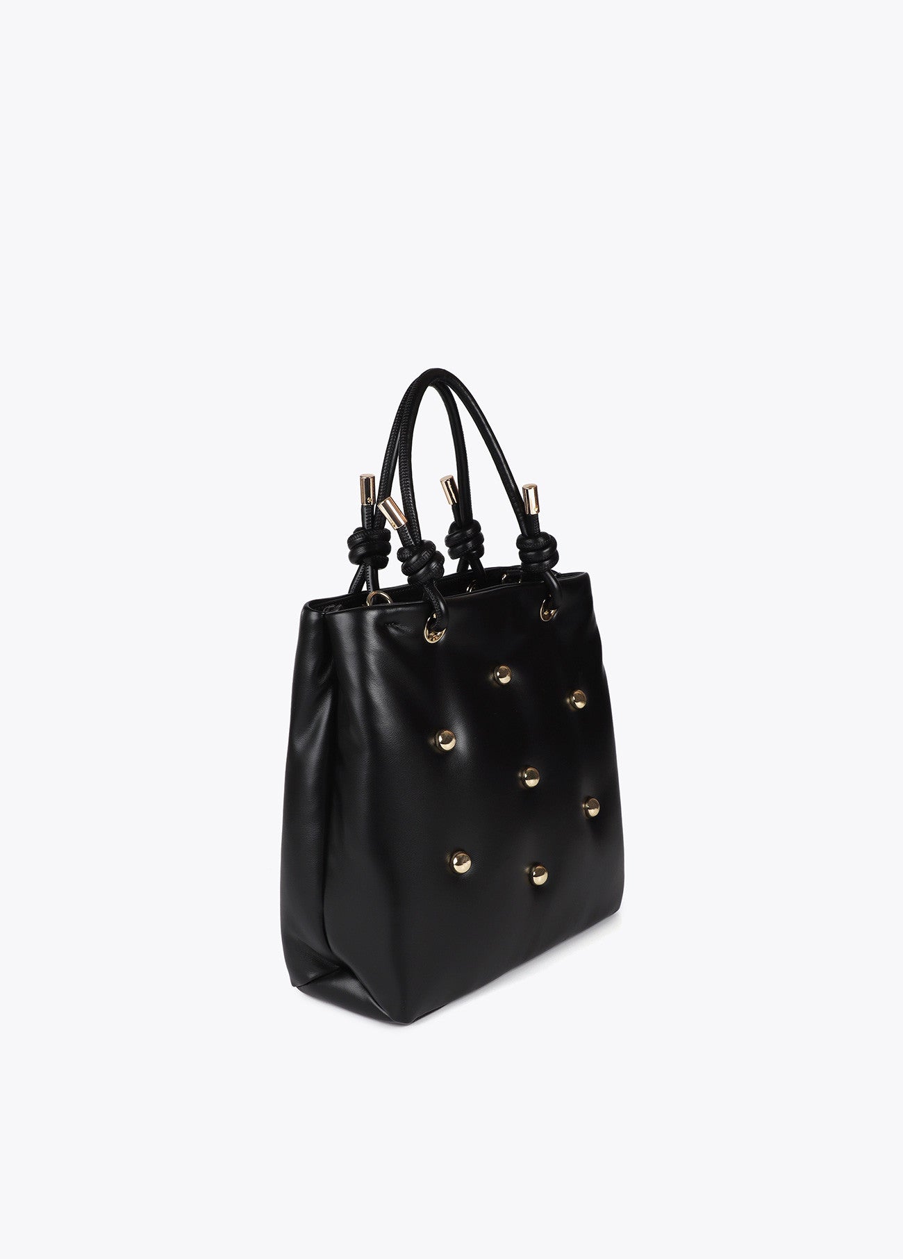 Bolsa XL acolchoada com acabamento em efeito pele. Adornada com elegantes tachinhas metálicas douradas. Alça dupla com nós decorativos e fecho de zíper. Ideal para adicionar estilo ao seu look diário.