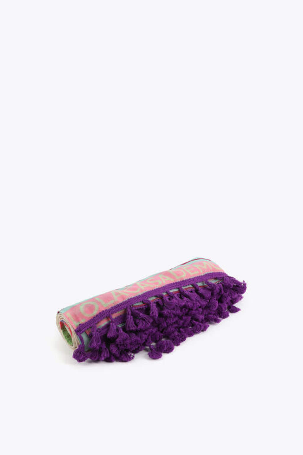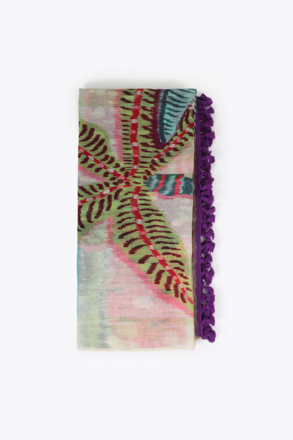 Páreo com motivos tropical de palmeiras, colorido e com franjas roxas.
