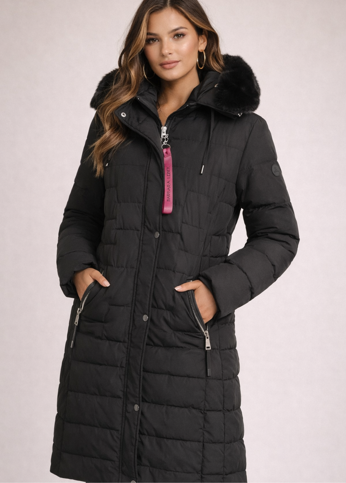Parka acolchoada comprida em preto, ideal para os dias frios. Confeccionada com enchimento térmico que garante conforto e proteção, apresenta capuz com acabamento em pelo sintético, fecho de correr com botões de pressão e bolsos laterais com fecho. O corte alongado e estruturado proporciona um visual sofisticado e versátil, perfeito para o dia a dia urbano sem abdicar do estilo.