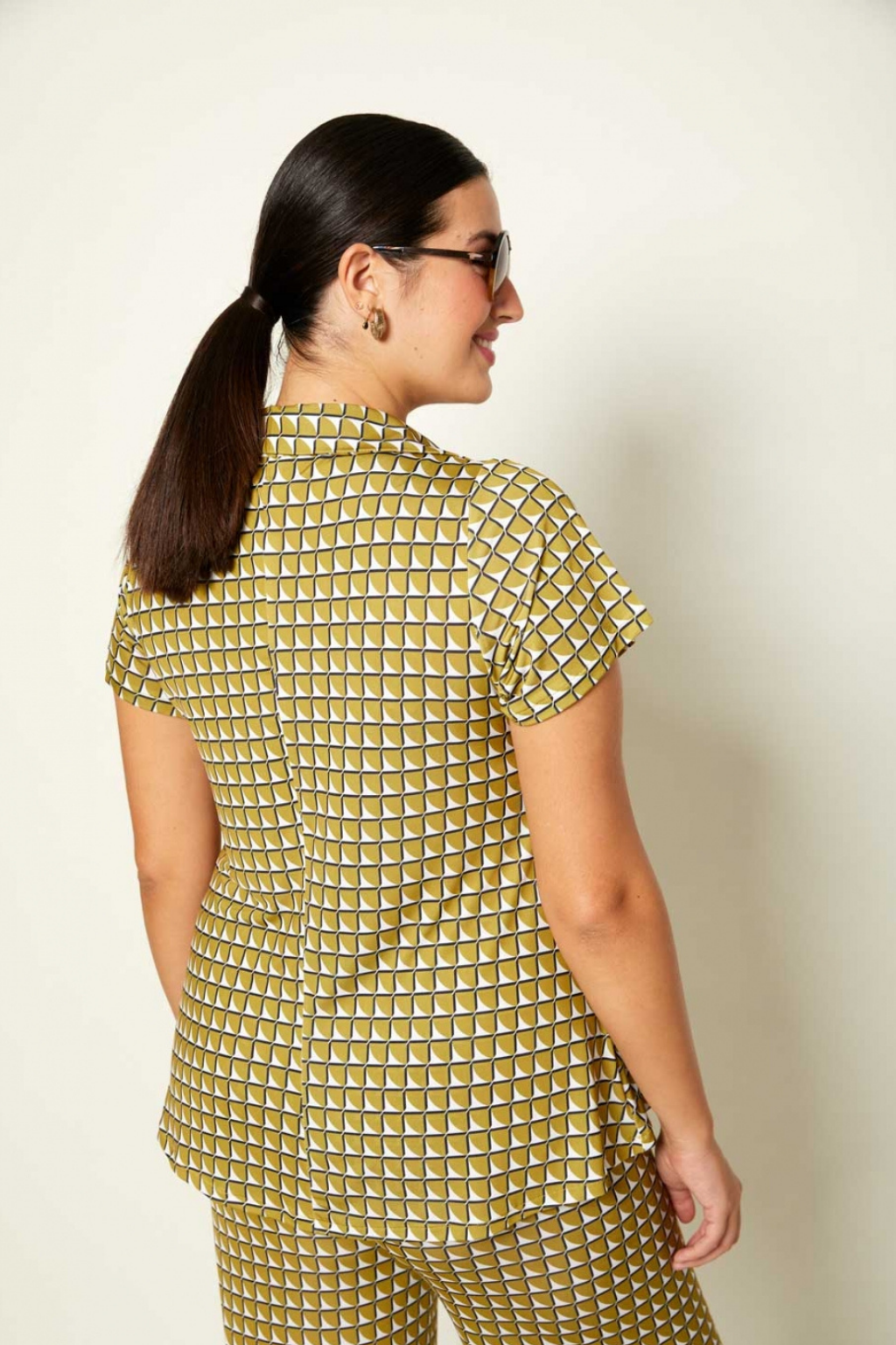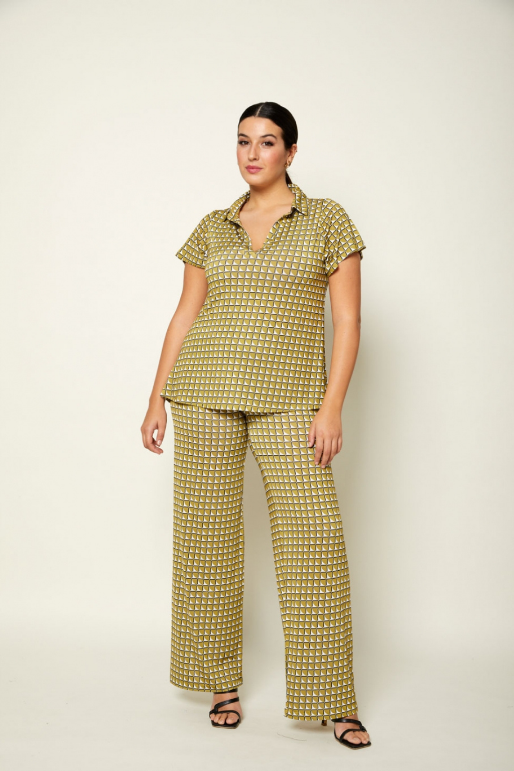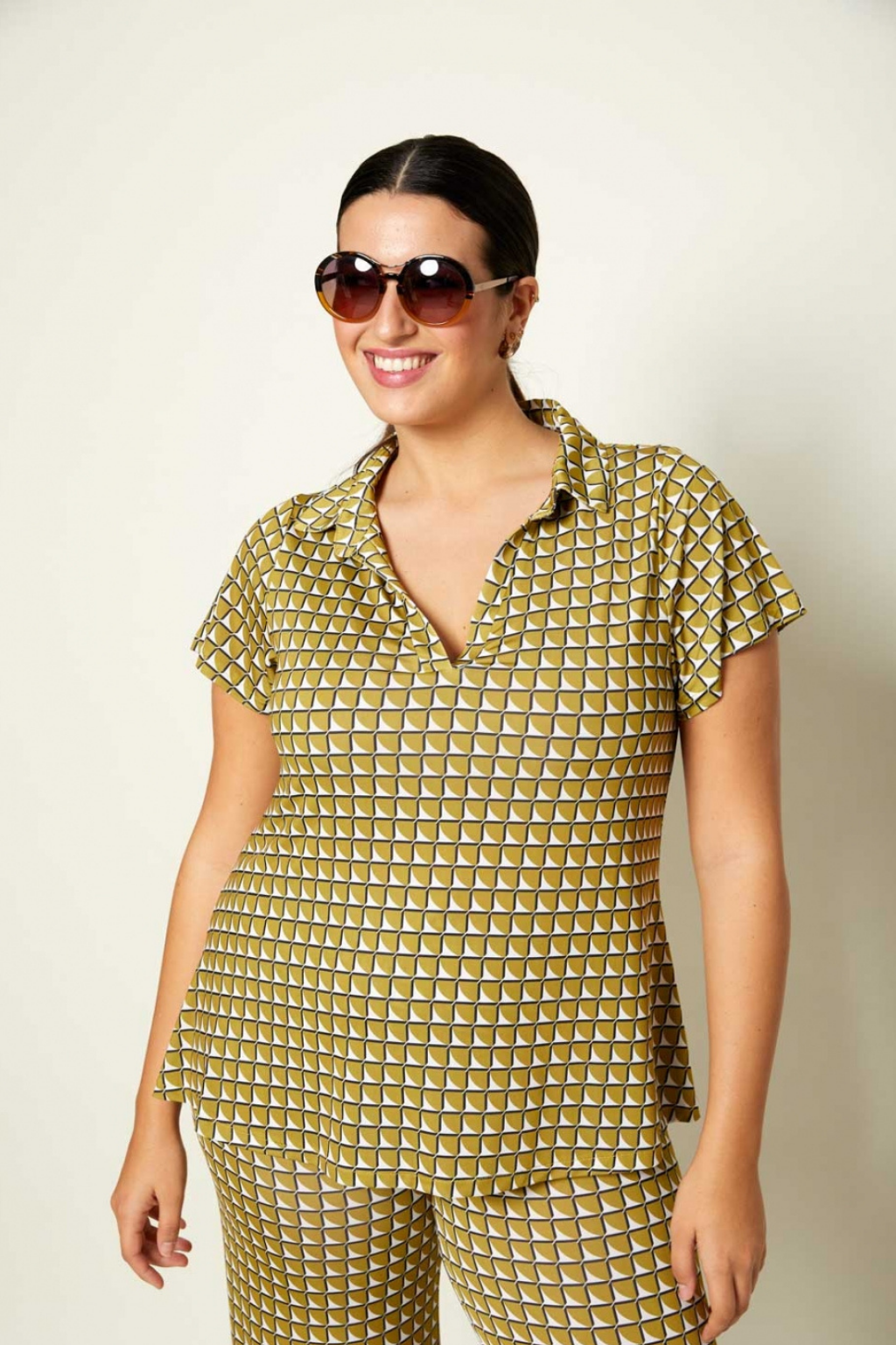 Blusa tipo polo com estampado geométrico pistacho. De manga curta com decote polo e corte alargado, em malha fria. O tecido é confortável, fluido e muito agradável ao toque, ideal para o verão. O design proporciona um visual desportivo e chique, perfeito para o dia a dia ou para combinar com calças simples. Um básico com um toque especial, feito para mulheres de verdade. Disponível até o tamanho 2XL.