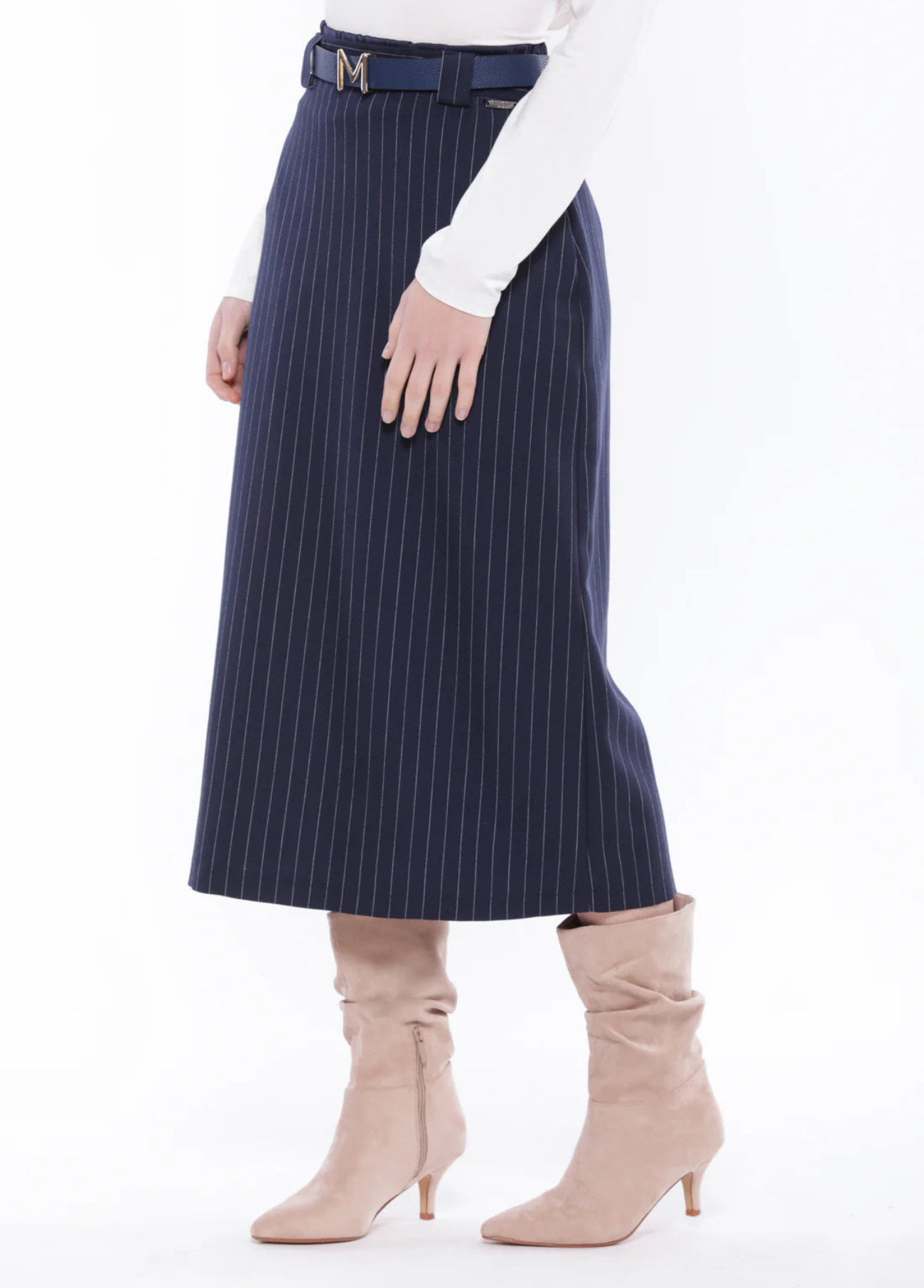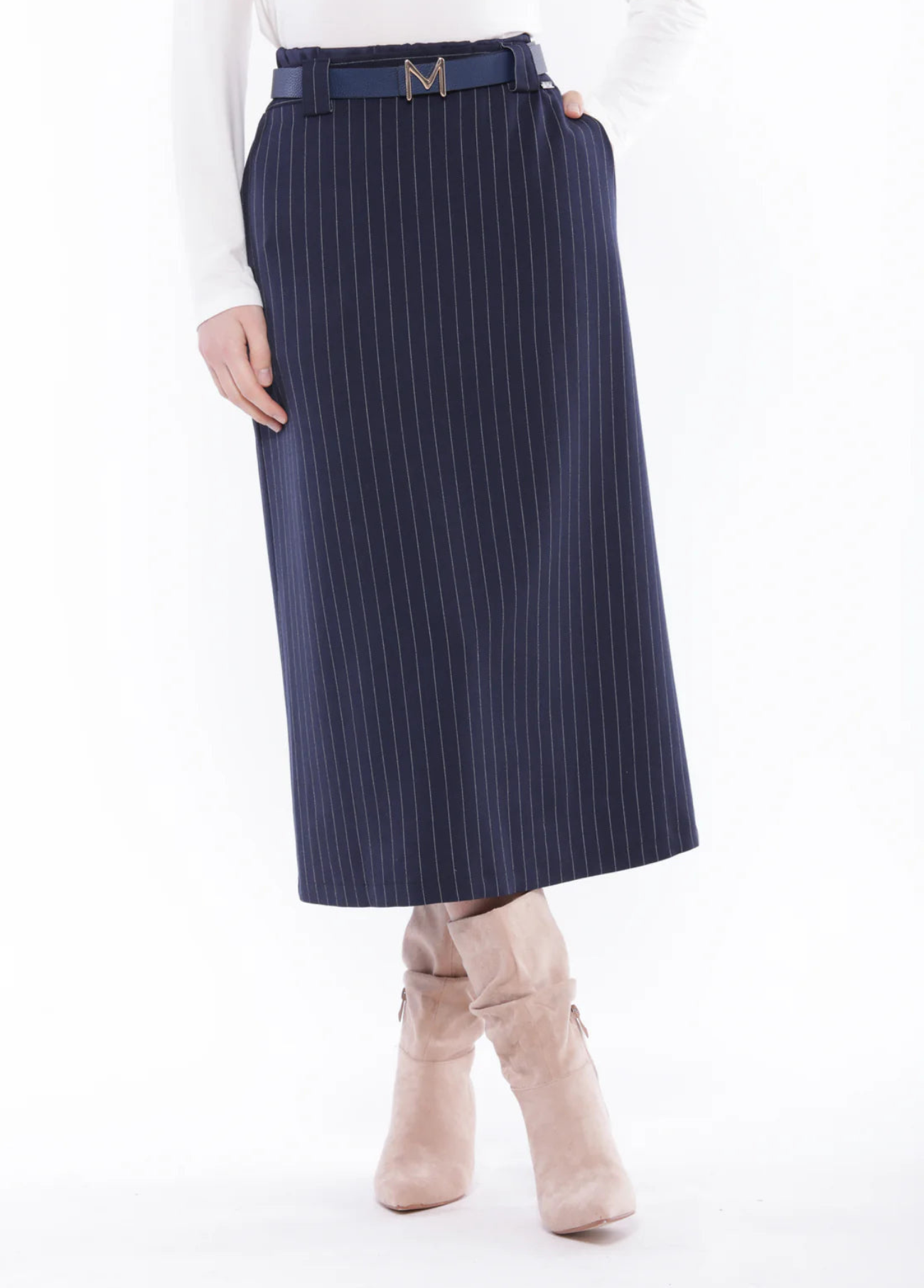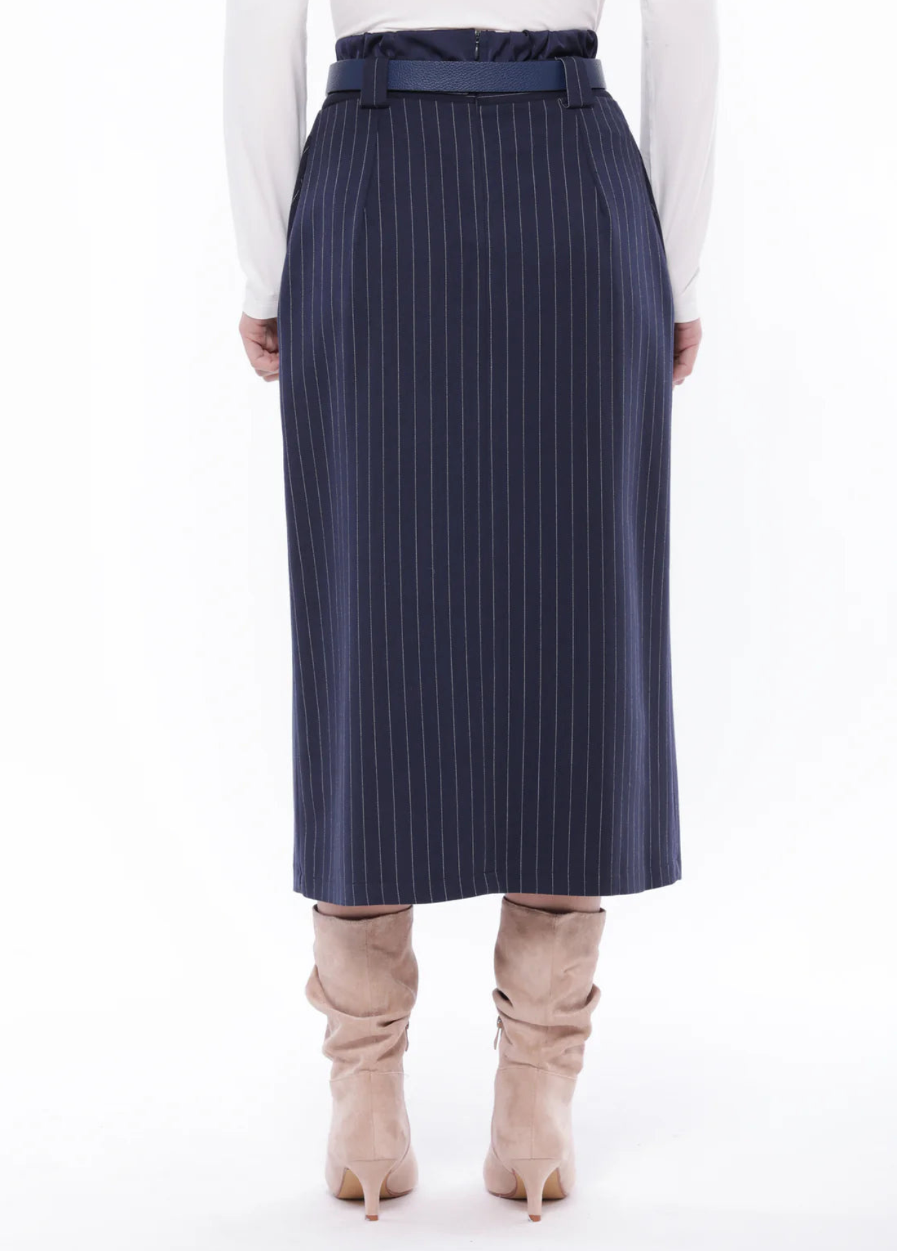 Saia lápis azul marinho com risca branca. Elástico na cintura e fecho zipper. Estilo clássico. Tem colete ou jaqueta para conjunto.