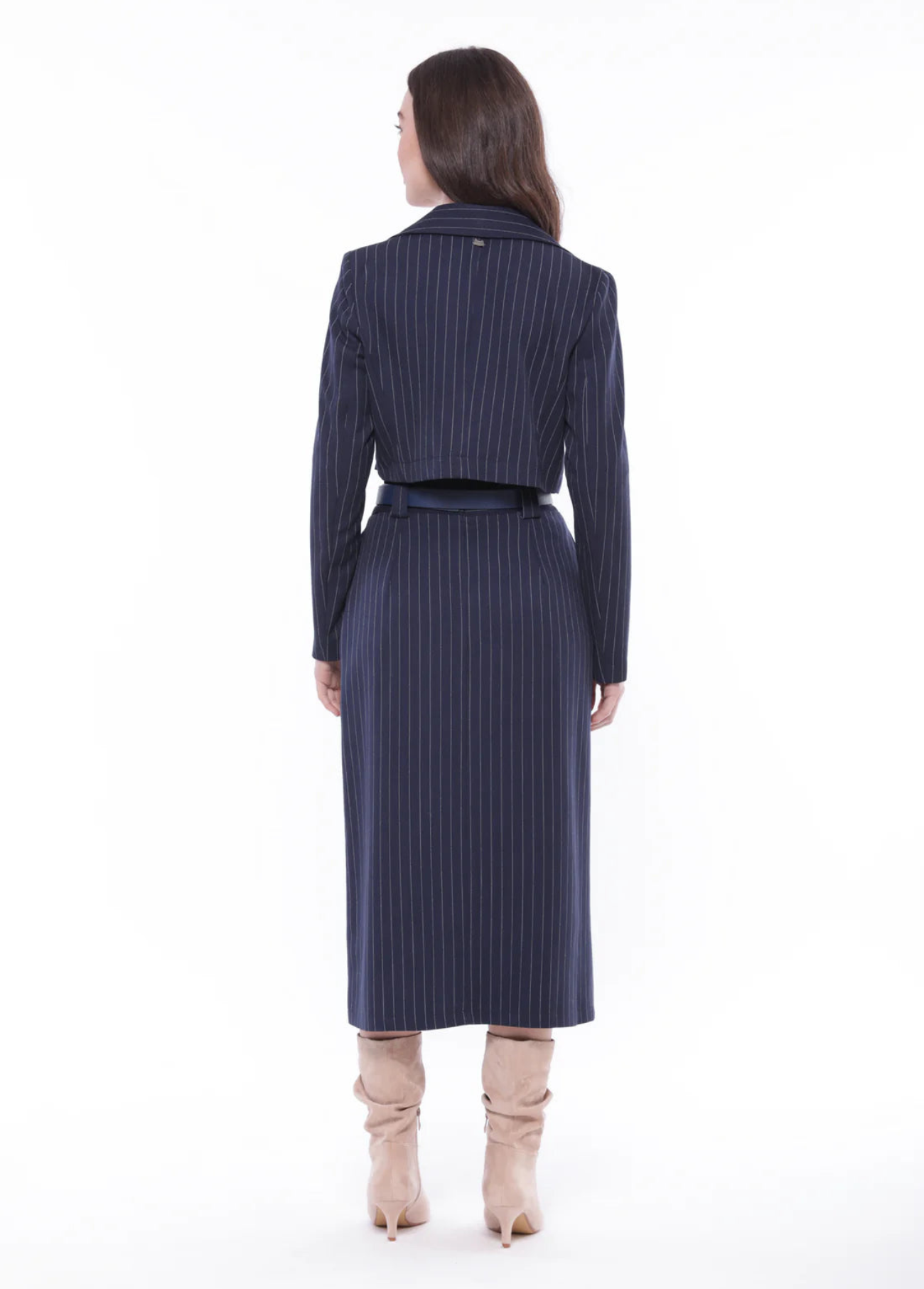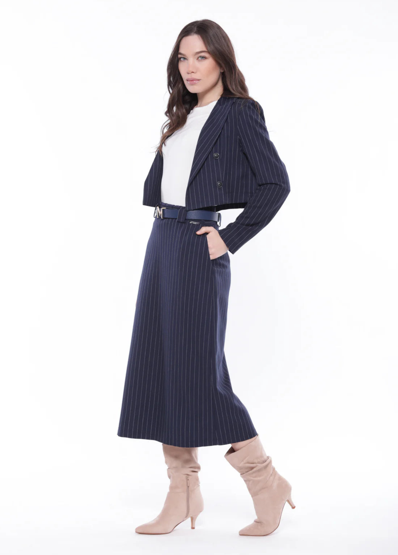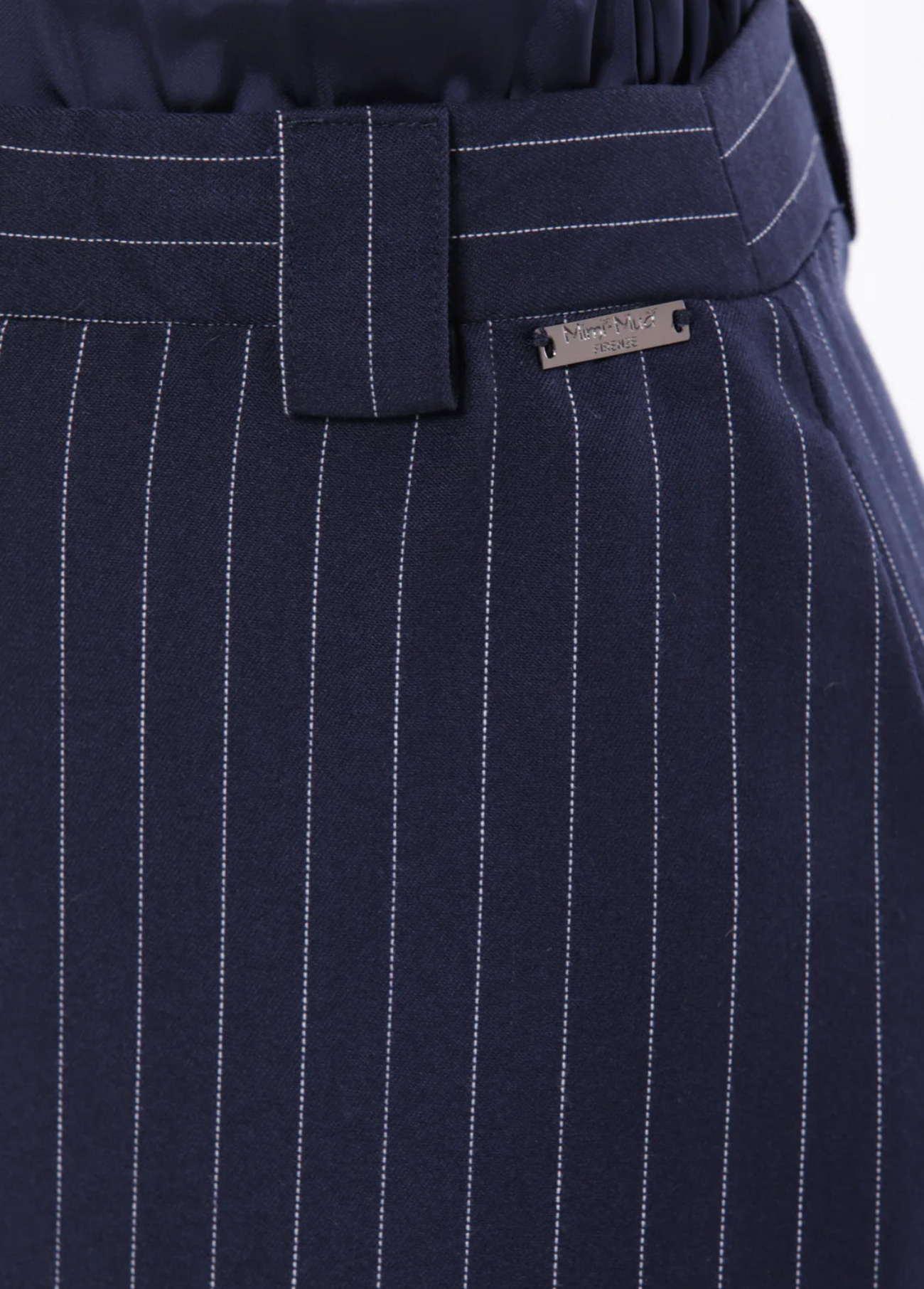 Saia lápis azul marinho com risca branca. Elástico na cintura e fecho zipper. Estilo clássico. Tem colete ou jaqueta para conjunto.