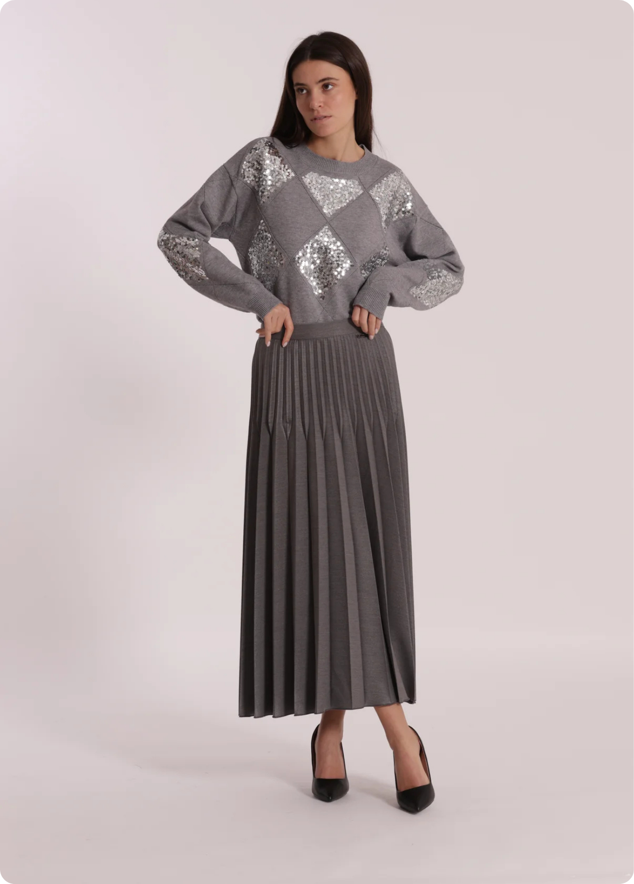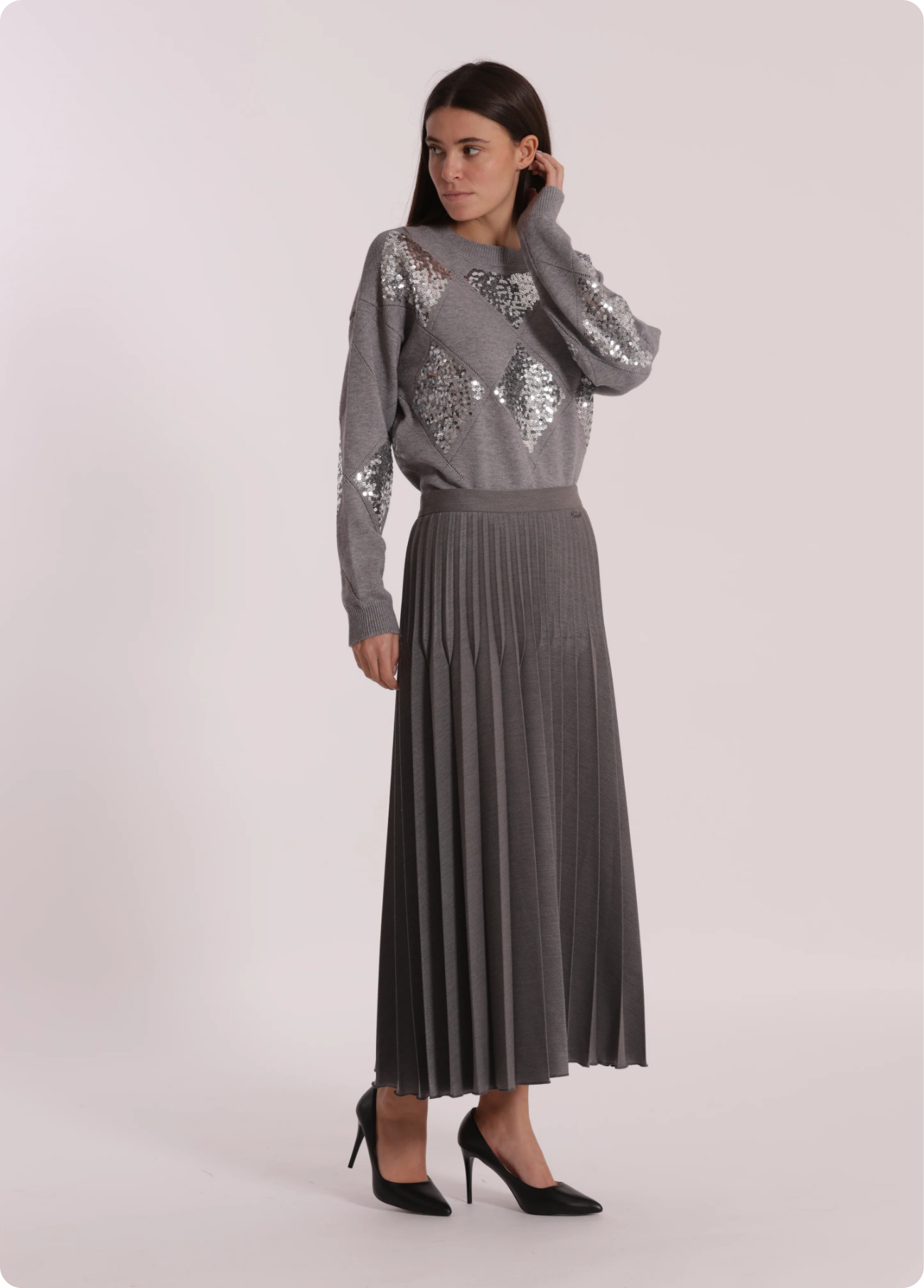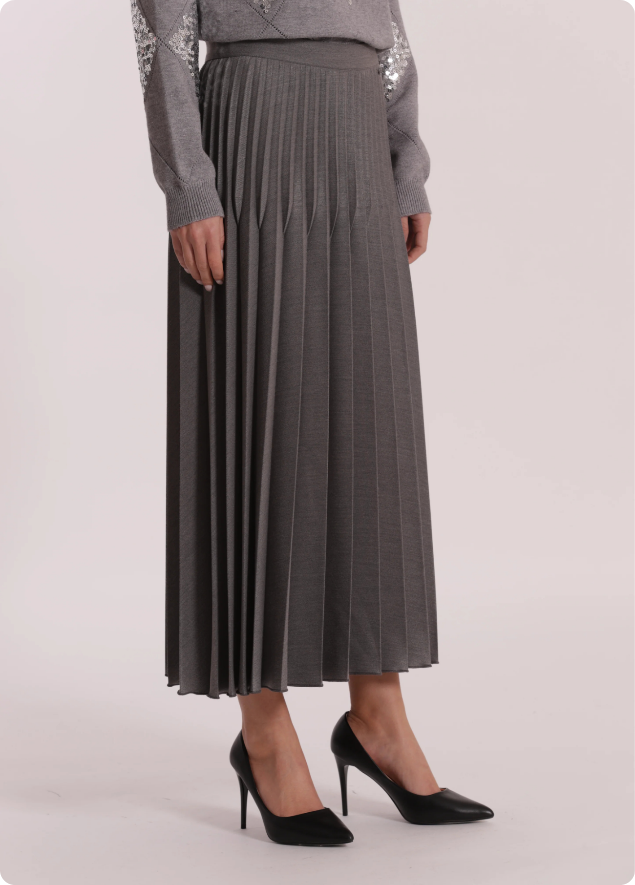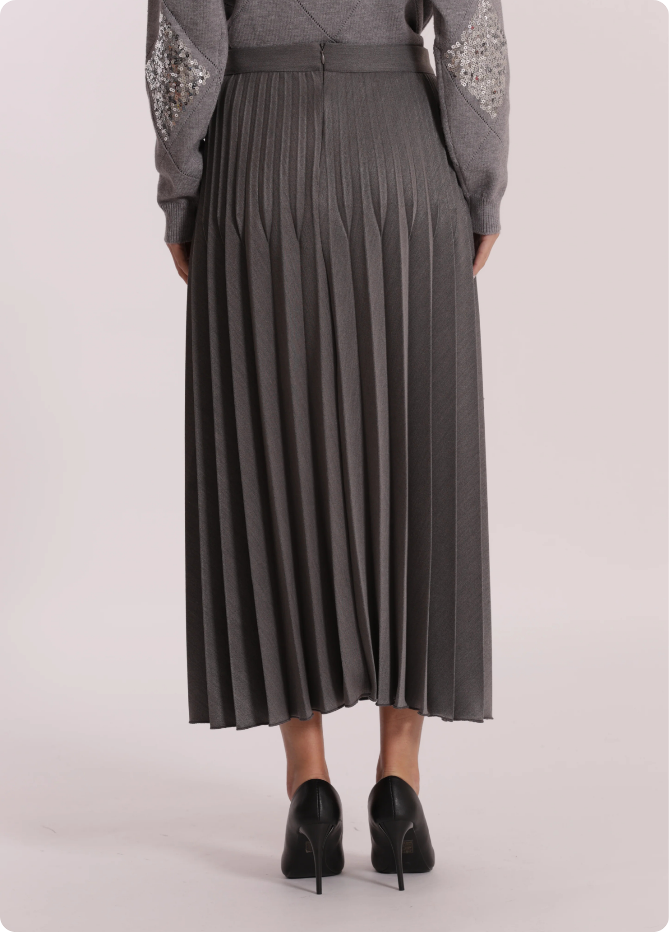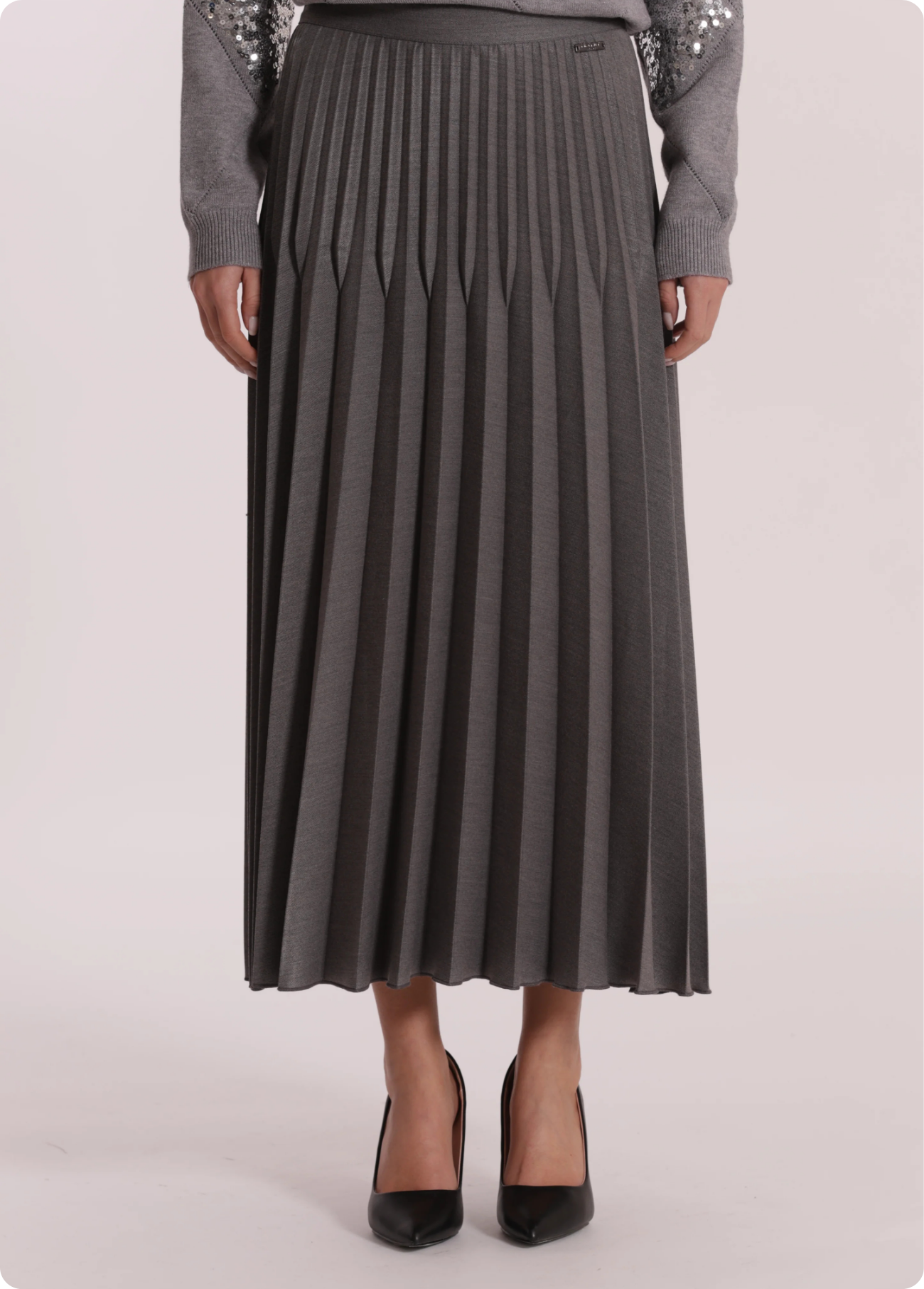 Saia plissada comprida em tom cinza, elegante e intemporal. O tecido fluido com pregas bem definidas cria movimento sofisticado, adaptando-se a diferentes estilos e ocasiões. Perfeita para usar com camisolas, camisas ou blusas, é uma peça versátil que pode ser combinada tanto em looks casuais como em produções mais formais. Um essencial de guarda-roupa que une conforto e estilo.