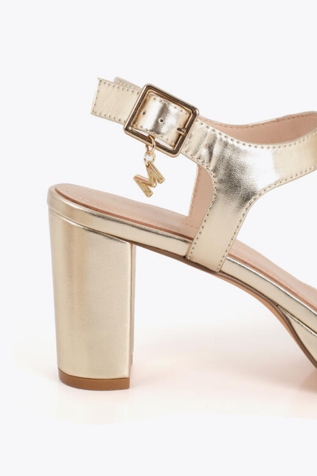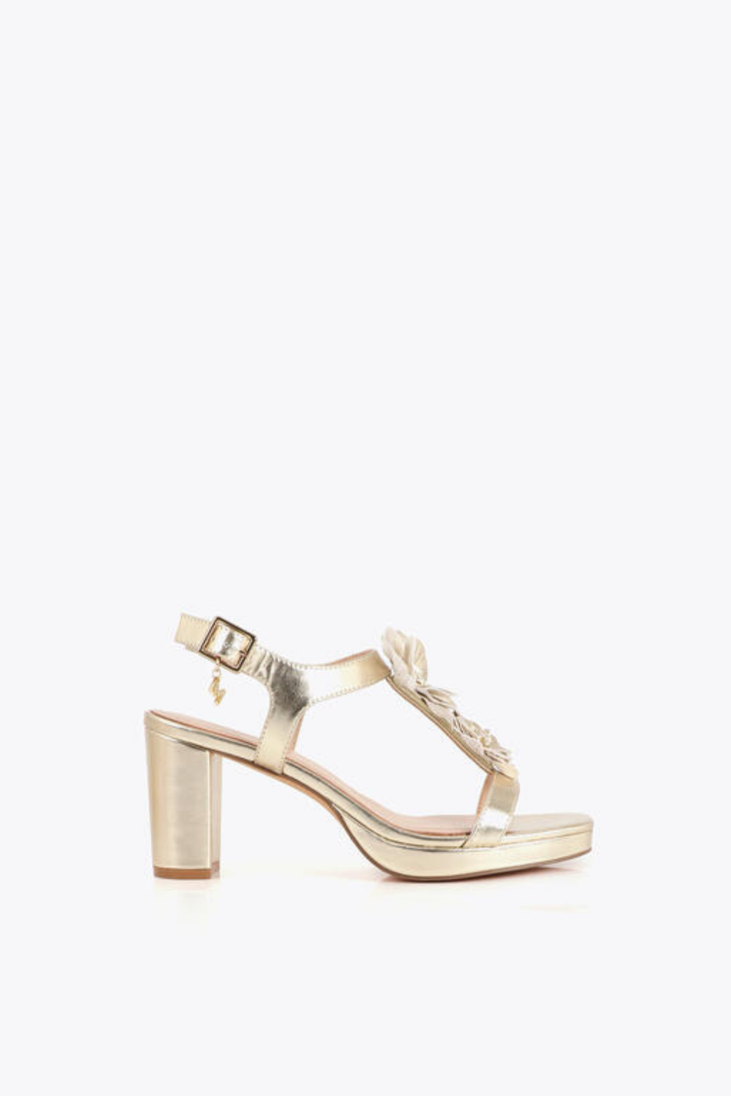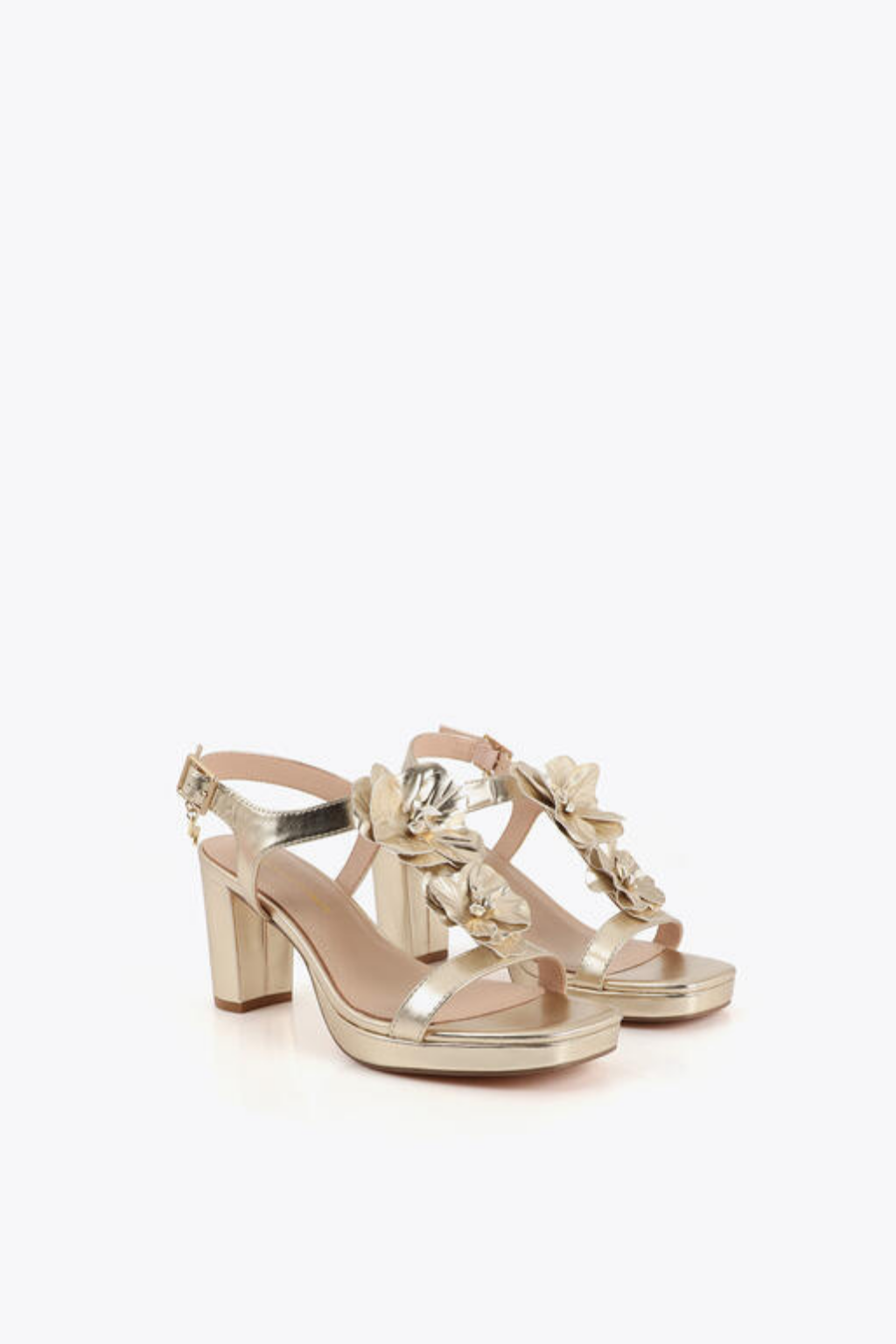 Sandália de salto dourada com detalhes florais. Fivela ajustável e plataforma para um visual elegante e confortável. Ideal para ocasiões especiais.
