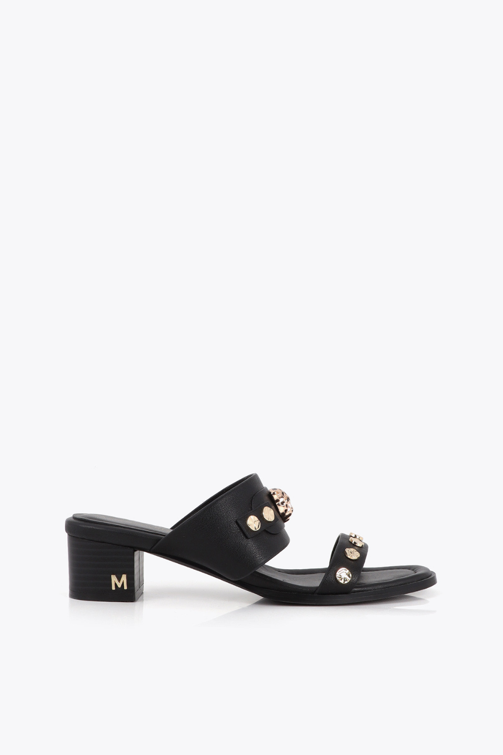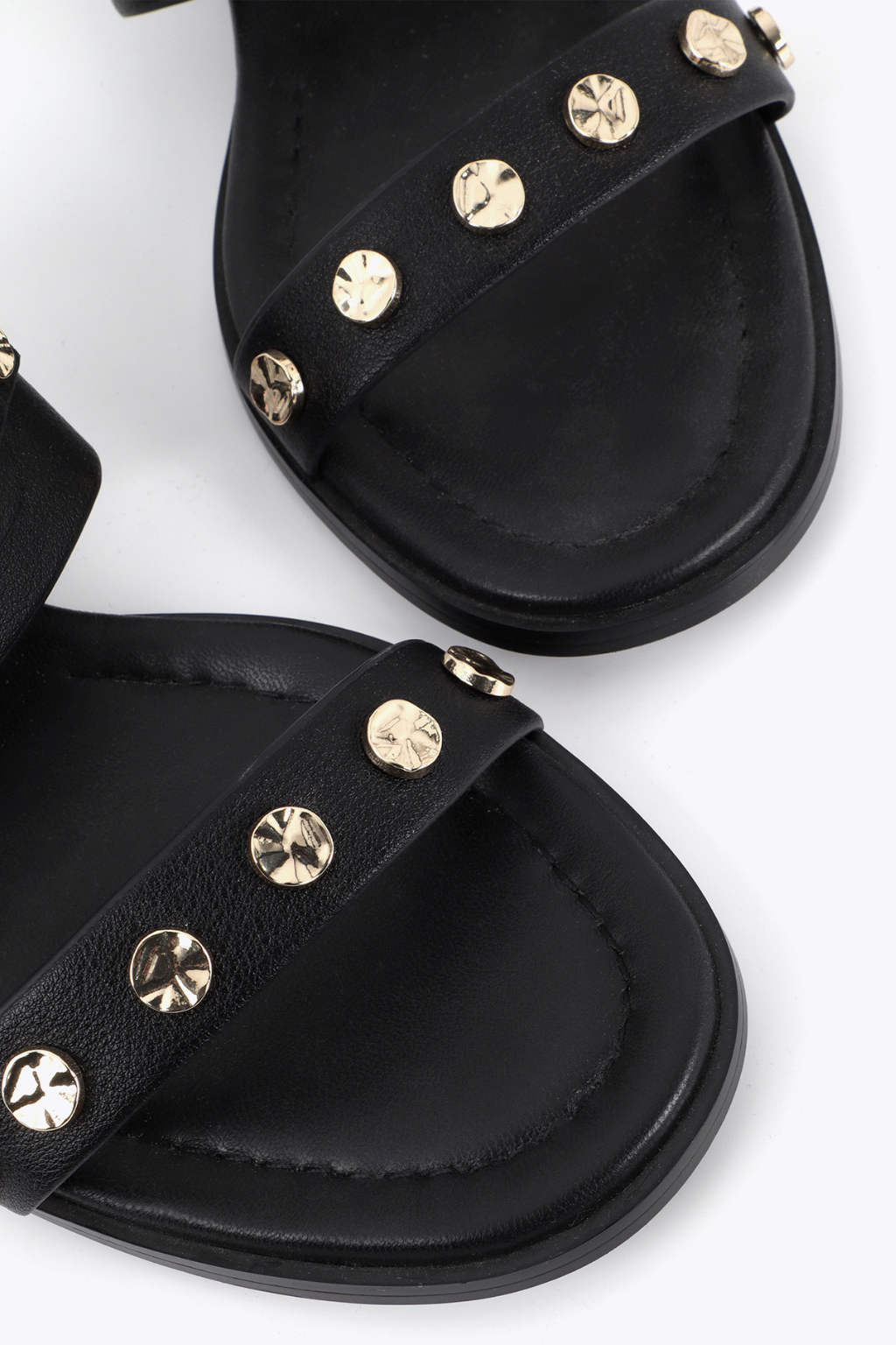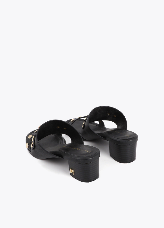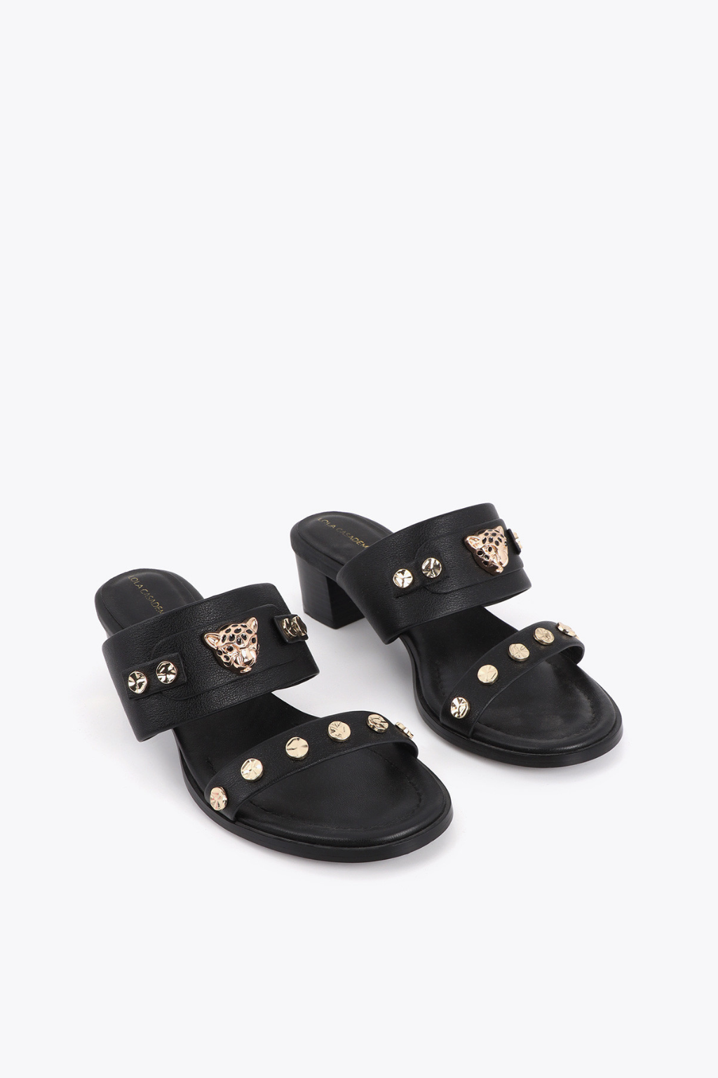 Sandália de salto com aplicação de cabeça de leopardo e detalhes de tachas douradas. Feita em couro sintético com forro macio. Design sofisticado e elegante, perfeito para um toque distintivo. Salto confortável de 5 cm para uso prolongado.