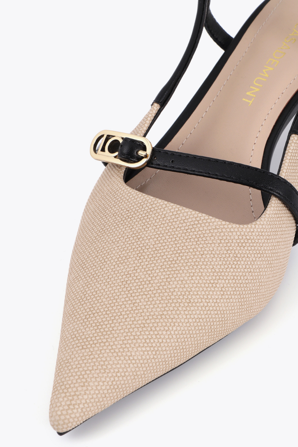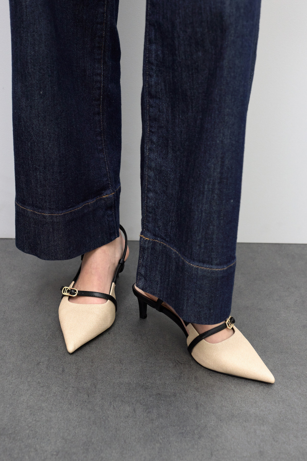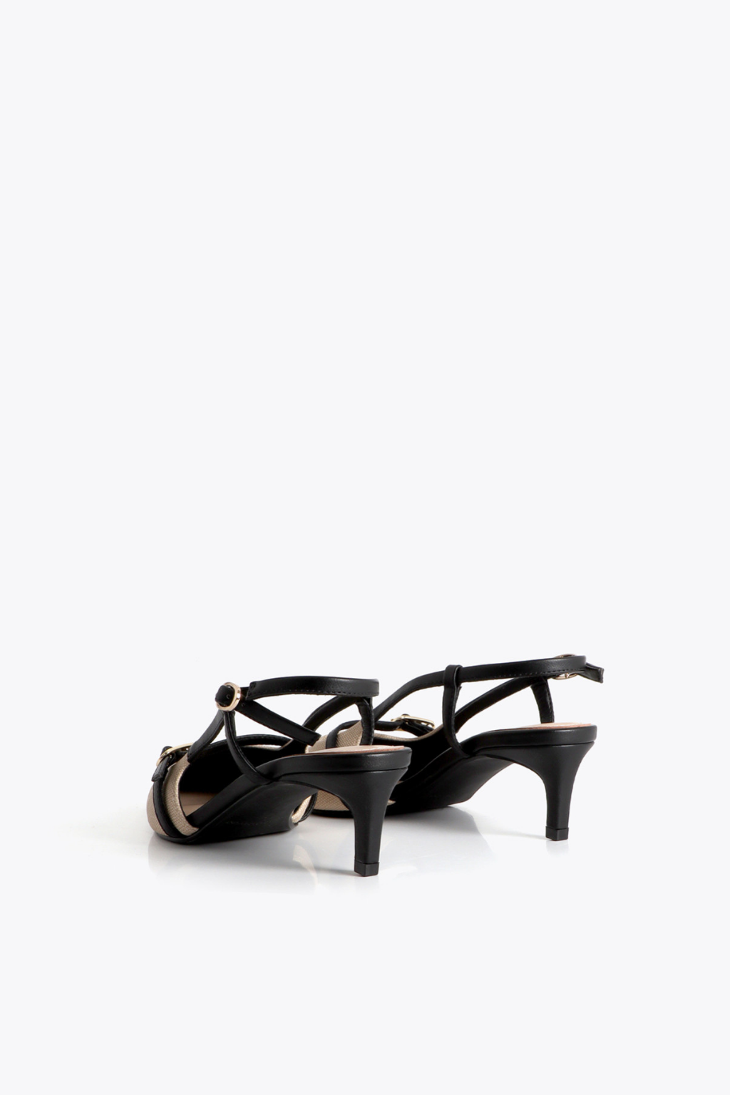 Elegante sapato de salto bicolor com tiras finas e fivelas personalizadas. Design pontiagudo para alongar a figura. Fecho ajustável e material texturizado para distinção e conforto.