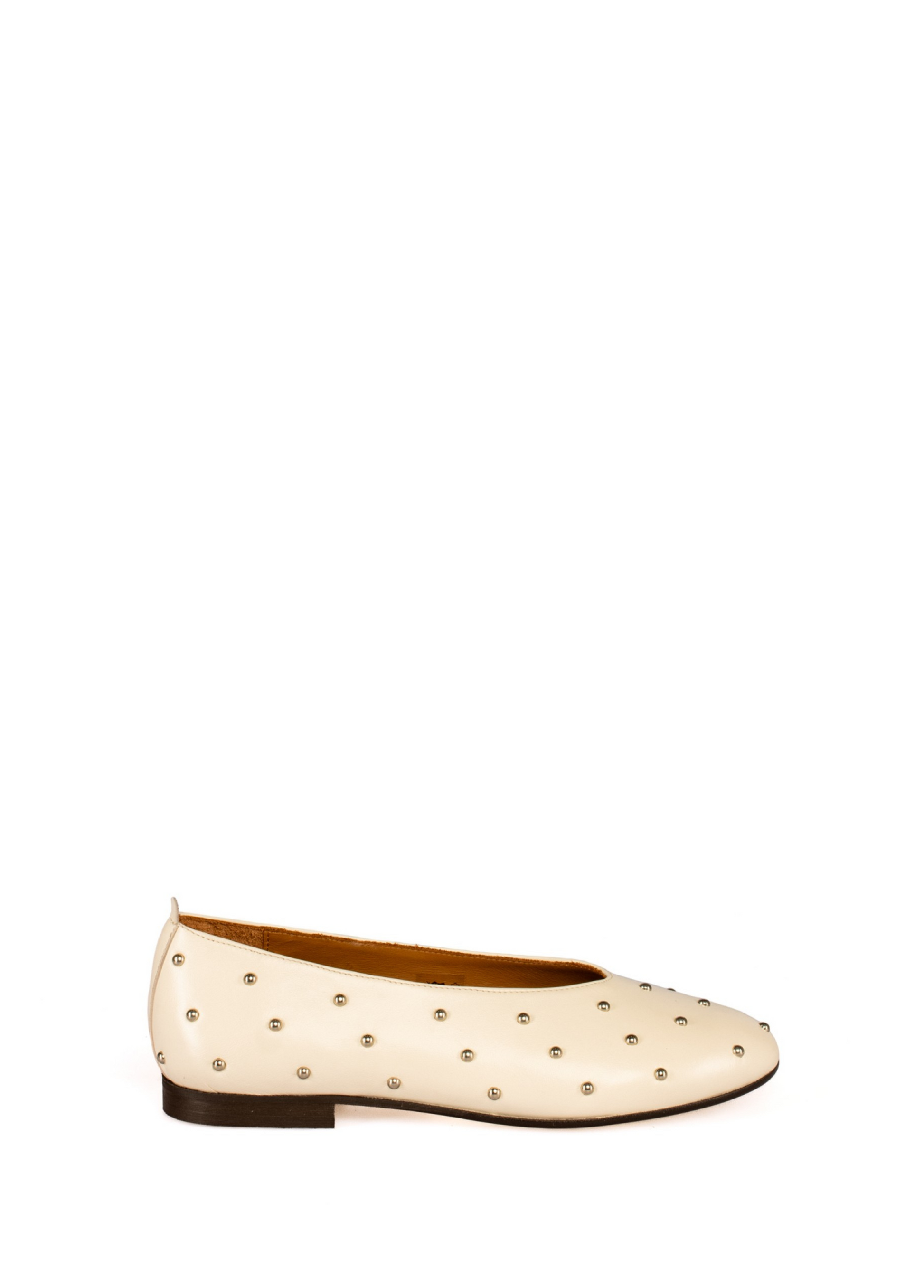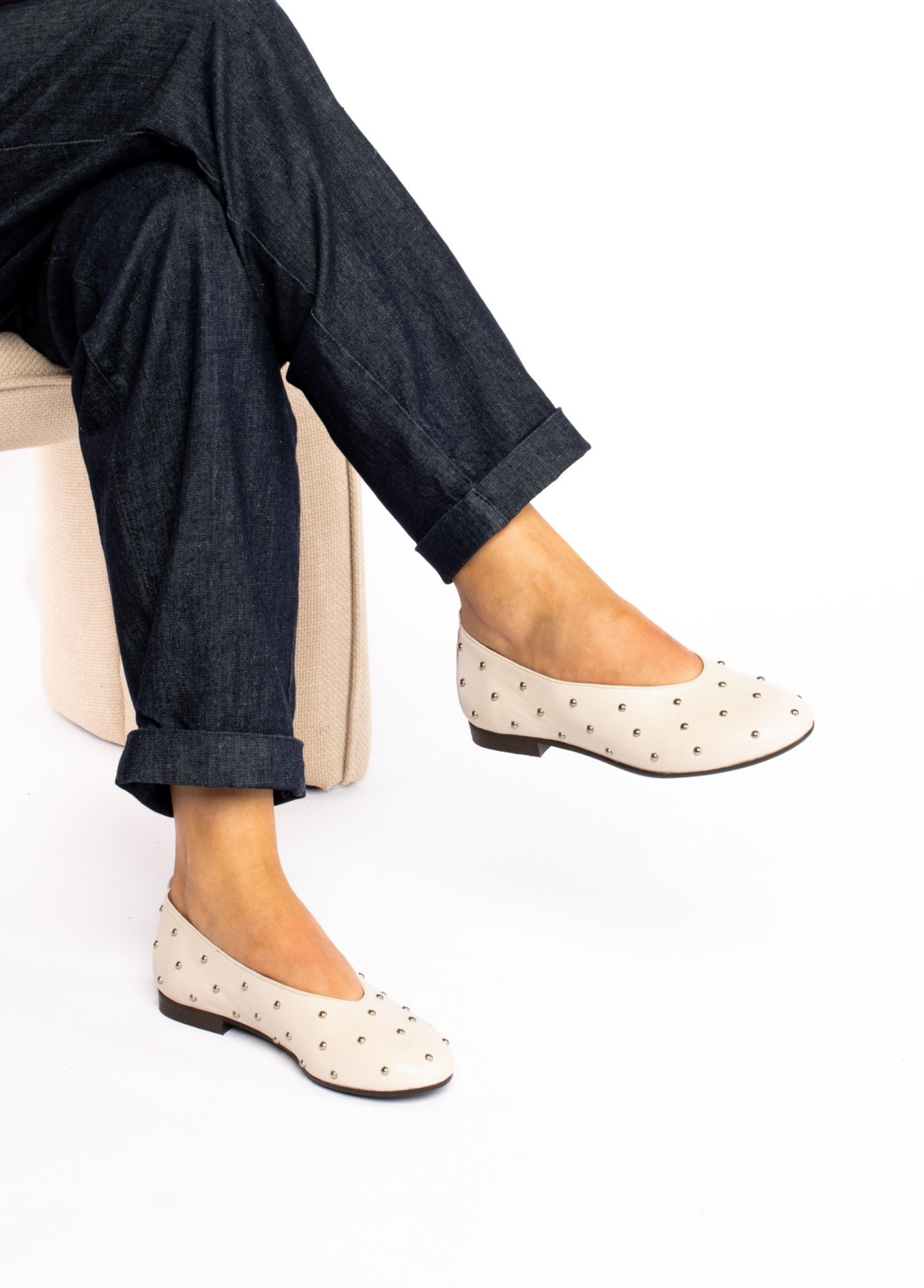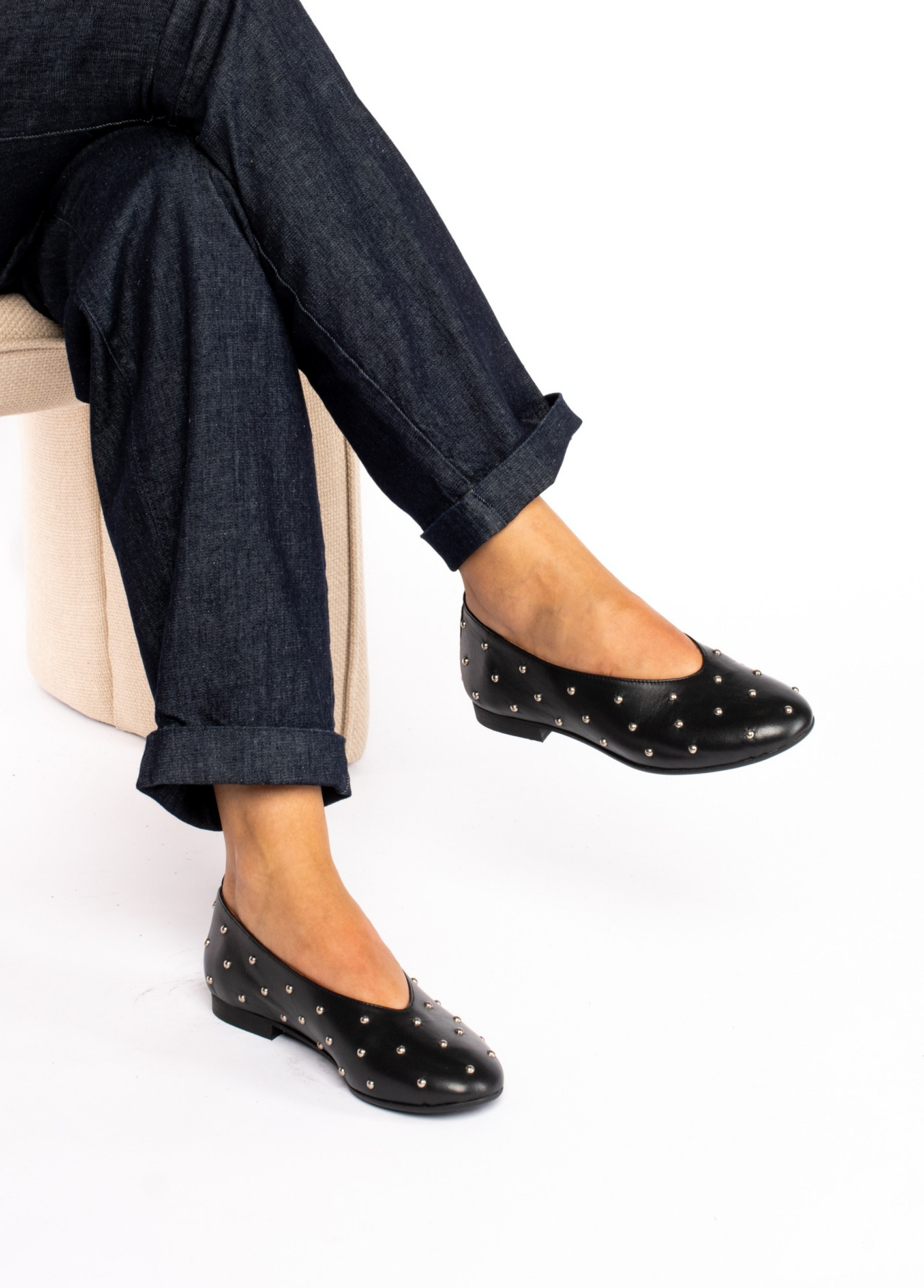 Sabrina de salto raso com tachas, em pele. Apresenta design de decote redondo. Fabricado em Portugal.