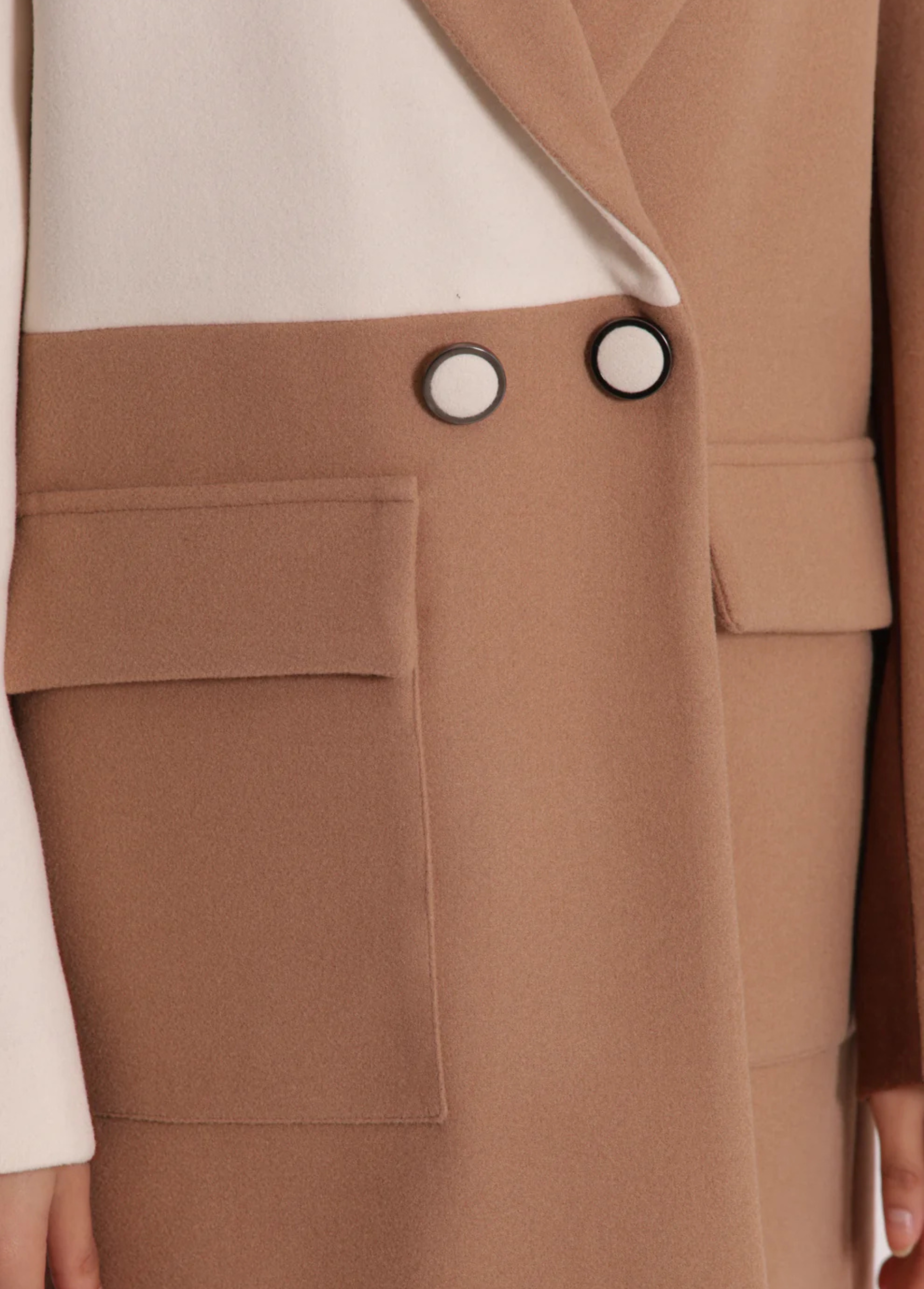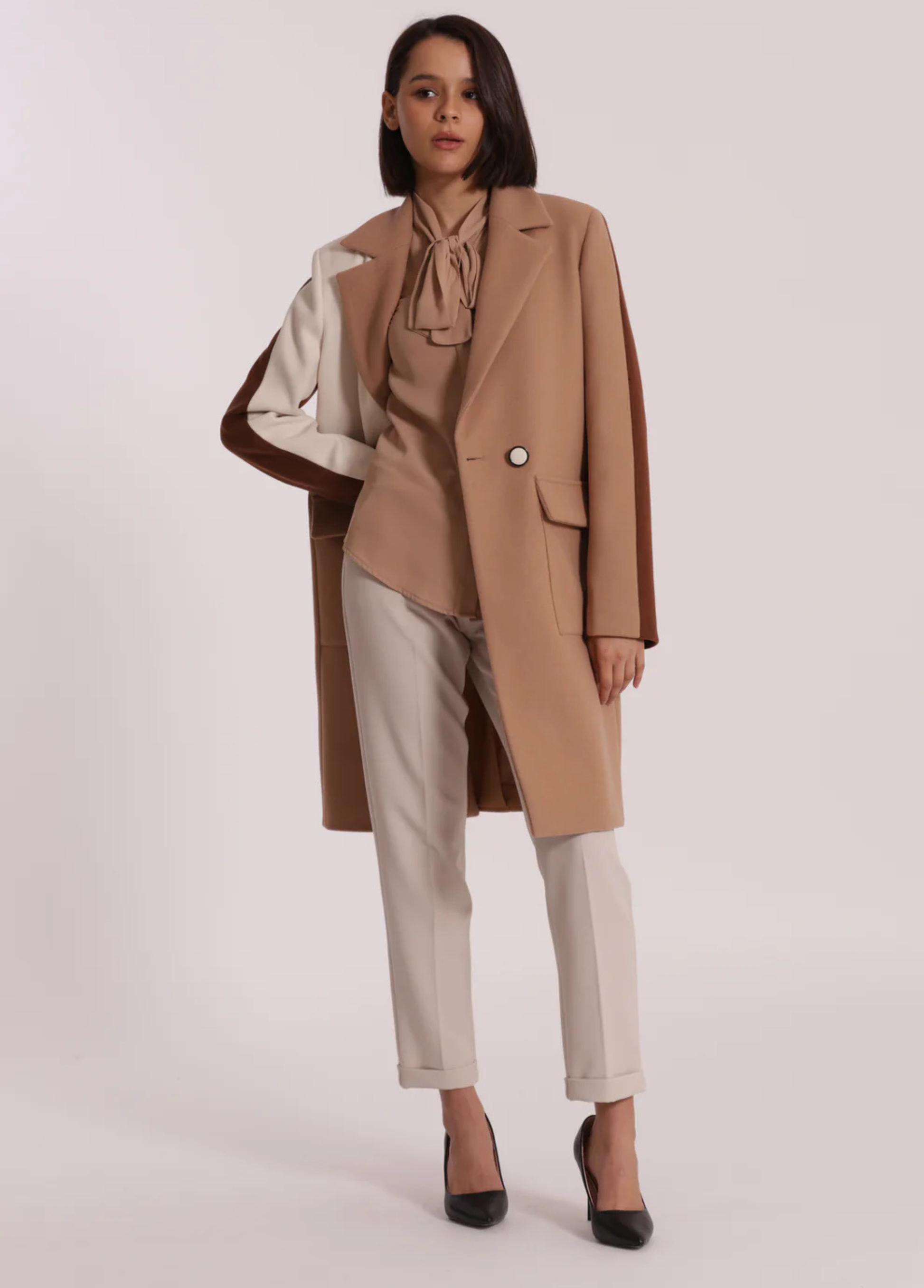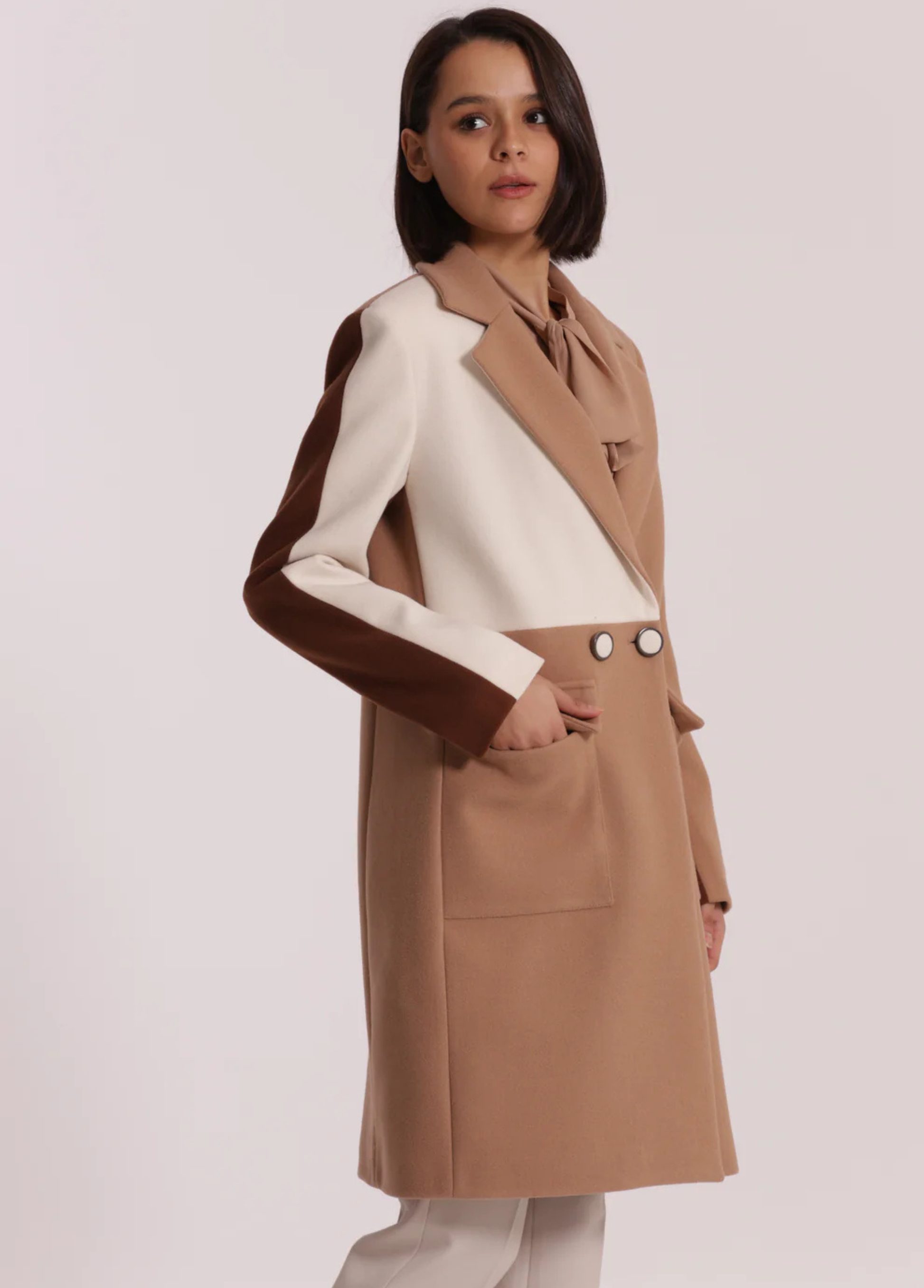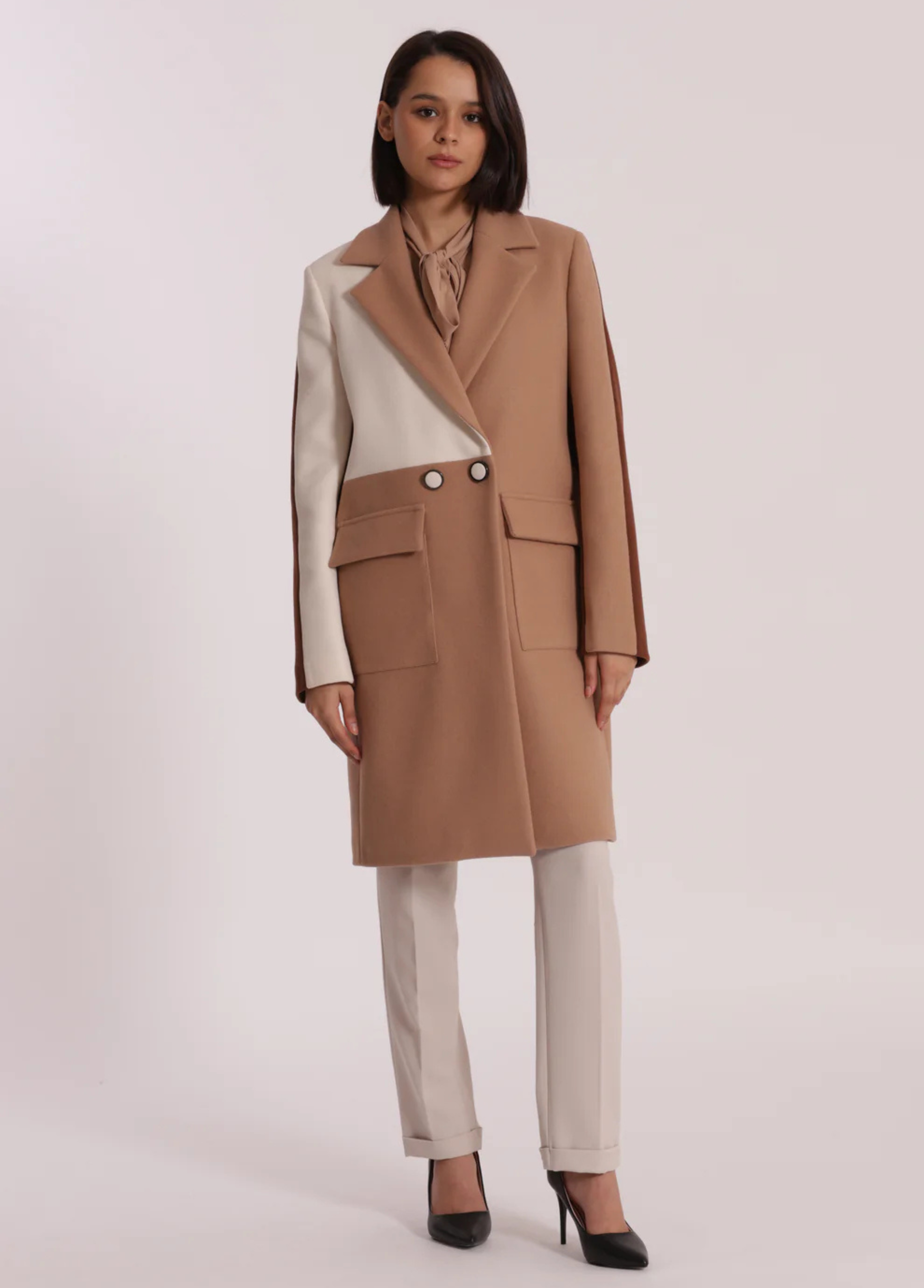 Sobretudo tricolor com botões forrados. Disponível em 2 combinações de tons.
