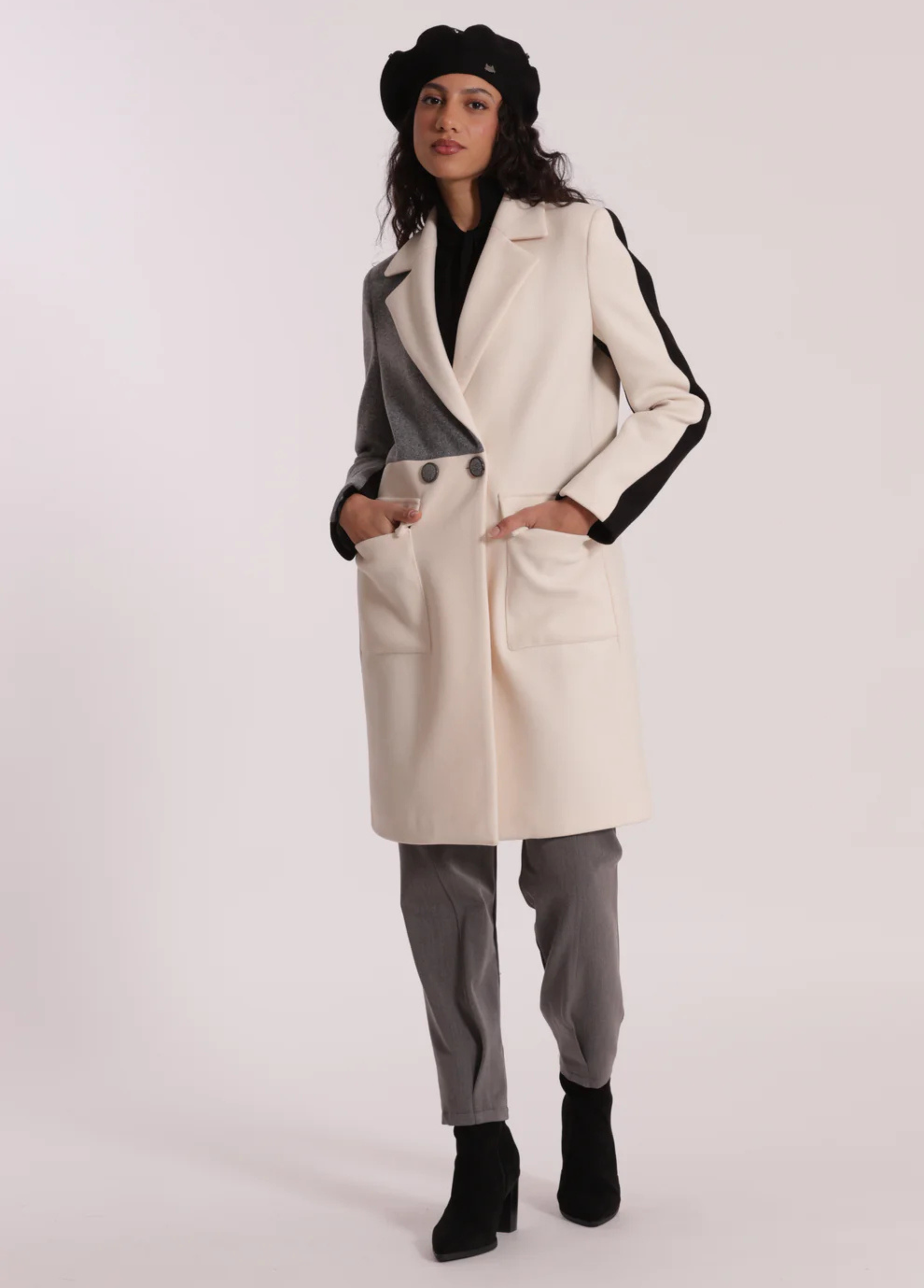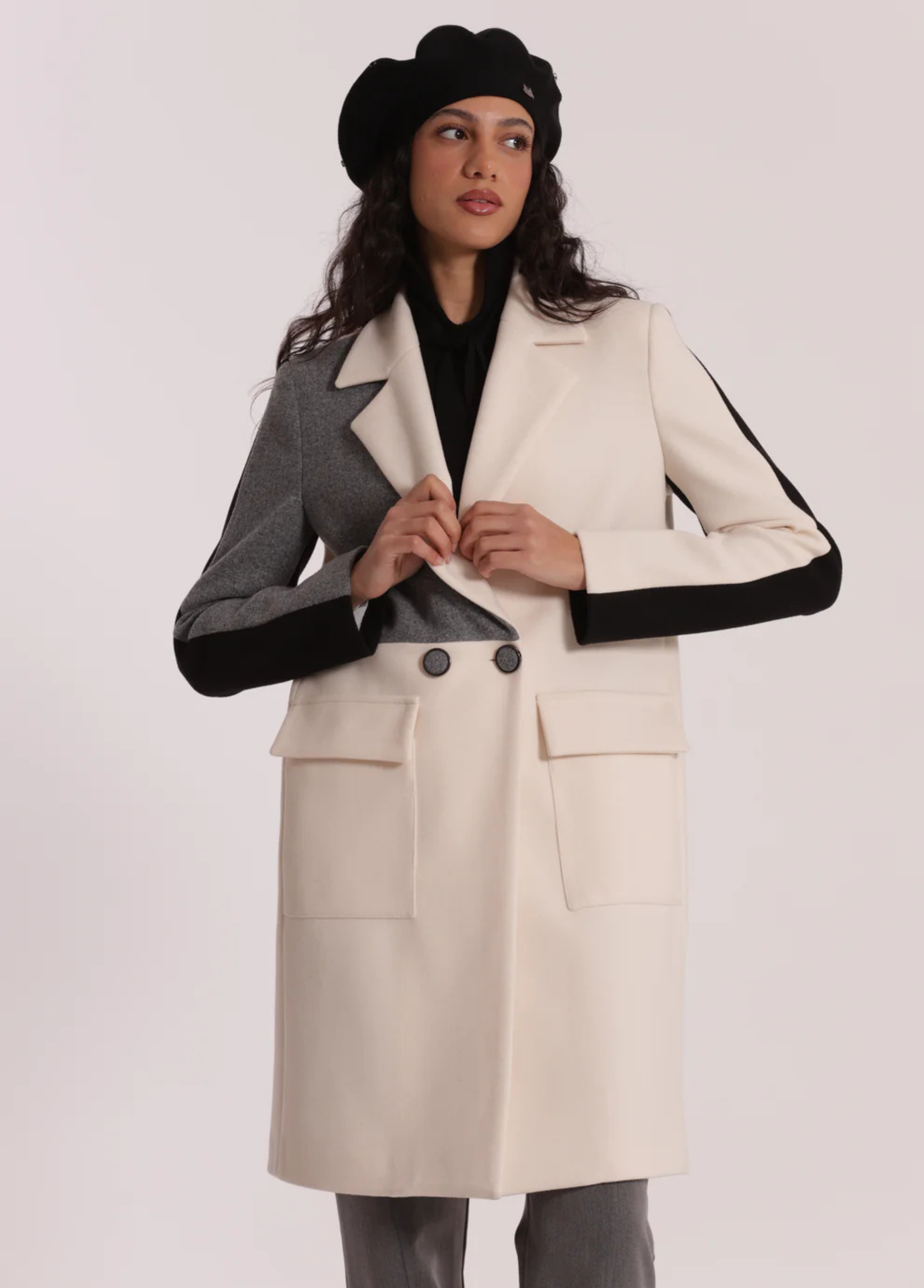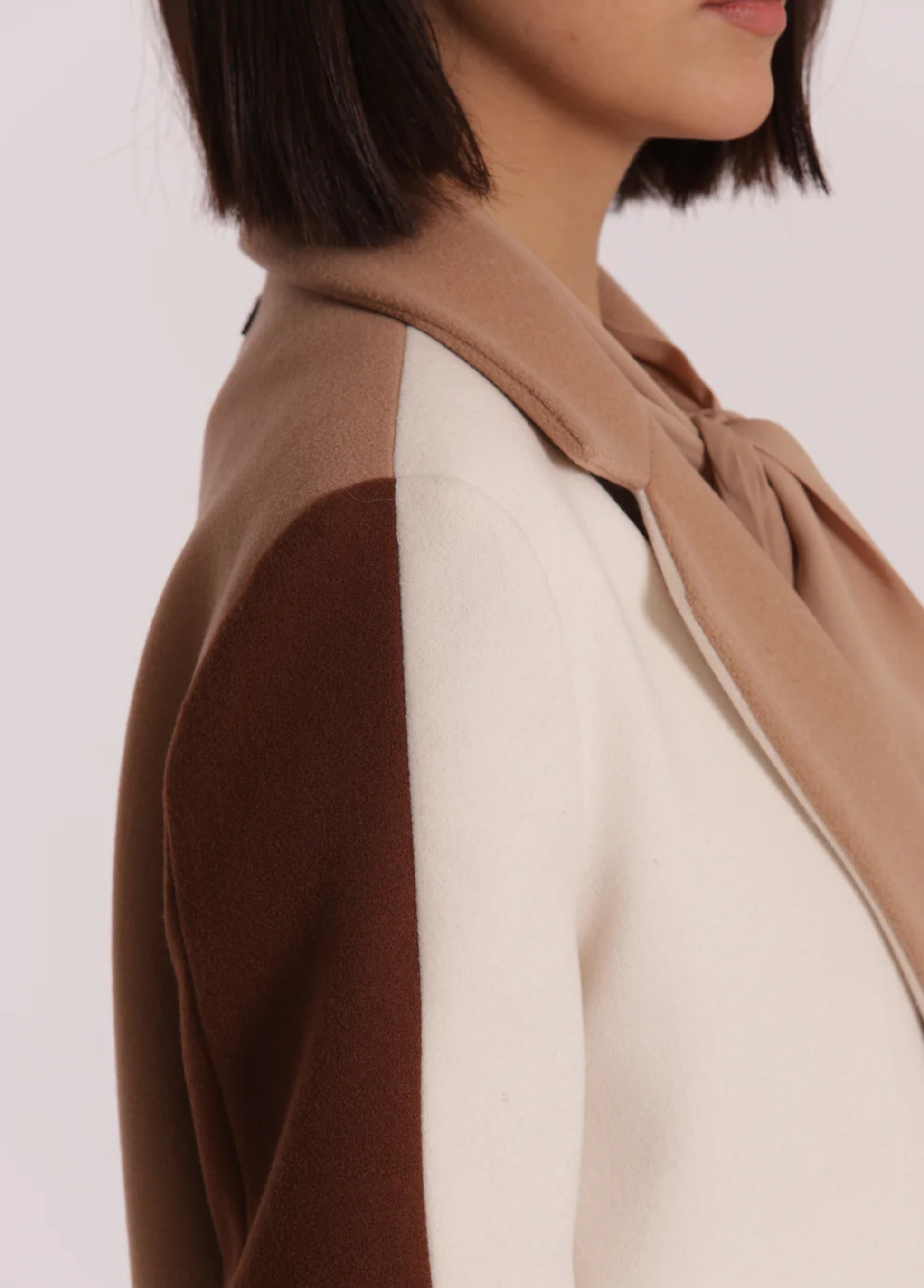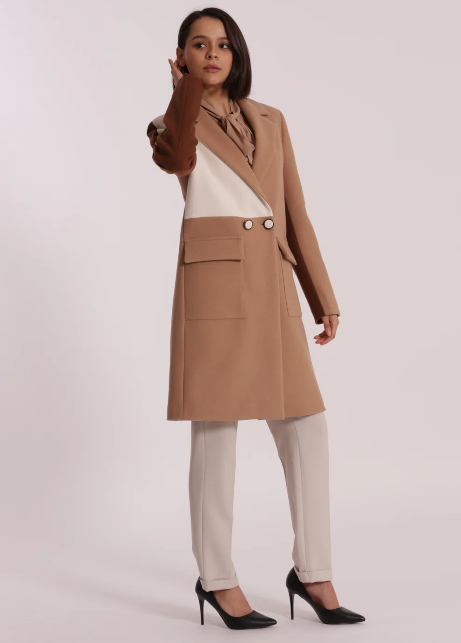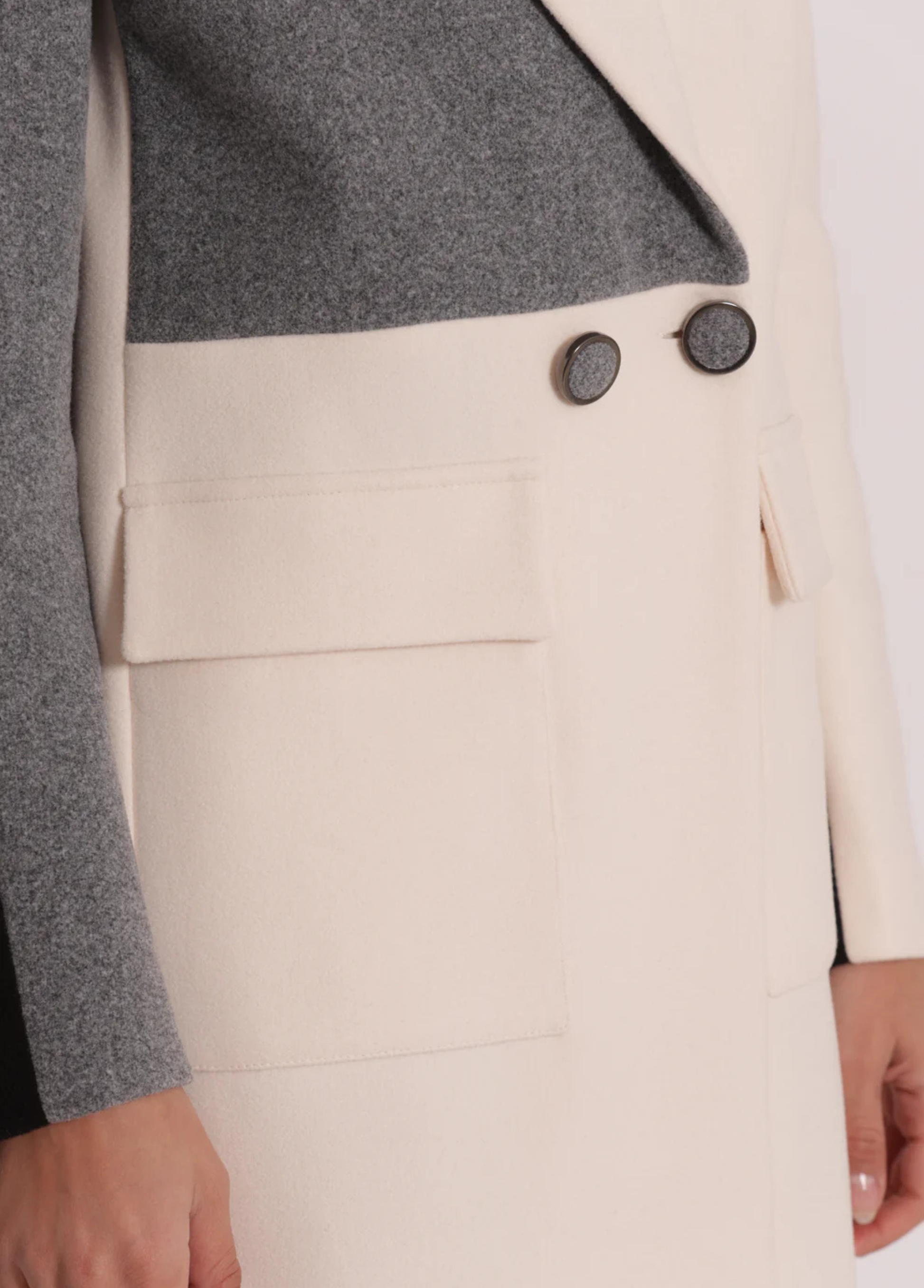 Sobretudo tricolor com botões forrados. Disponível em 2 combinações de tons.
