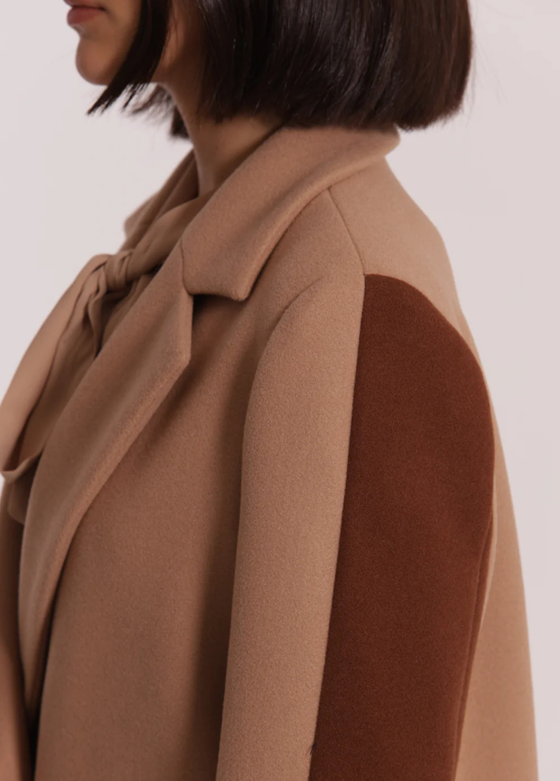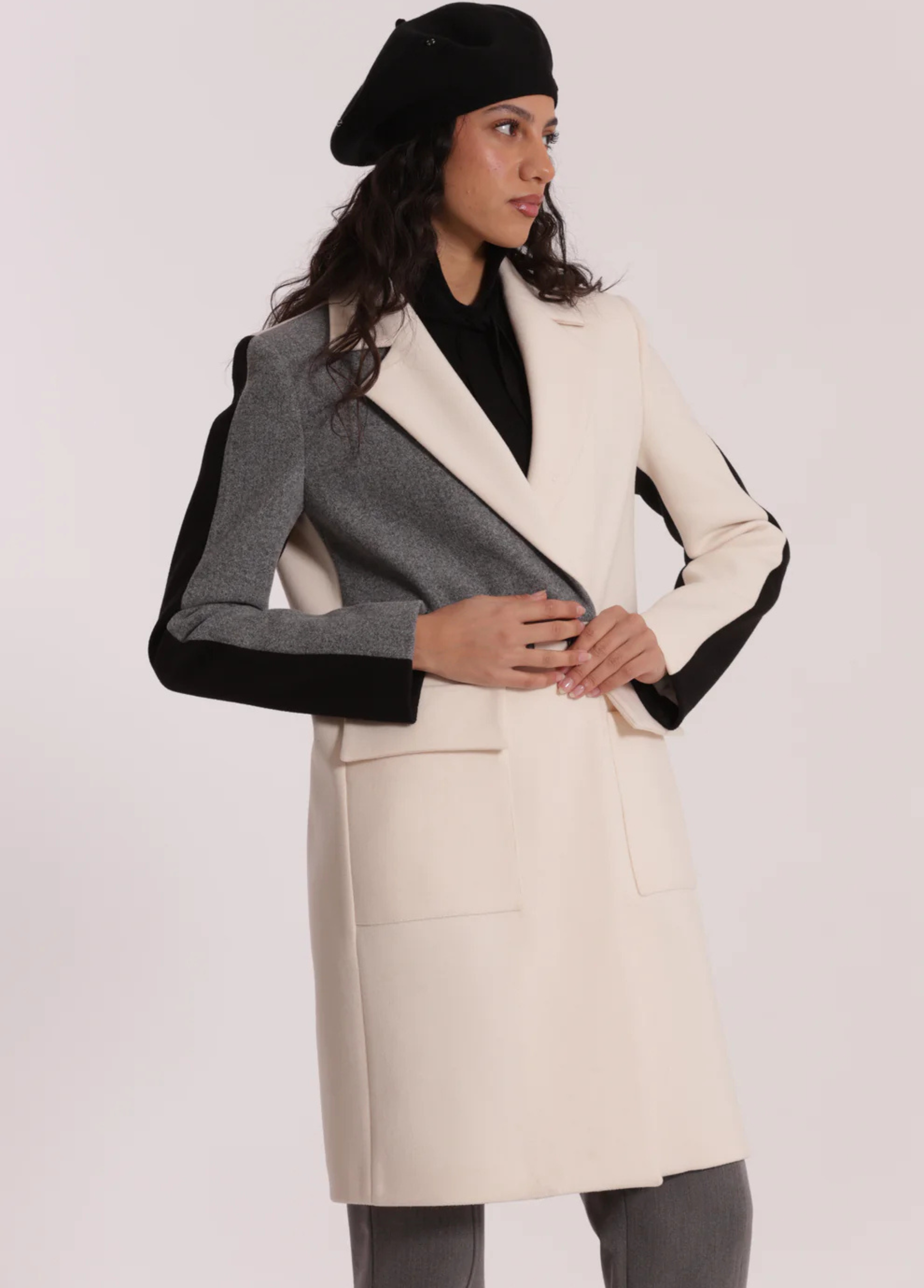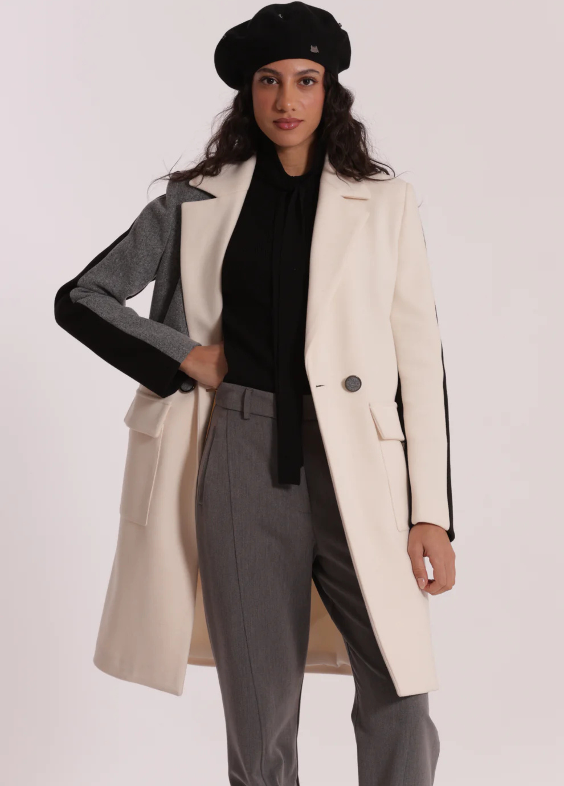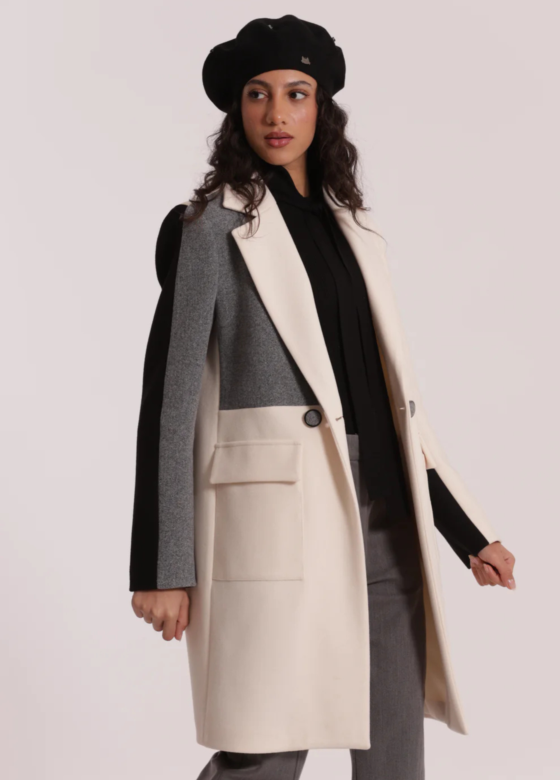 Sobretudo tricolor com botões forrados. Disponível em 2 combinações de tons.