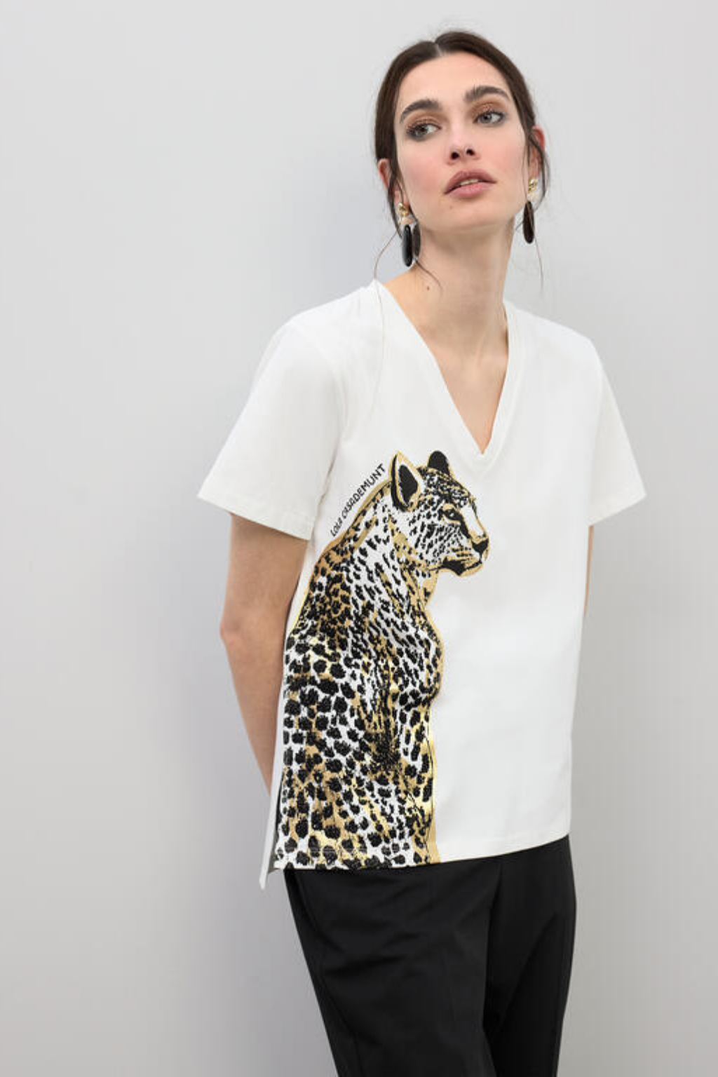 Camiseta de algodão macio com decote em V e estampa animal destacada com detalhes em miçangas. Silhueta relaxada ideal para qualquer ocasião casual com um toque sofisticado.