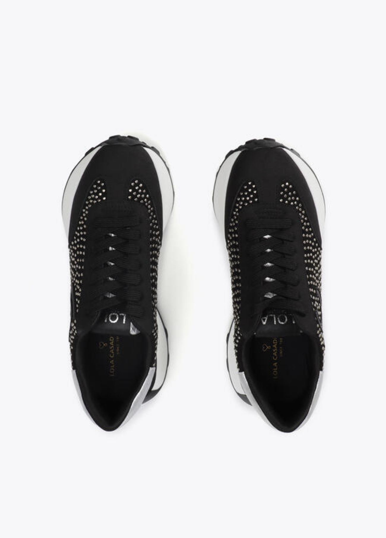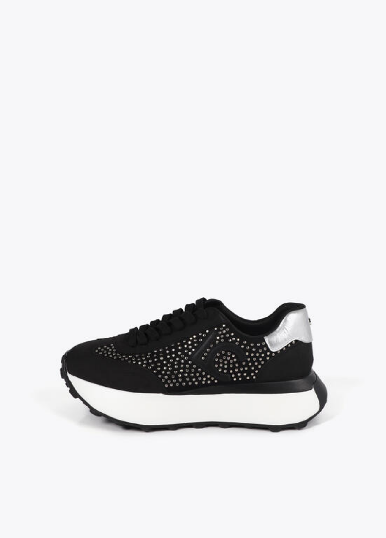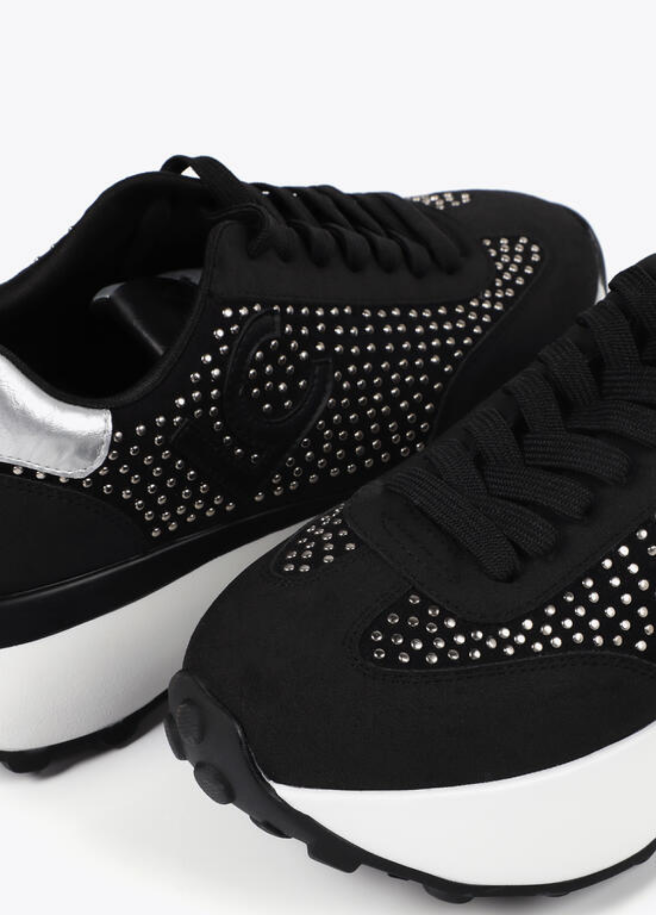 O equilíbrio perfeito entre conforto e sofisticação. Estes ténis pretos com aplicações brilhantes e detalhe prateado no calcanhar elevam qualquer look casual. Com sola alta, proporcionam leveza e estilo sem esforço. Um toque urbano com brilho discreto – ideais para quem gosta de estar confortável, mas sempre elegante.