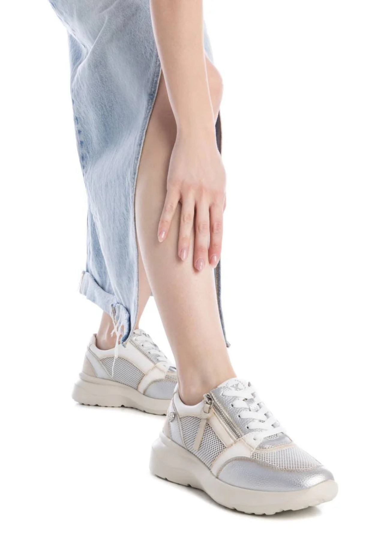 Tênis feminino, da marca Xti. Fabricado numa combinação de material que imita couro com tecido. Fechamento em renda. Sola de borracha antiderrapante. Com palmilha removível.