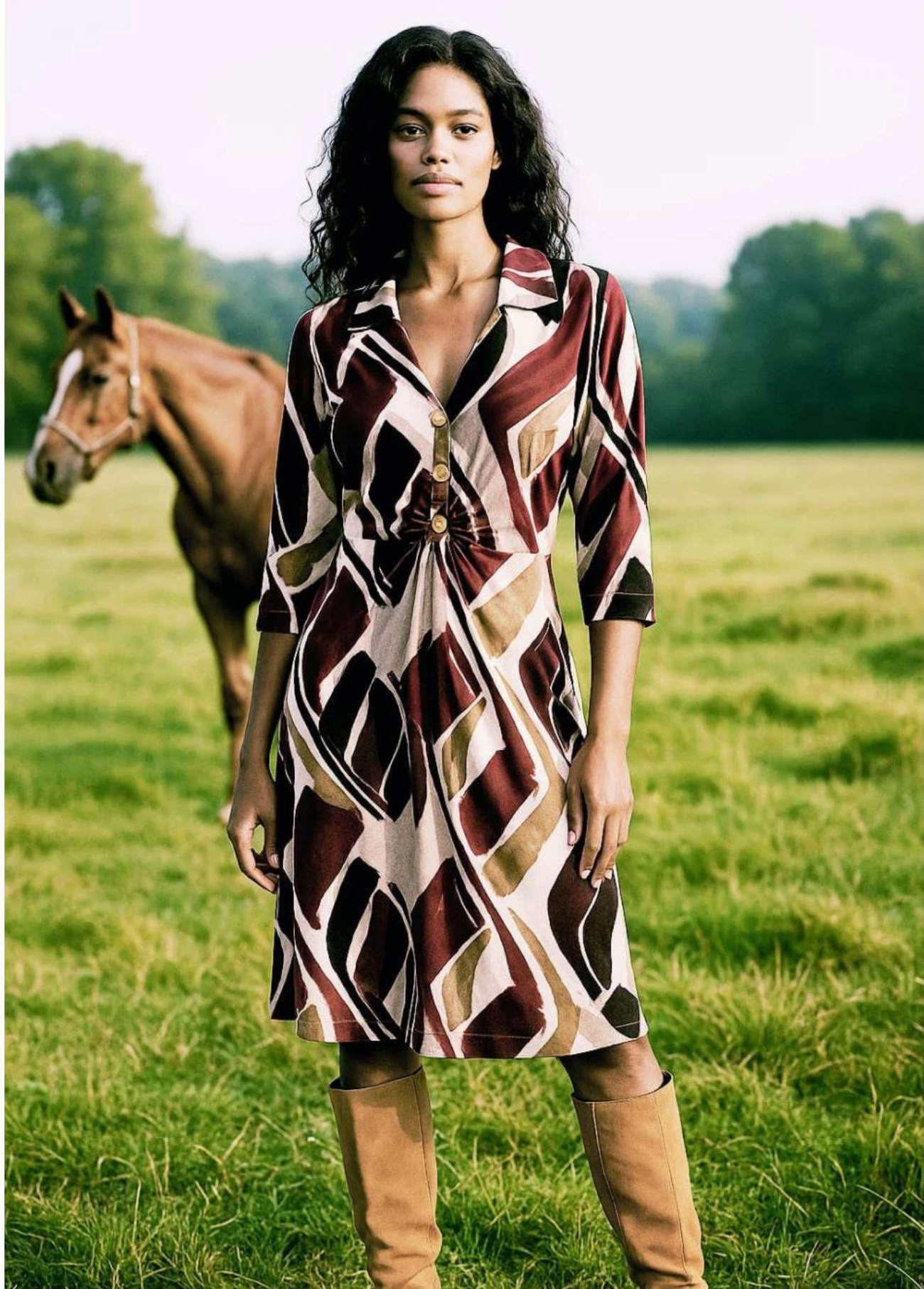 Vestido camiseiro elegante com estampado geométrico em tons terra, decote em V com botões e detalhe franzido na frente que valoriza a silhueta. Confortável e versátil, é perfeito para usar com botas ou sandálias, adaptando-se a ocasiões casuais ou mais sofisticadas.