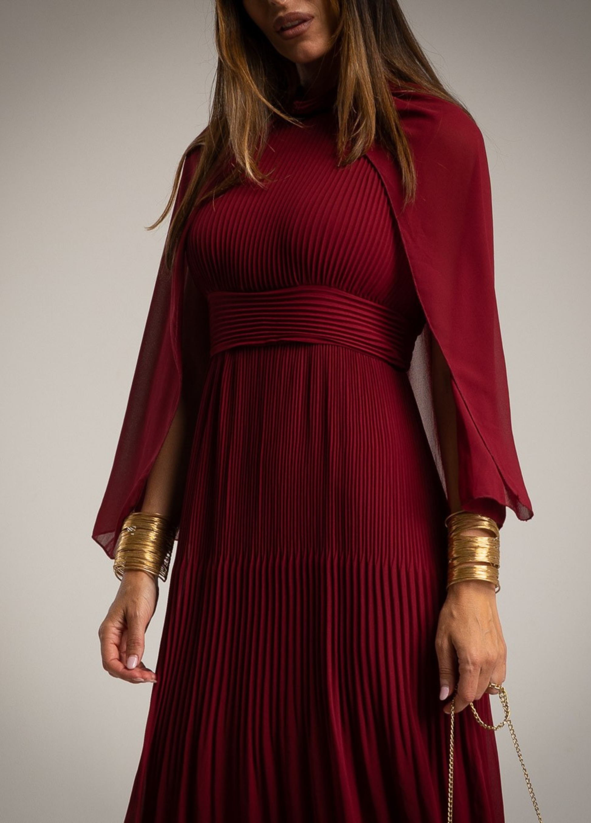 Este vestido midi plissado em tom chocolate ou vermelho sangue-de-boi apresenta um design elegante e sofisticado. O detalhe da capa fluida em chiffon sobre os ombros confere movimento e leveza ao look, enquanto a cintura marcada valoriza a silhueta. Ideal para eventos especiais, combina glamour e conforto com um toque de exclusividade.