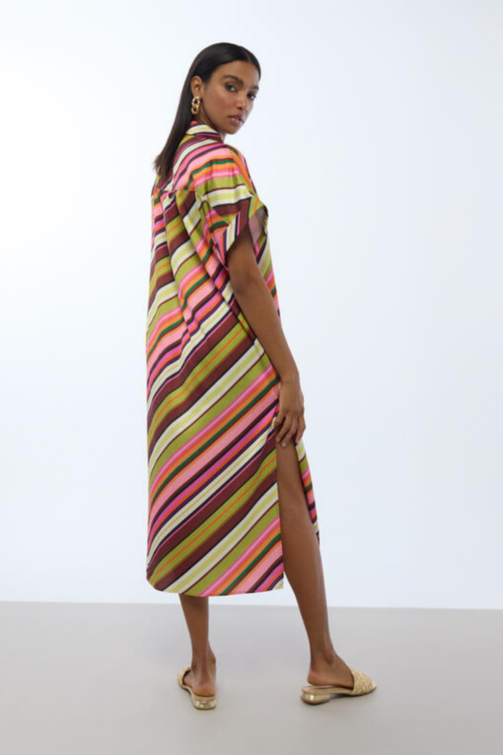 Vestido midi fluido com estampado às riscas multicolor, mangas curtas e abertura lateral. Uma peça leve e sofisticada, perfeita para looks de verão cheios de personalidade.